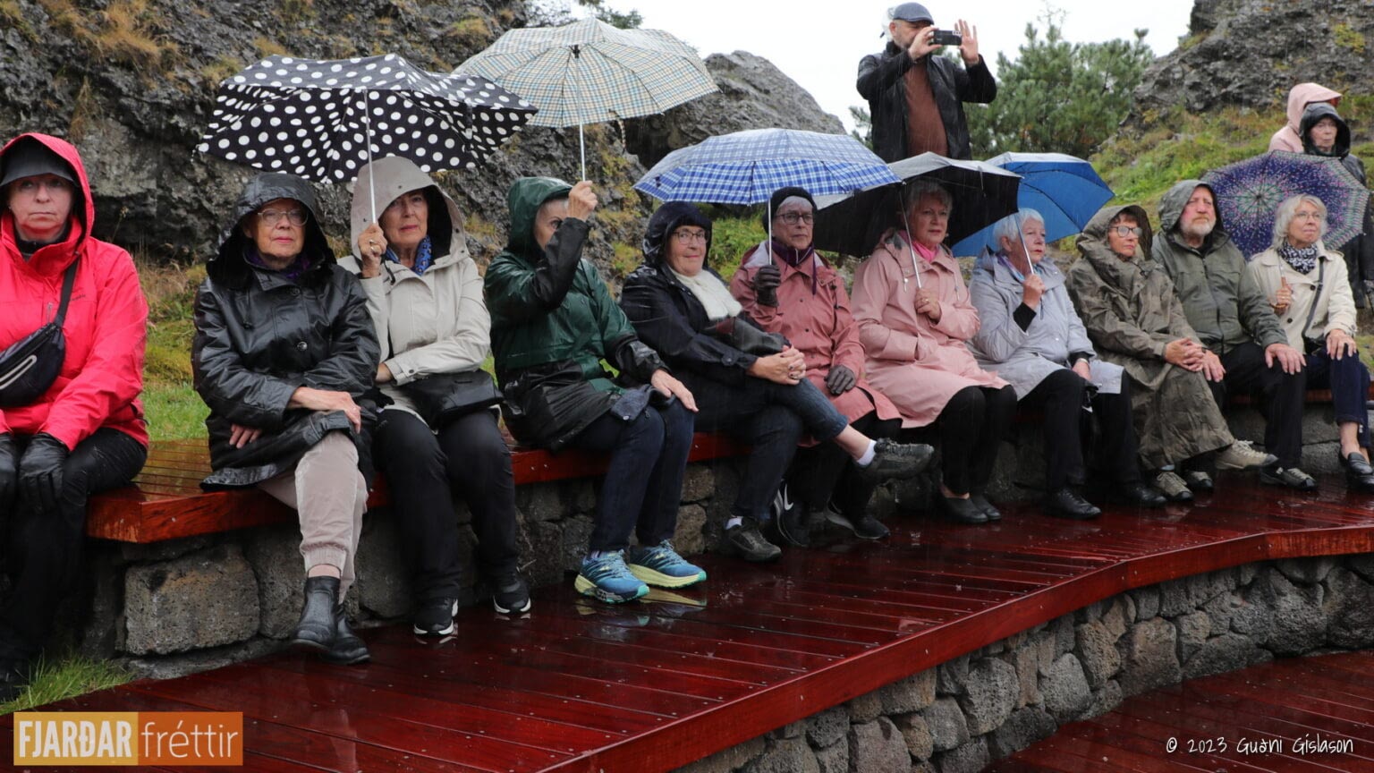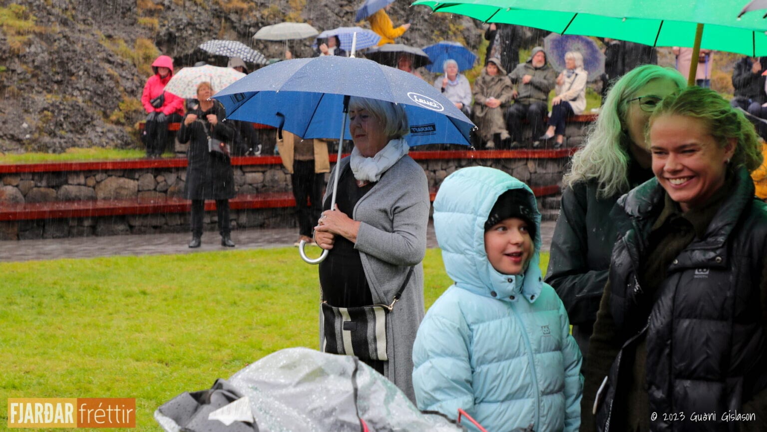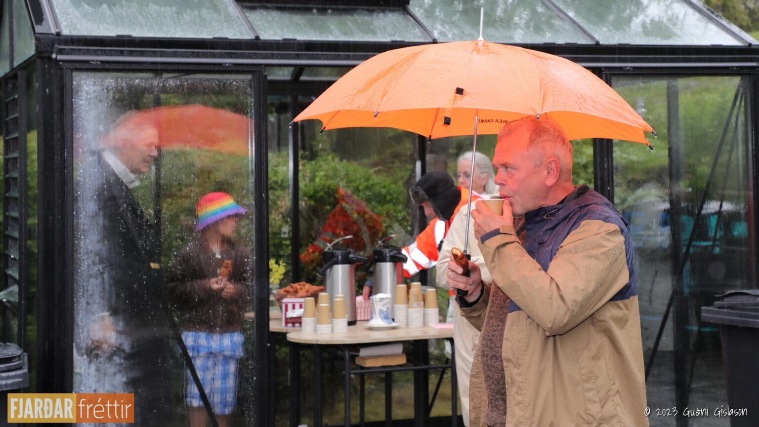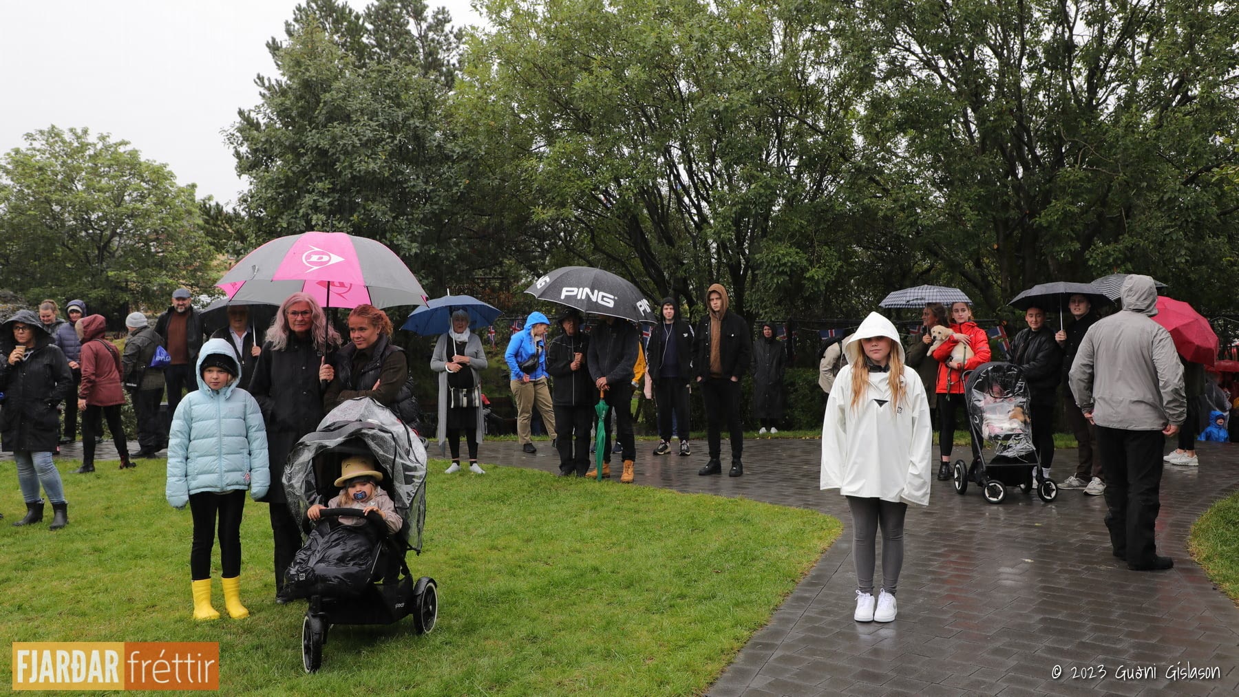 Rigningin jókst eftir sem á leið og sjaldan hafa svo margar regnhlífar sést á lofti í Hellisgerði. En Hafnarfjarðarbær bauð upp á kaffi og kleinur sem var kærkomið.
