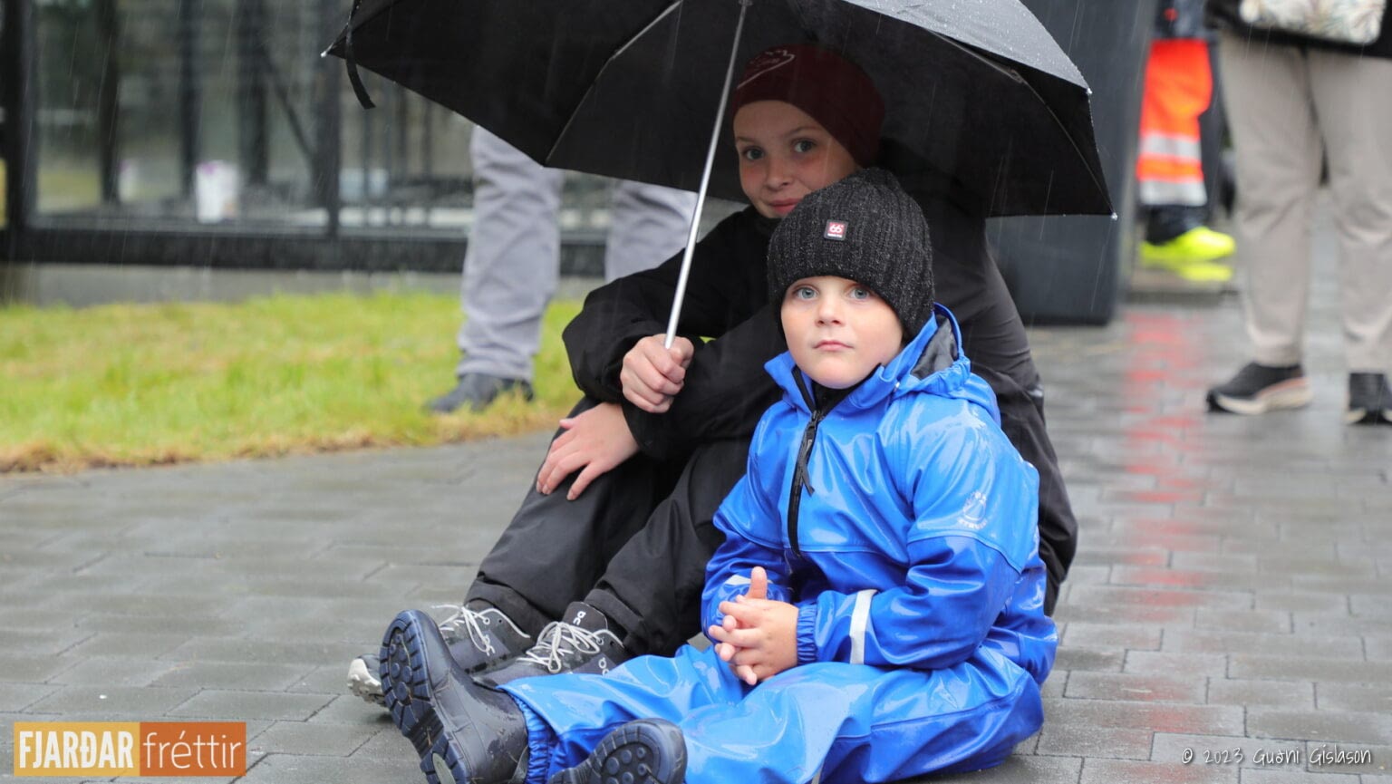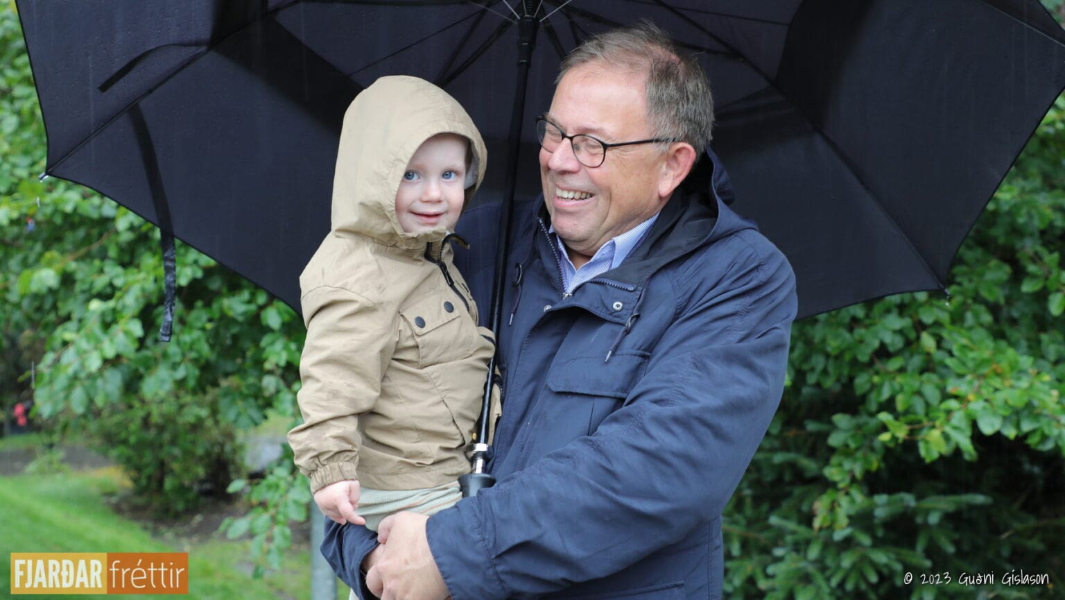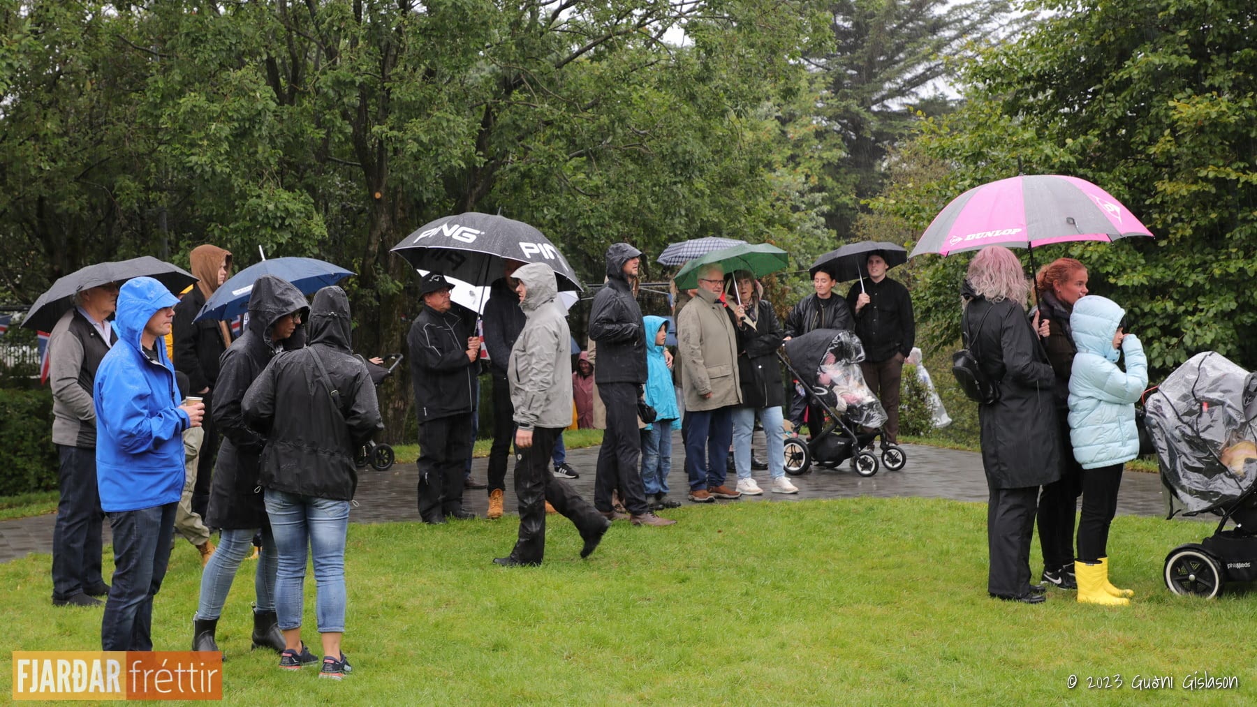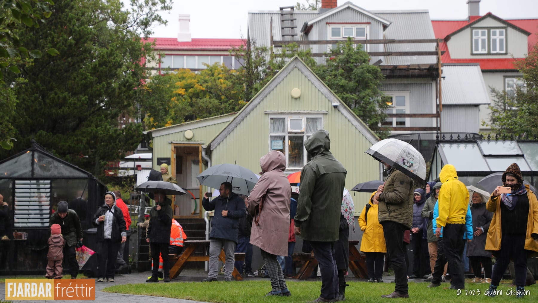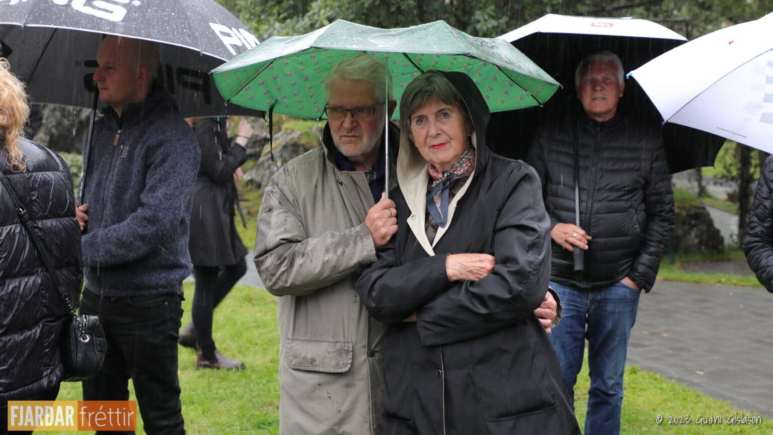 Rigningin jókst eftir sem á leið og sjaldan hafa svo margar regnhlífar sést á lofti í Hellisgerði. En Hafnarfjarðarbær bauð upp á kaffi og kleinur sem var kærkomið.