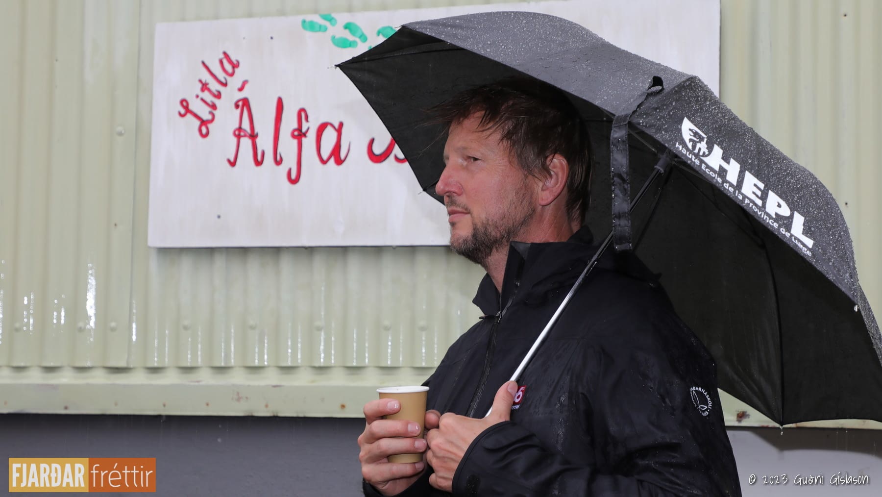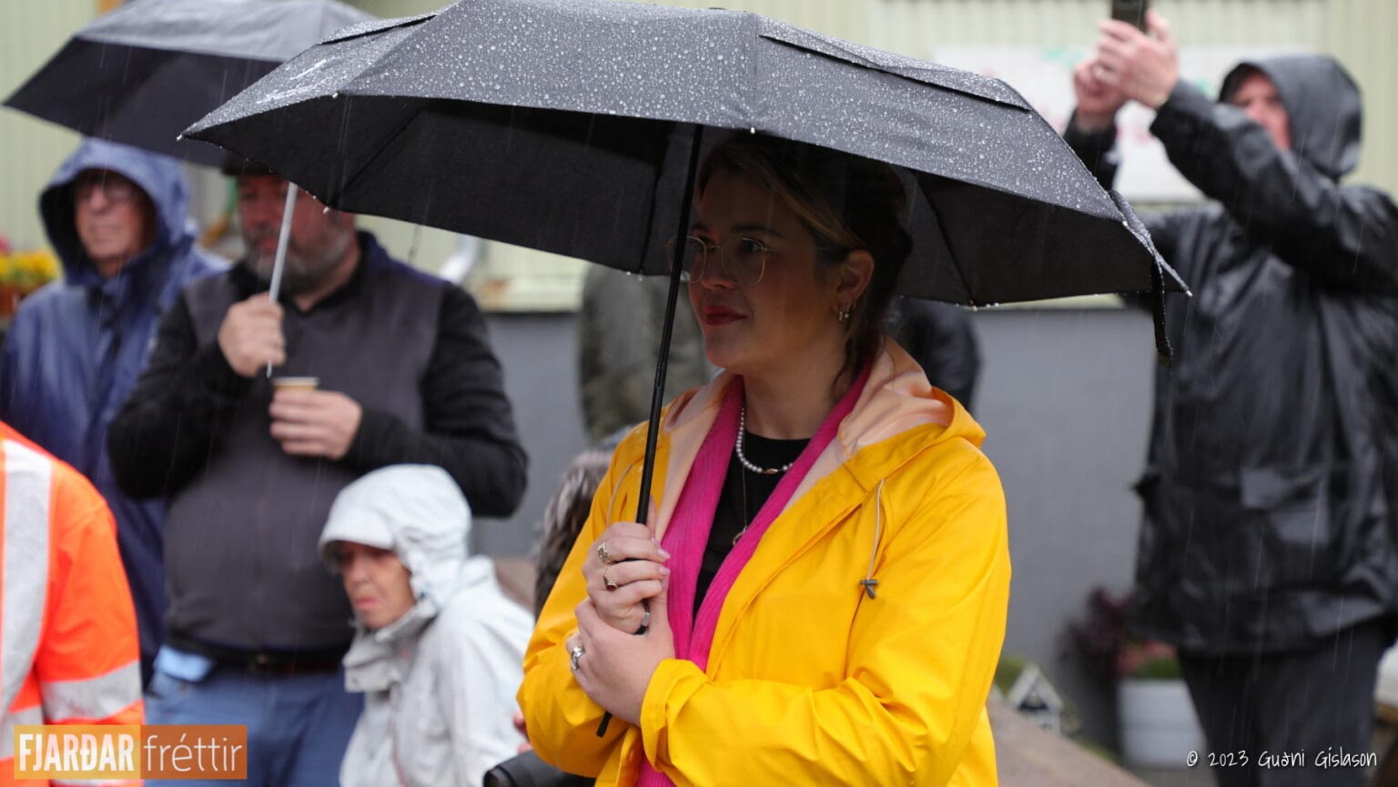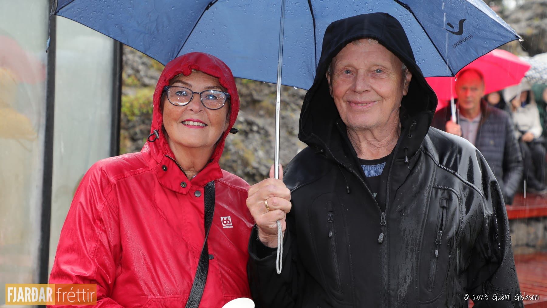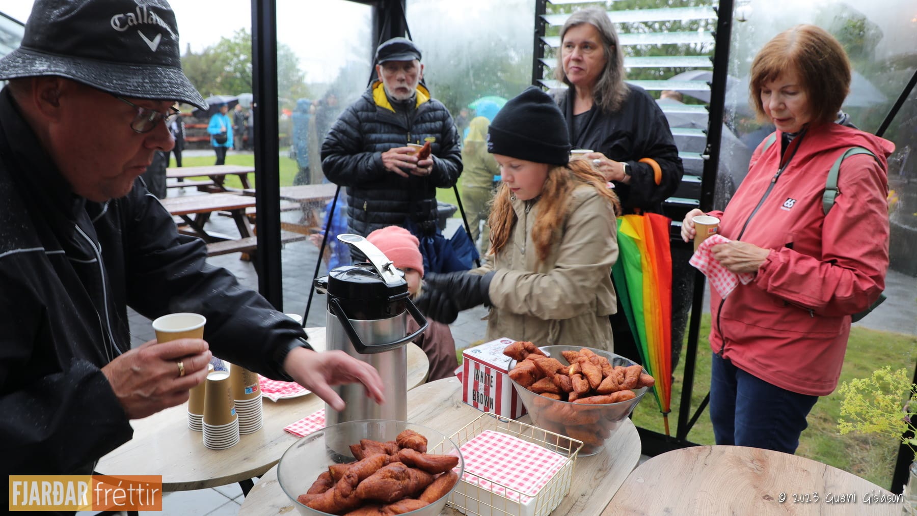 Rigningin jókst eftir sem á leið og sjaldan hafa svo margar regnhlífar sést á lofti í Hellisgerði. En Hafnarfjarðarbær bauð upp á kaffi og kleinur sem var kærkomið.