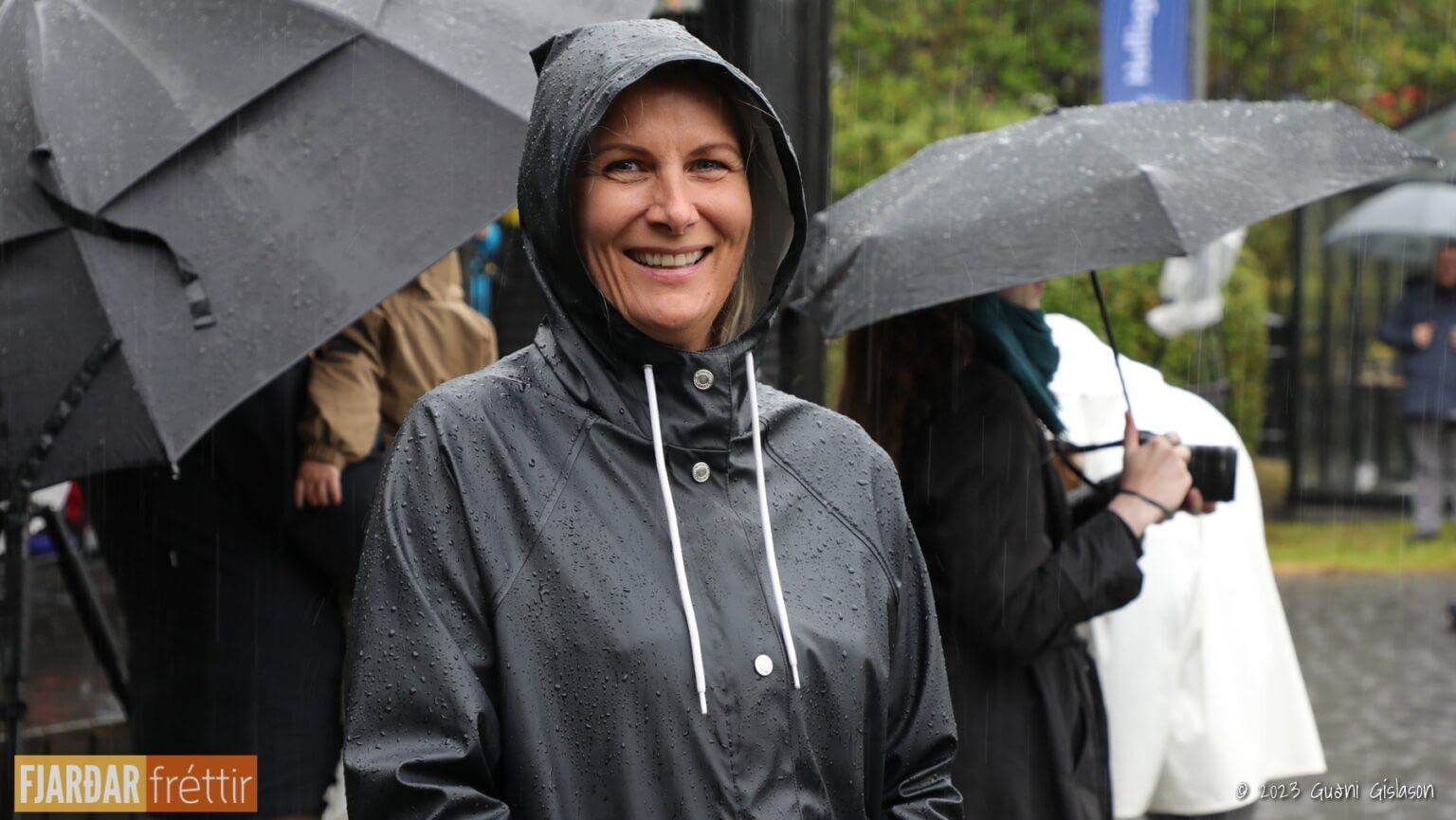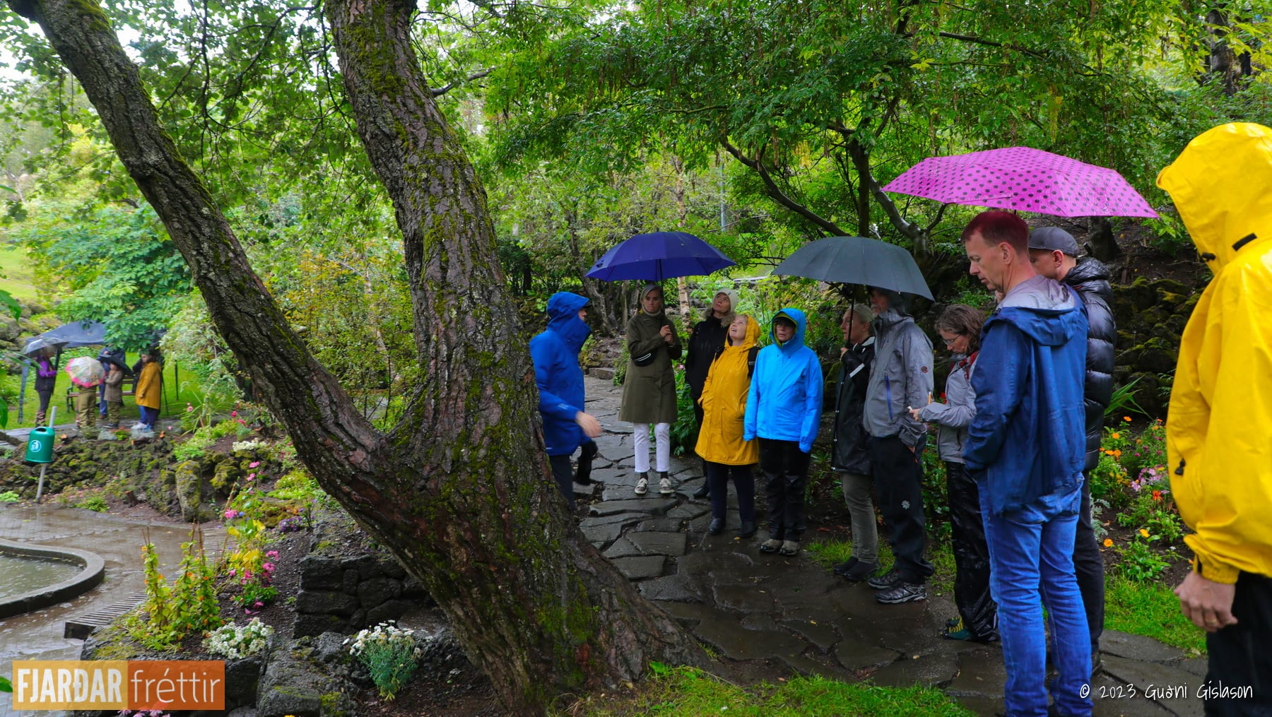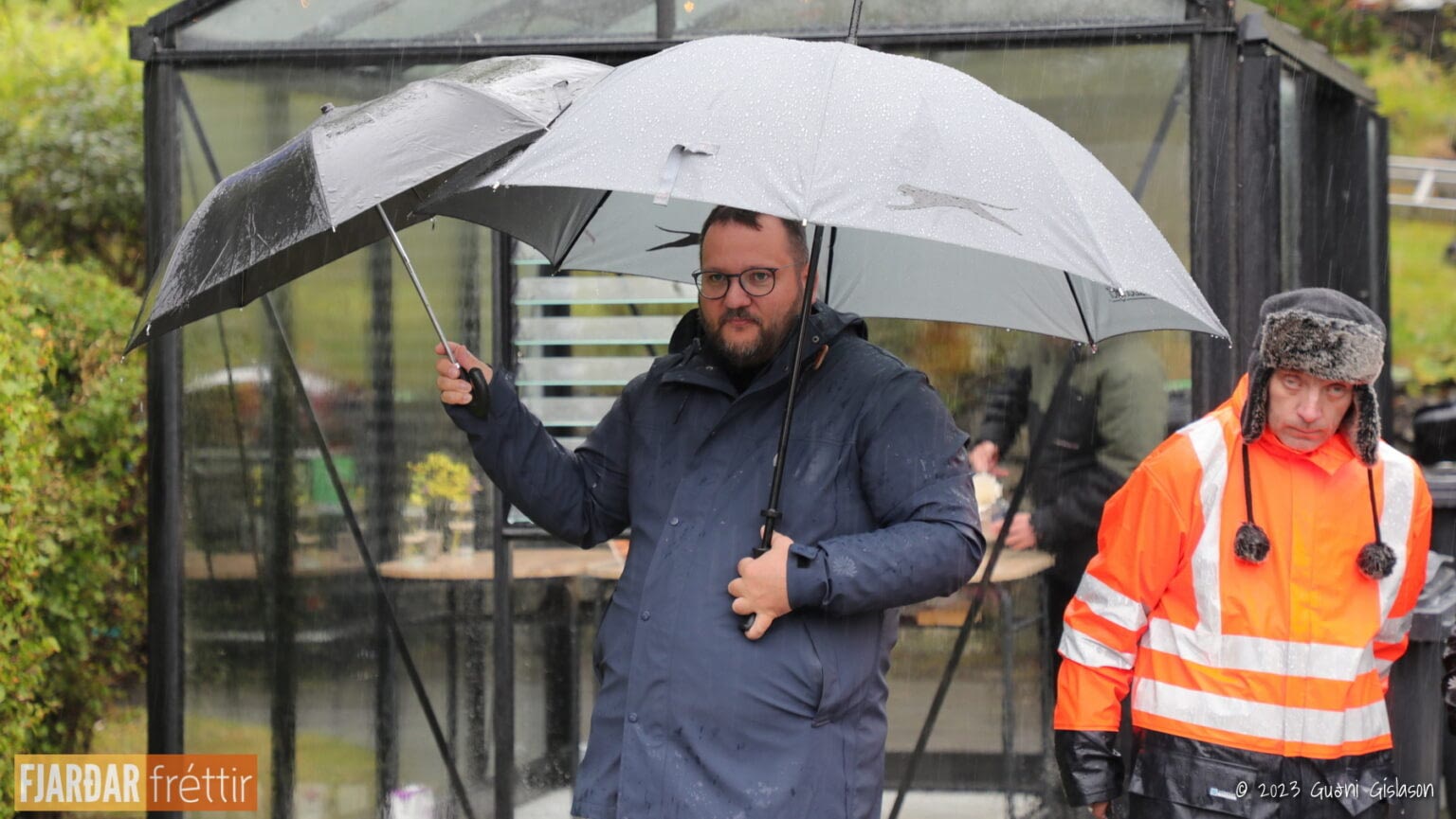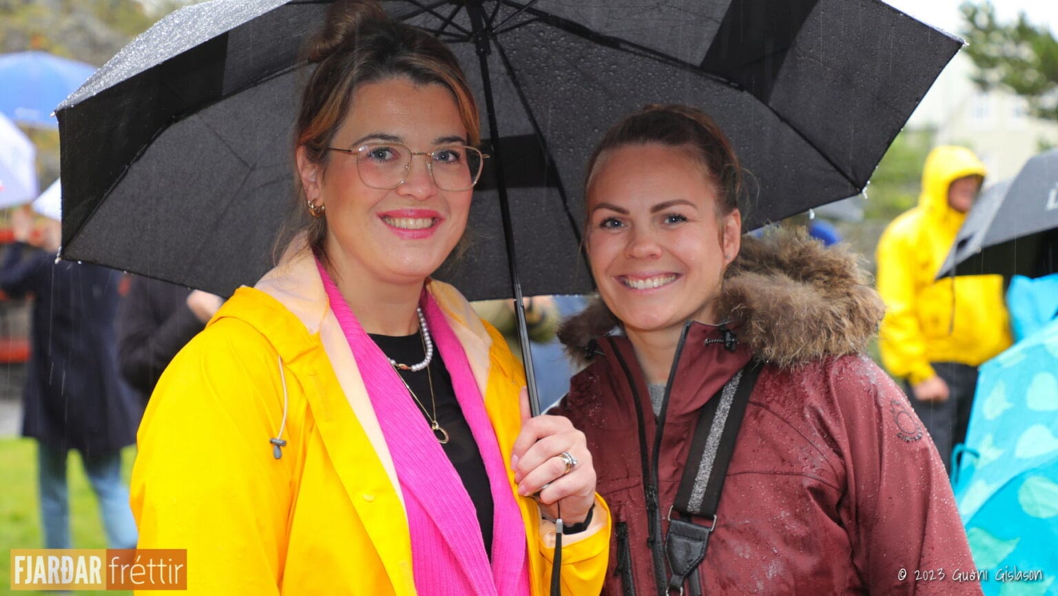 Rigningin jókst eftir sem á leið og sjaldan hafa svo margar regnhlífar sést á lofti í Hellisgerði. En Hafnarfjarðarbær bauð upp á kaffi og kleinur sem var kærkomið.