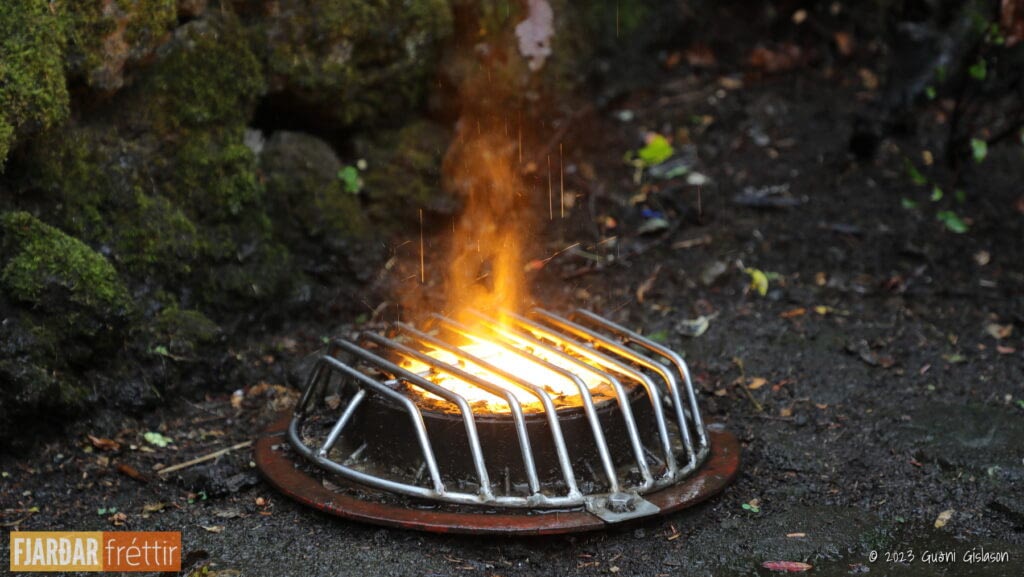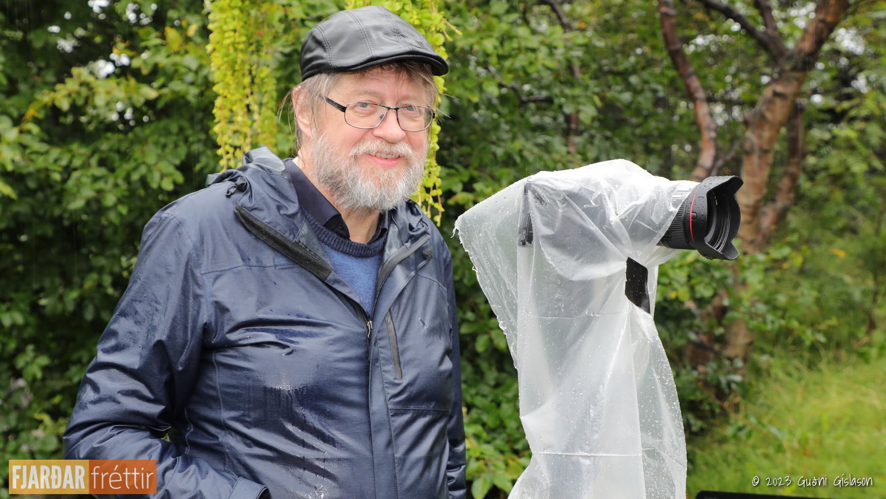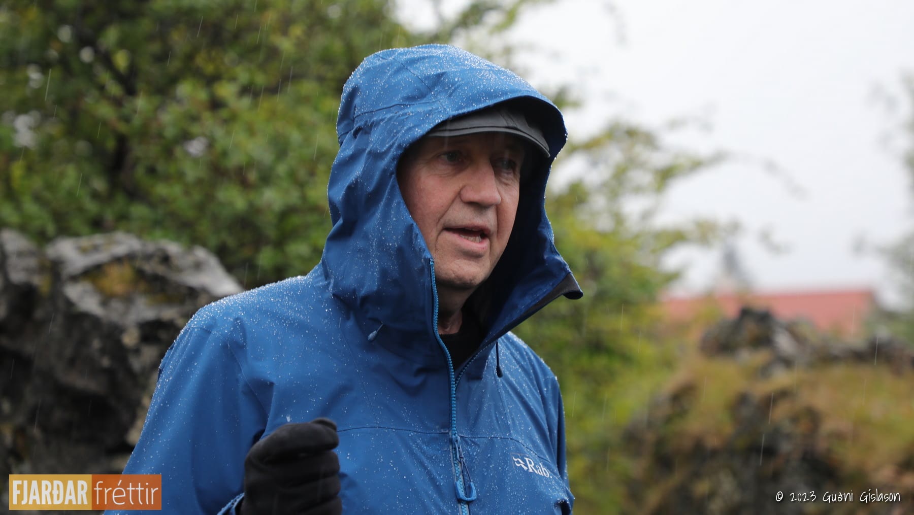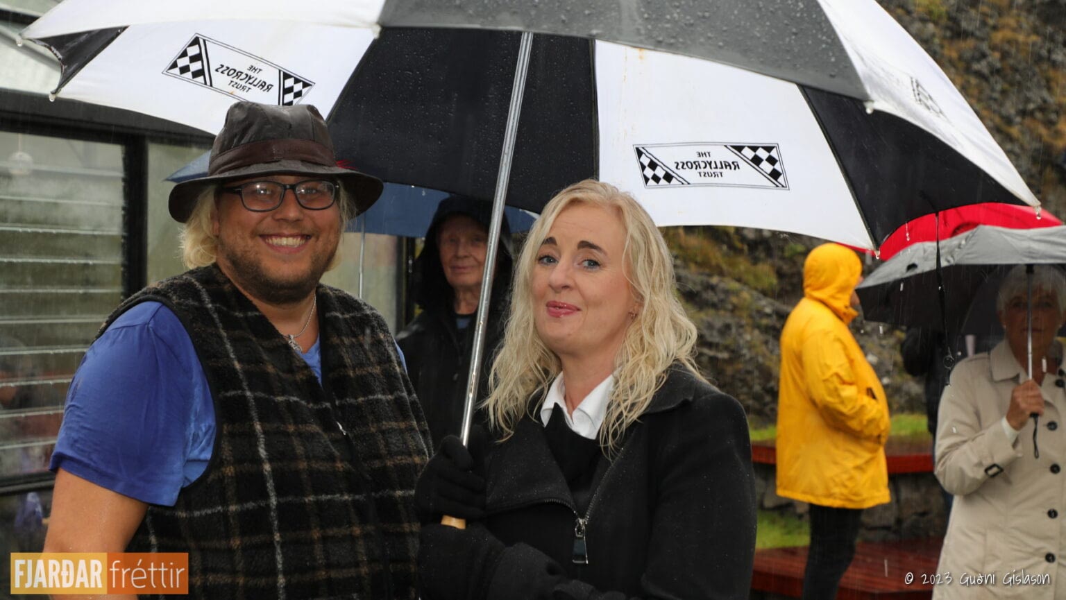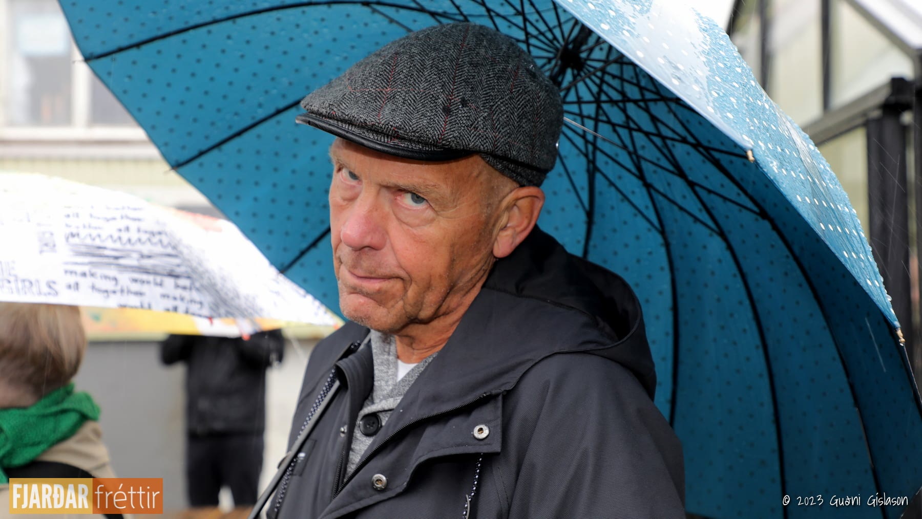 Rigningin jókst eftir sem á leið og sjaldan hafa svo margar regnhlífar sést á lofti í Hellisgerði. En Hafnarfjarðarbær bauð upp á kaffi og kleinur sem var kærkomið.