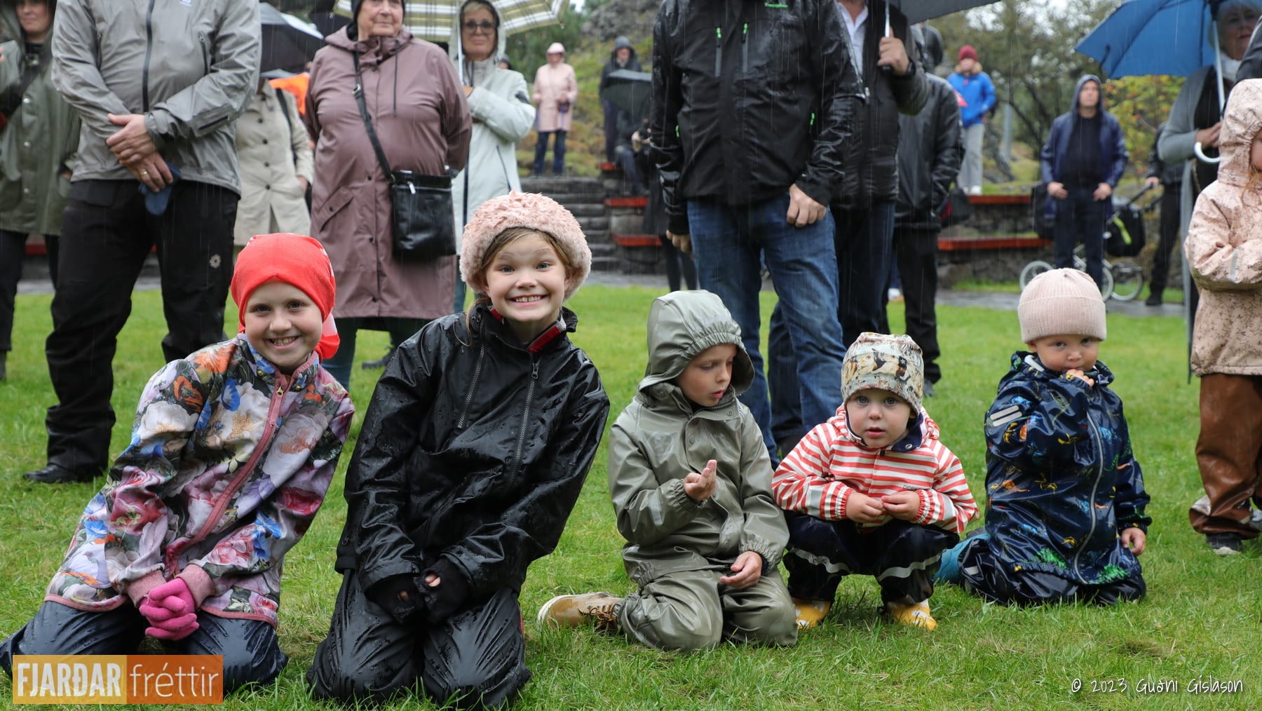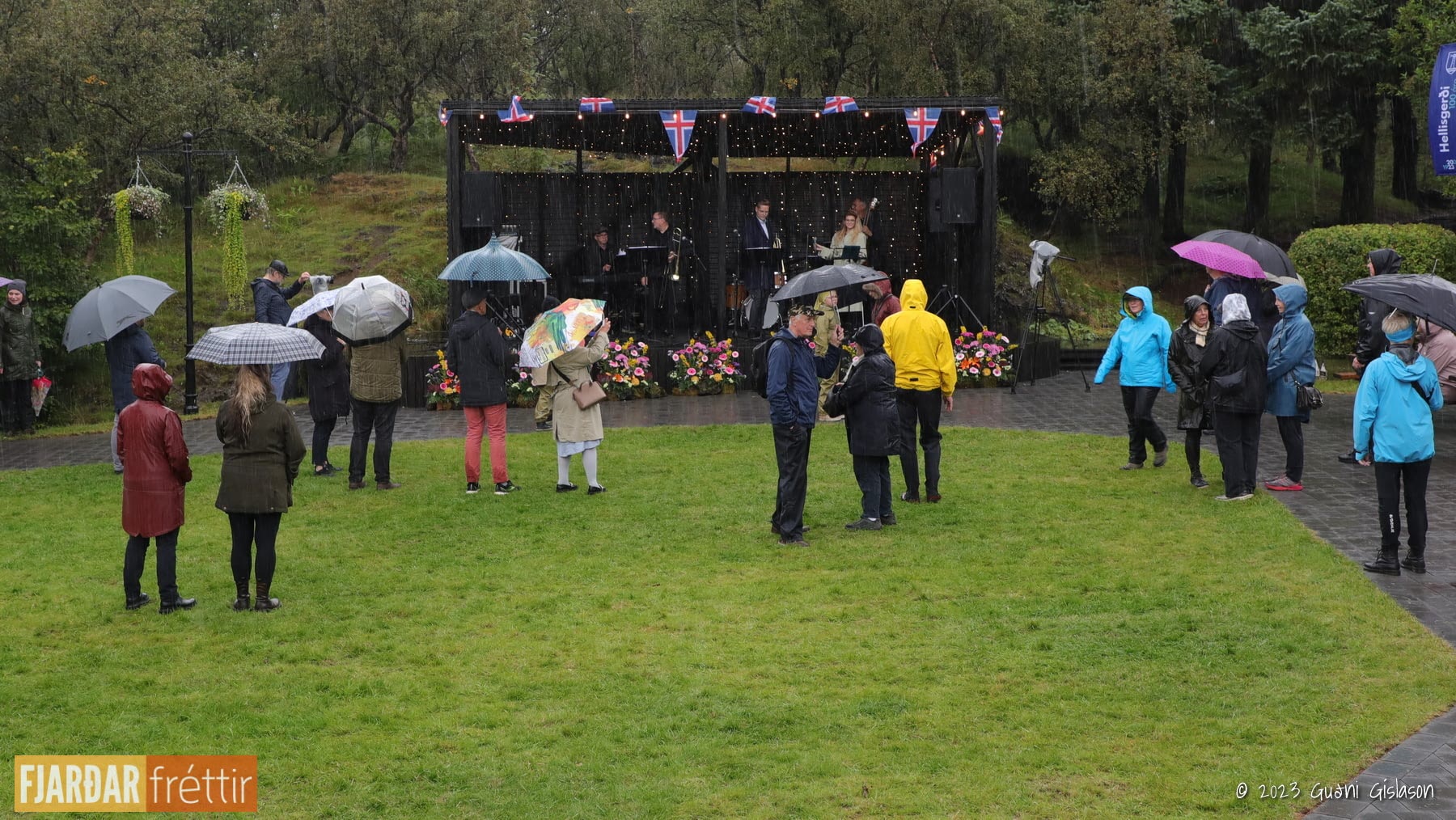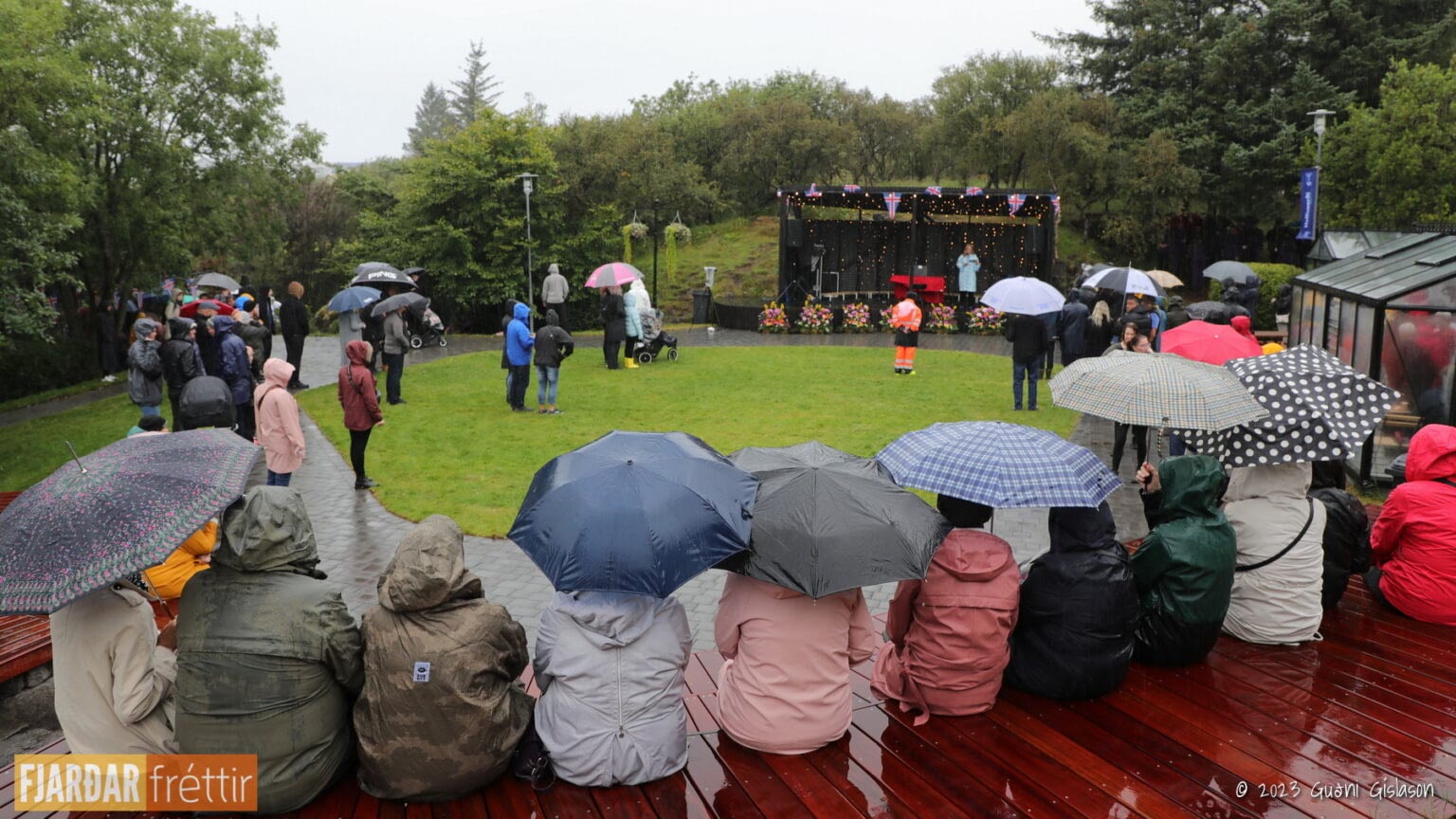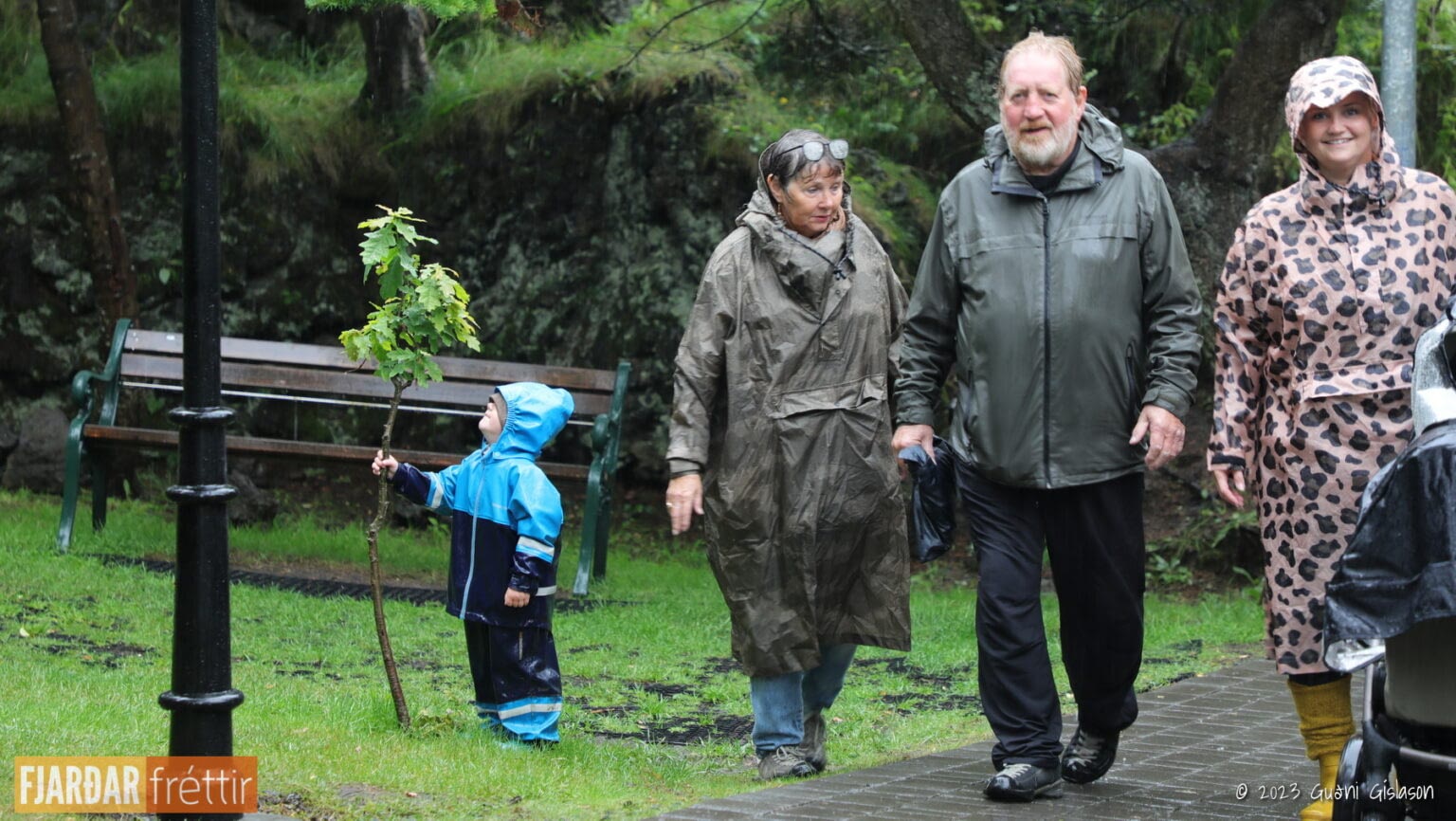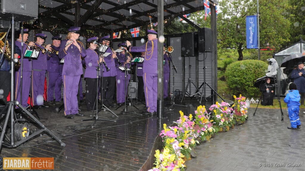 Sl. laugardag var blásið til afmælishátíðar í tilefni af 100 ára afmæli Hellisgerðis og þangað mættu áræðnir og vel klæddir bæjarbúar sem voru viðbúnir rigningu.