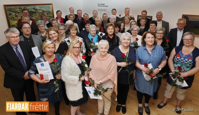 Prúðbúnir bæjarstarfsmenn mættu í móttöku bæjarstjóra í Hafnarborg í gær en tilefnið var að afhenta afhenda öllum starfsmönnum sem unnið hafa í 25 ár og lengur hjá Hafnarfjarðarbæ viðurkenningu.