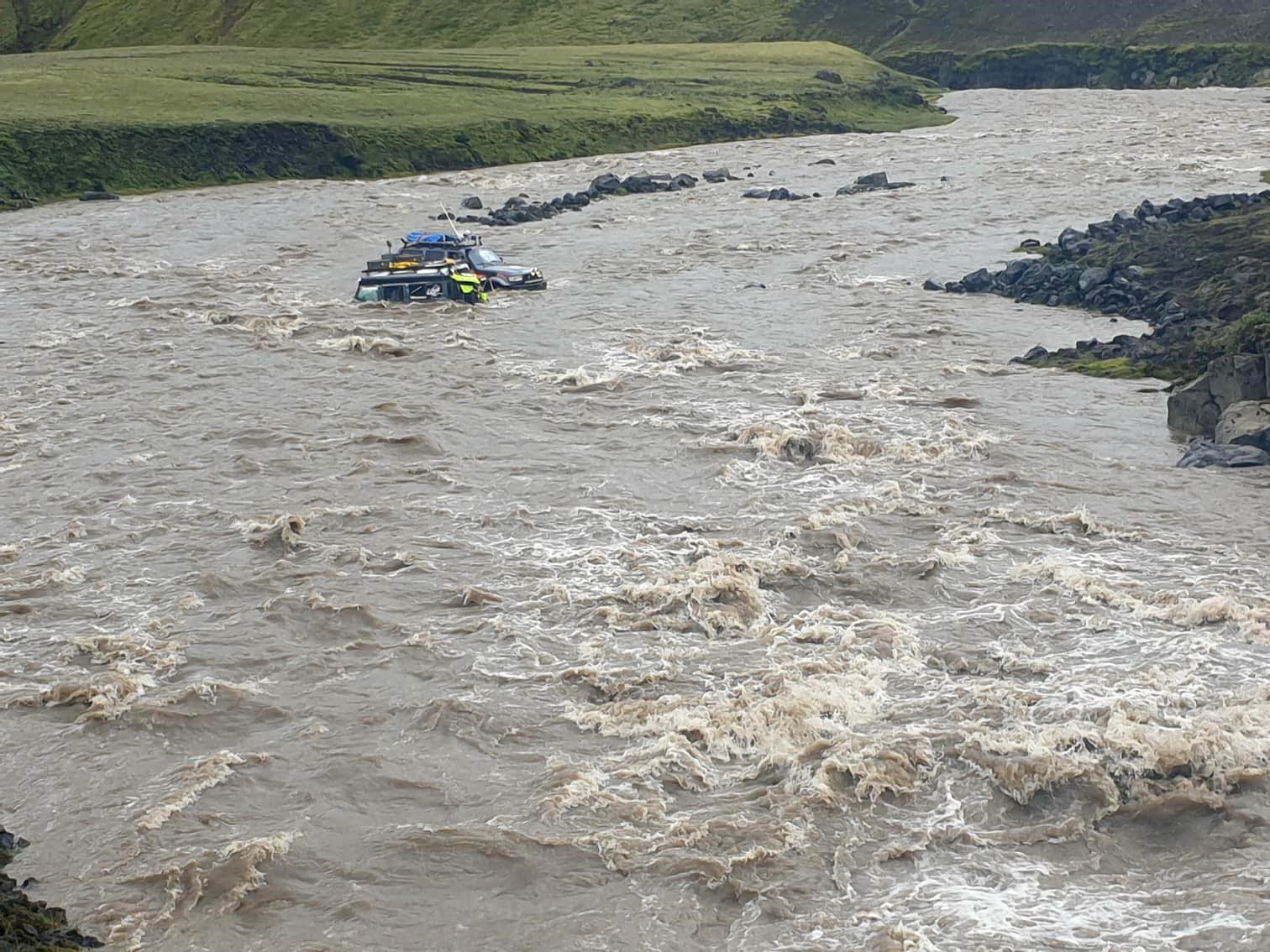 Hafði hann fest bíl sinn í ánni og þurft að koma sér upp á þak því vatn flæddi inn í bílinn. Var hann búinn að vera á þaki bílsins í um tvær klukkustundir þegar björgunarmenn komu að.