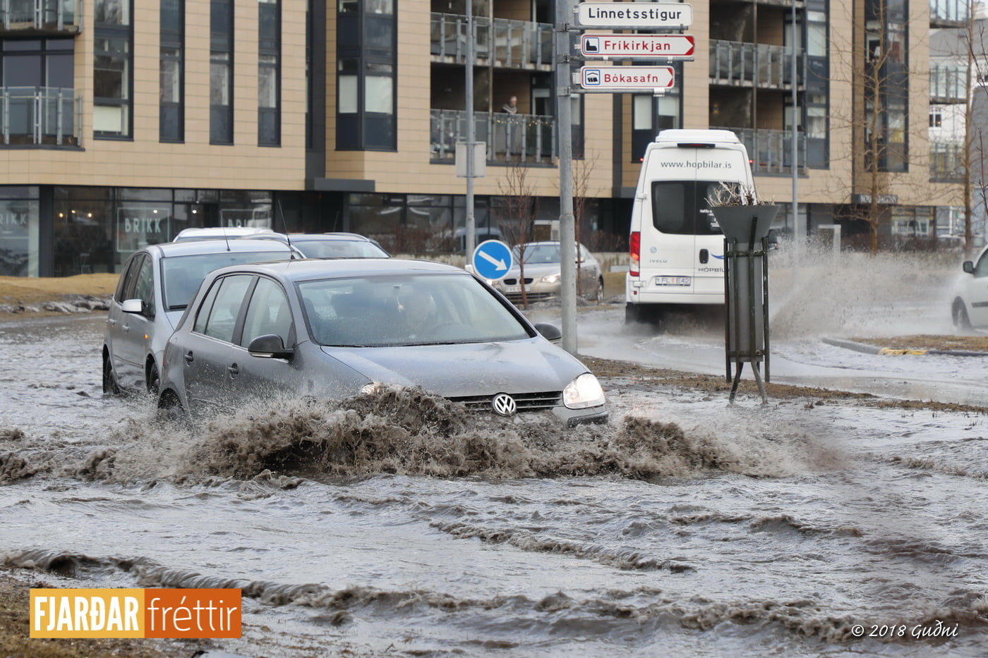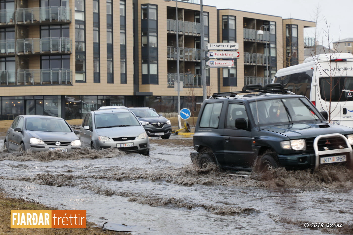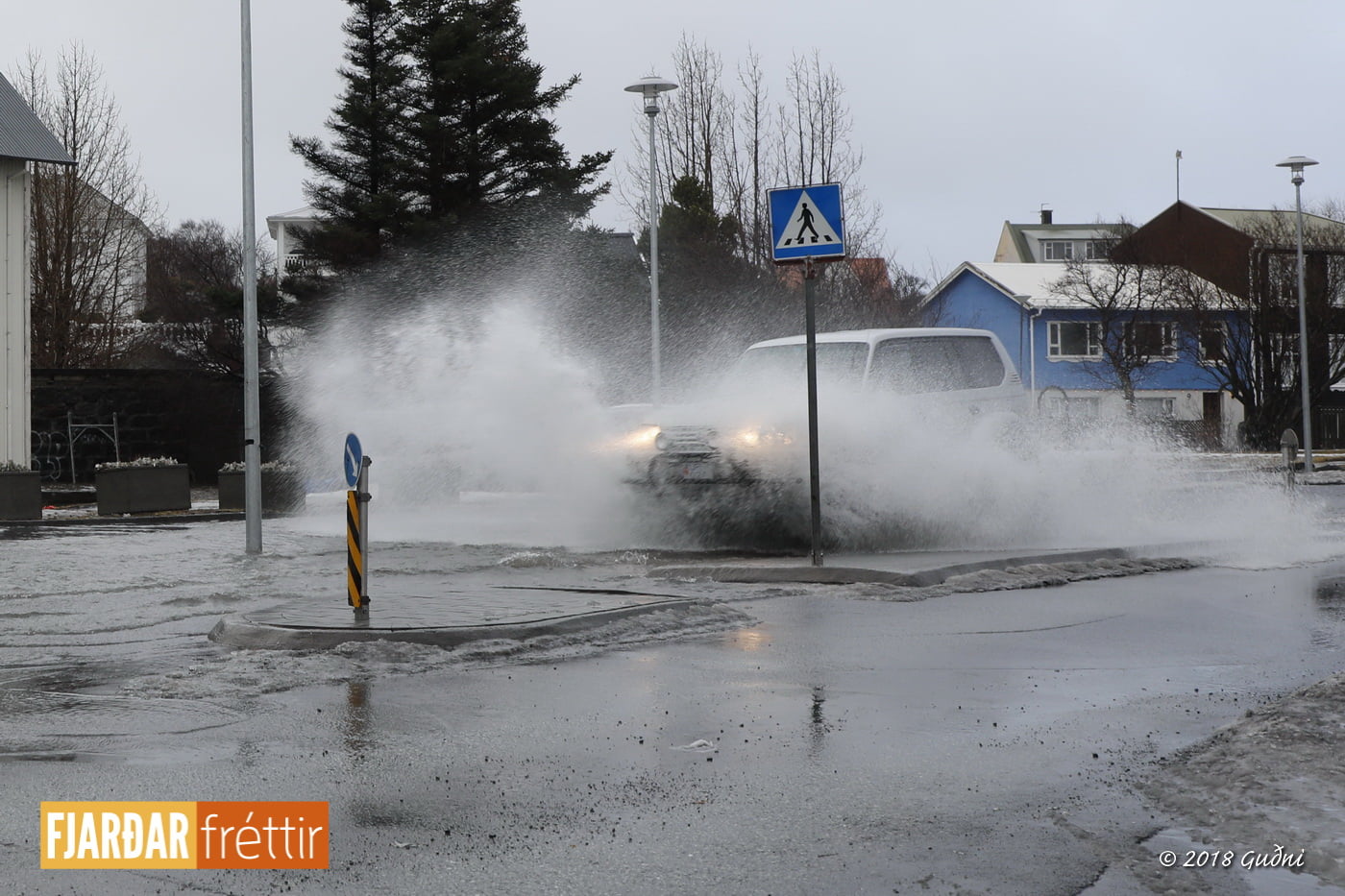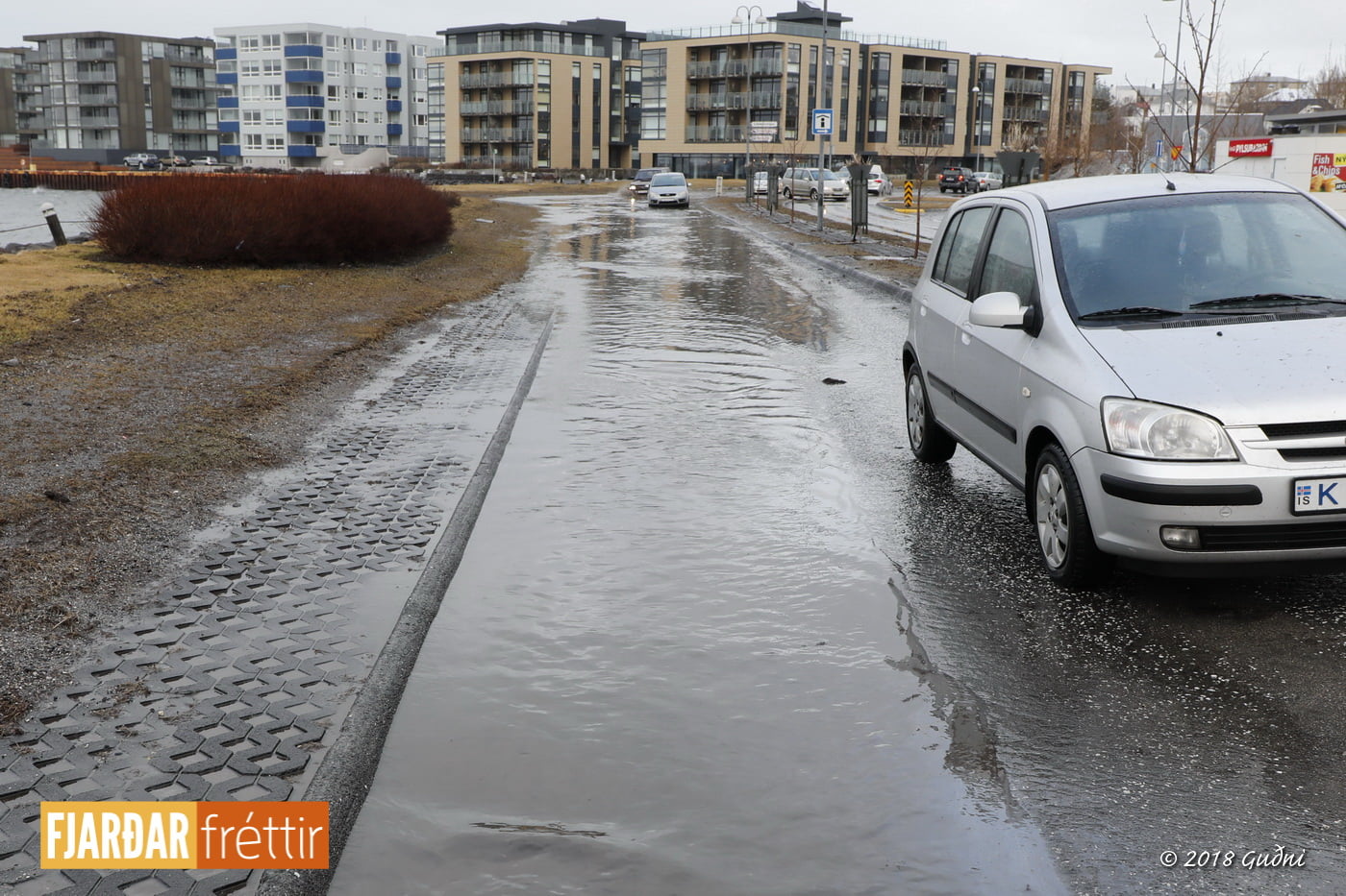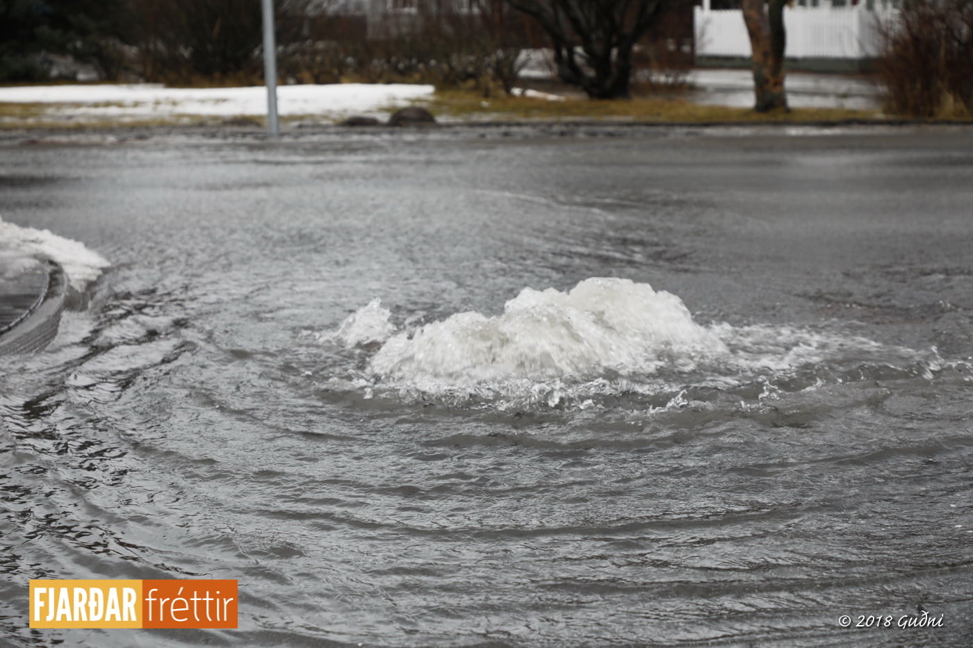 Fjarðargatan var sem oftar í vetur alveg á floti á móts við Linnetsstíginn og í hádeginu höfðu tveir bílar drepið á sér í vatnselgnum. Eitthvað virðist hafa gefið sig því ekki var algengt að sjá vatnselg á þessum stað fyrr en í vetur.