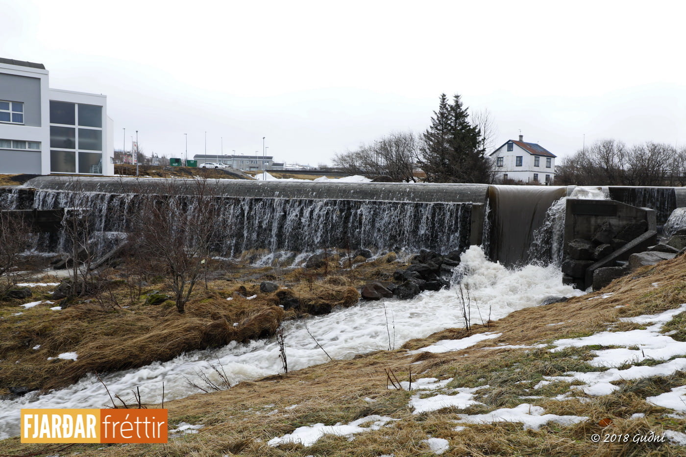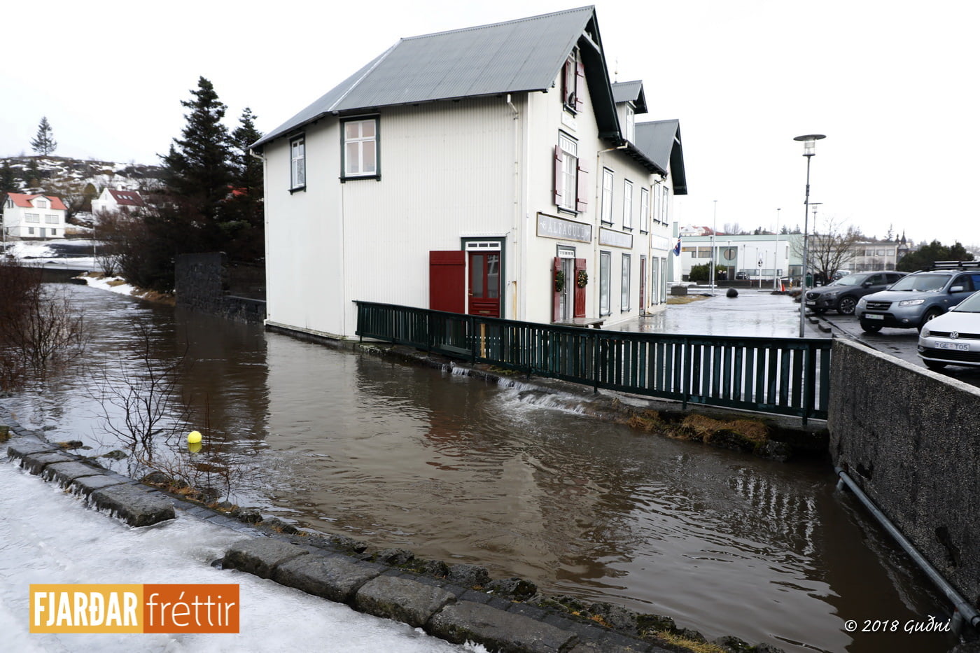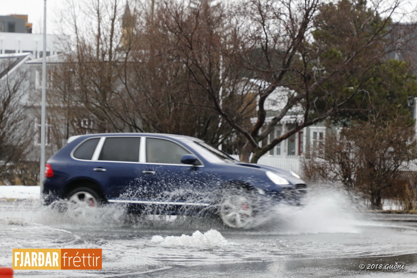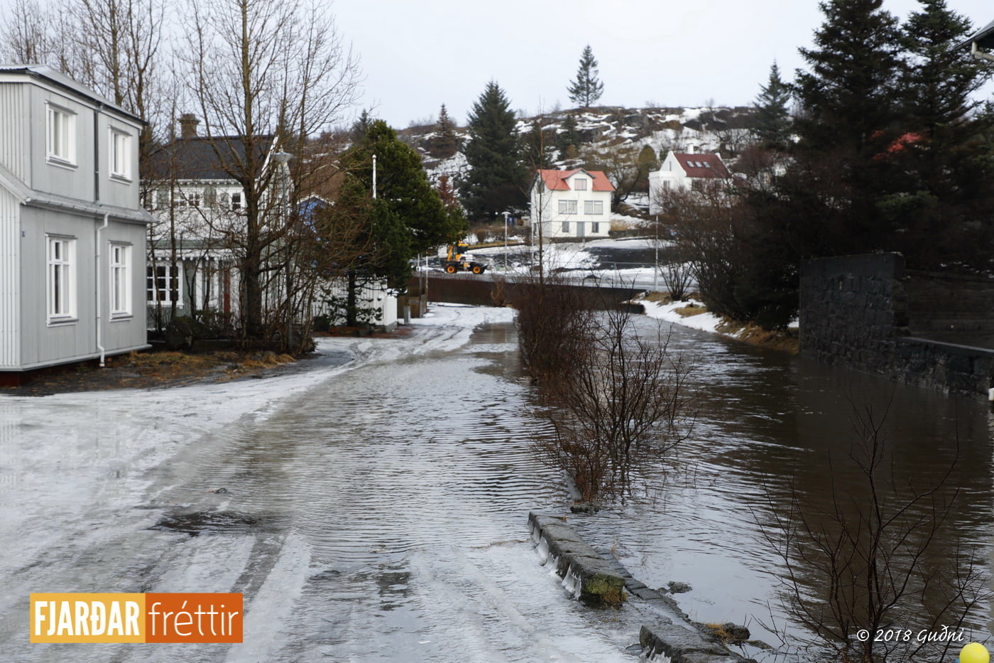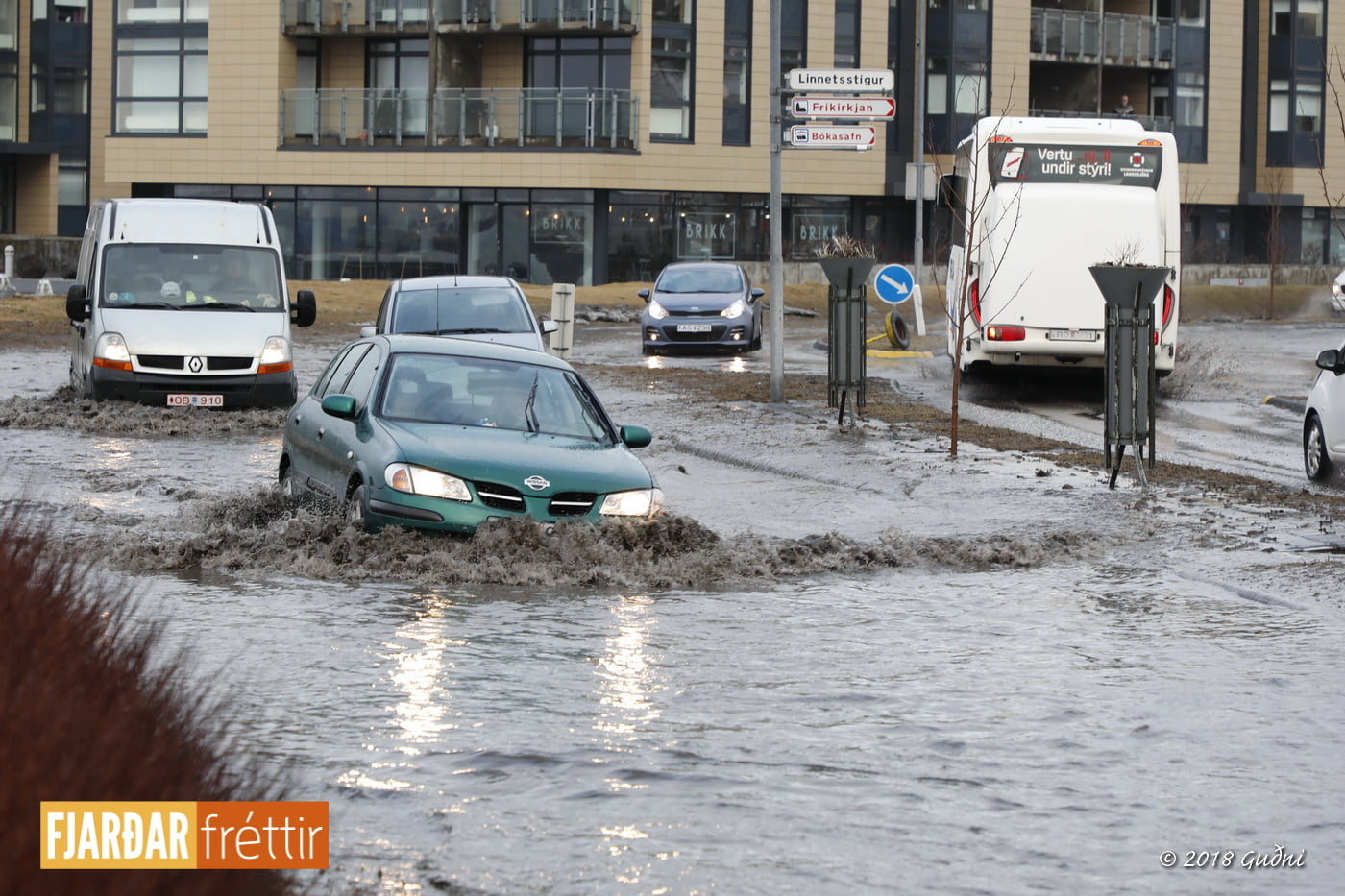 Fjarðargatan var sem oftar í vetur alveg á floti á móts við Linnetsstíginn og í hádeginu höfðu tveir bílar drepið á sér í vatnselgnum. Eitthvað virðist hafa gefið sig því ekki var algengt að sjá vatnselg á þessum stað fyrr en í vetur.