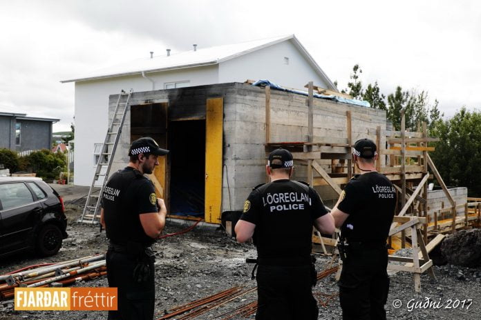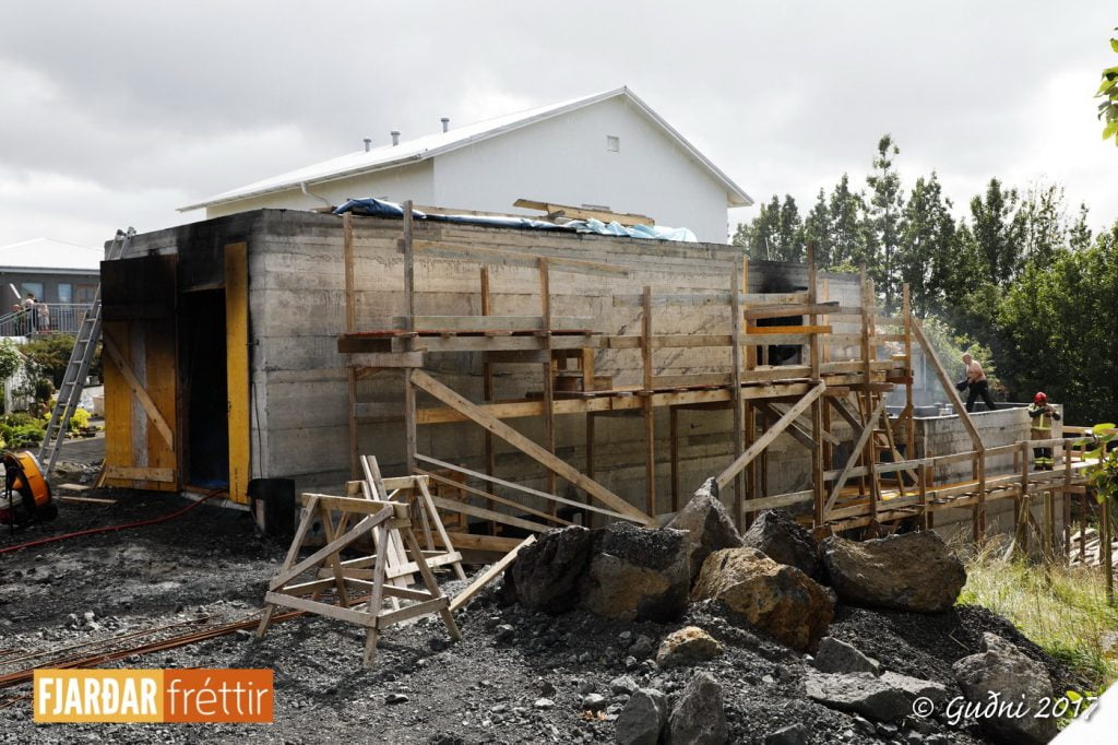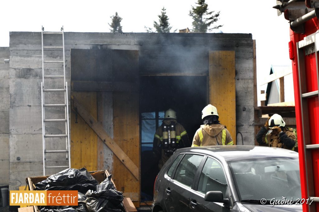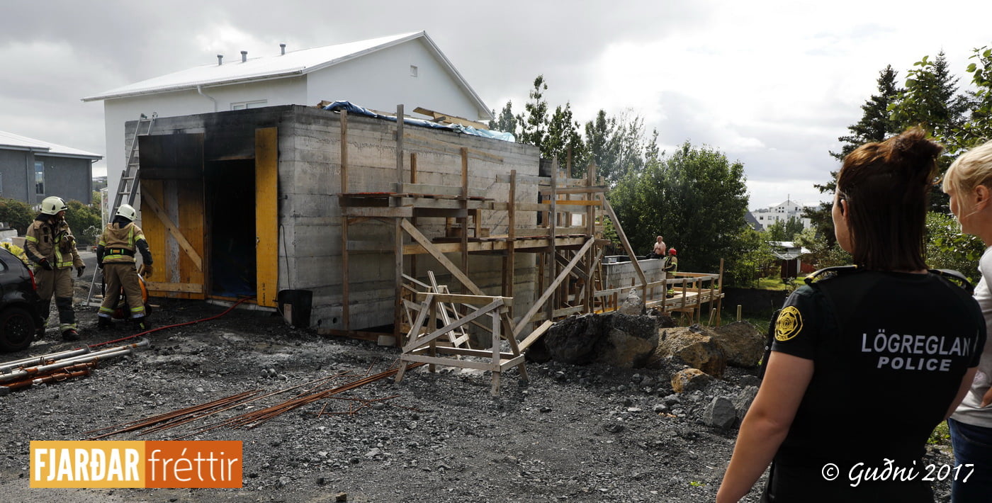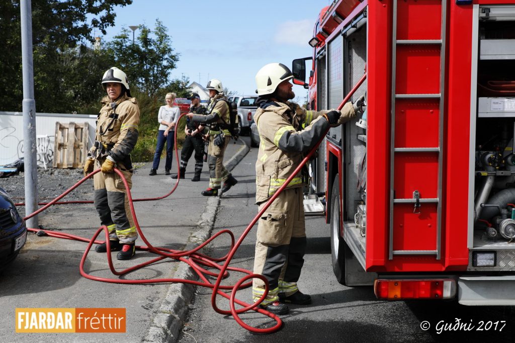 Mikill svartur reykur steig til himins yfir Álfaskeiði á öðrum tímanum í dag. Kviknað hafði í plasteinangrun í viðbyggingu sem inniheldur m.a. bílskúr. Unnið hafði verið við að bræða saman tjörupappa með gasloga og líklegast er að þannig hafi náðst að kvikna í einangruninni.