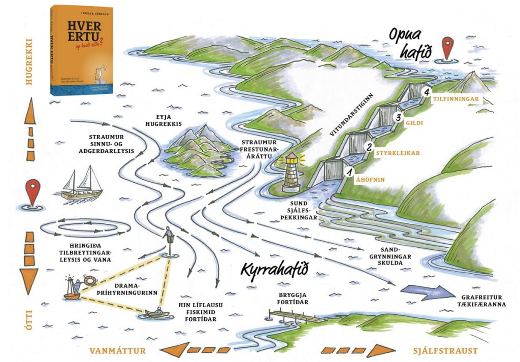 „Ég held að það sé engin svona bók til í heiminum í dag,“ segir Ingvar og hampar nýju bókinni. „Góður markþjálfi er góður í að nota myndlíkingar og þegar ég tala um tilfinningar, sérstaklega við karlmenn, þá endar það oft á að við tölum um veðurfar, það er miklu auðveldara. Það er skemmtilegt að segja frá því að við skrif á bókinni skrifaði ég mig upp á sker og ég var nánast hættur við að skrifa bókina. Þá fékk ég þessa hugmynd að skrifa bókina sem ferðalag. Hér ferðumst við á hugarfarinu. Þar er áhöfn sem samanstendur af þeim ábyrgðarhlutverkum sem við höfum öll í okkar lífi. Það eru líka farþegar á farinu, fólk sem við höfum einhverjar skyldur gagnvart. Ferðalagið gengur út á komast yfir Kyrrahafið (þar sem draumarnir sofa) upp fjóra vitundarstiga en stýrimaðurinn um borð er þín betri vitund á meðan þú sjálfur ert skipstjórinn. Stýrimaðurinn er í raun markþjálfi og þegar við komum við á Eyju hugrekkisins tekur stýrimaðurinn þig í göngutúr að hinum tólf uppsprettum hugrekkisins.“