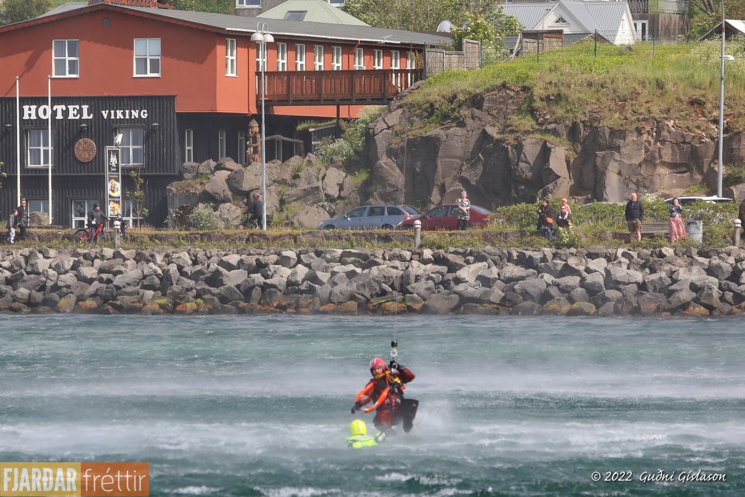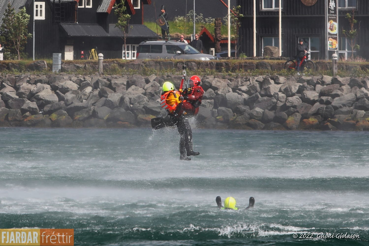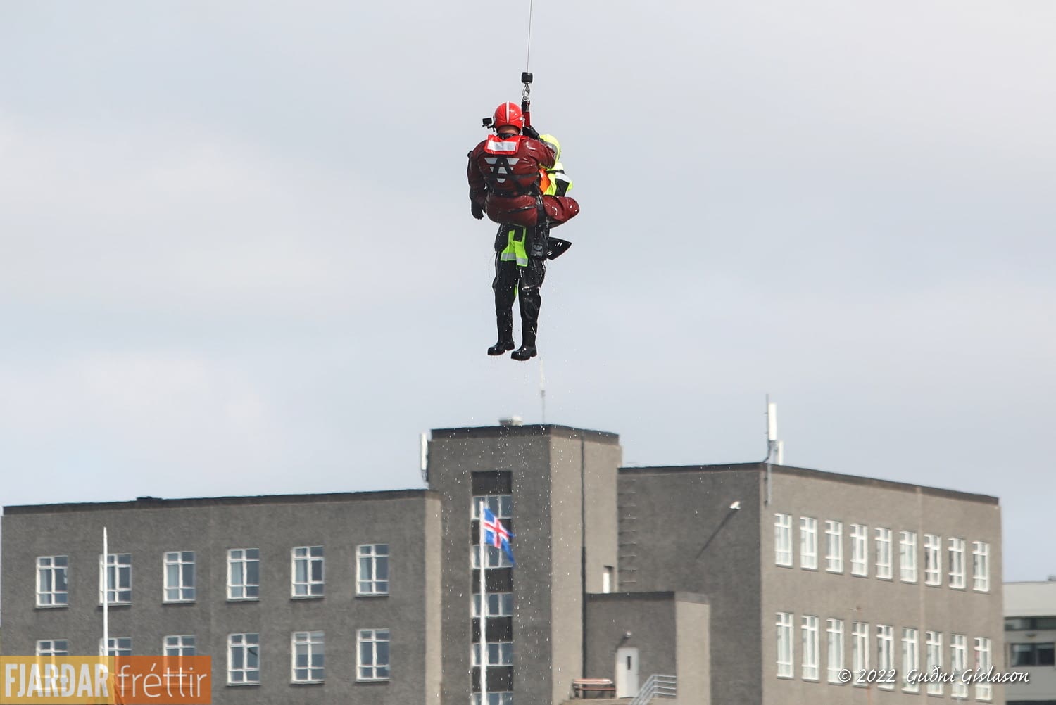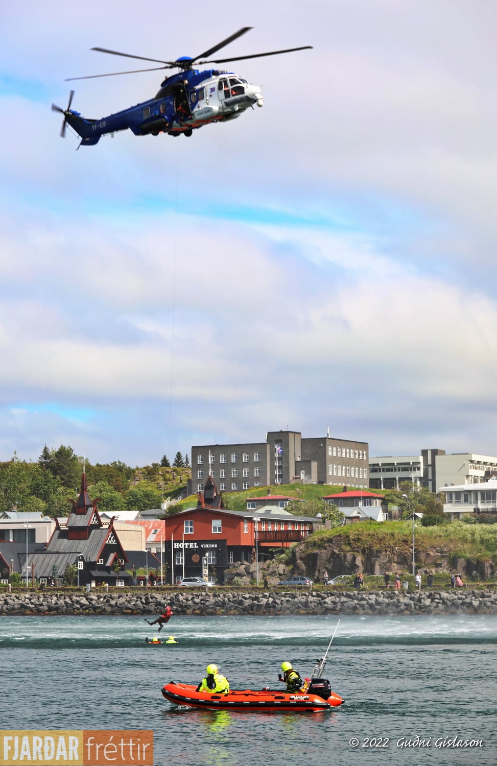 Þyrla Landhelgisgæslunnar, TF-EIR vakti mikla athygli er áhöfn hennar „bjargaði“ tveimur björgunarsveitarmönnum úr sjónum. Greinilega þaulvanir menn að verki þar.