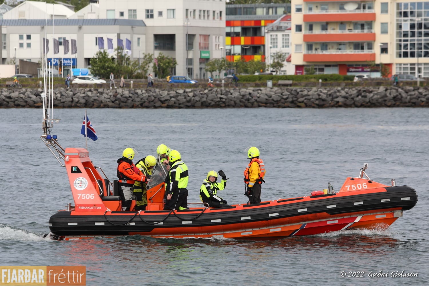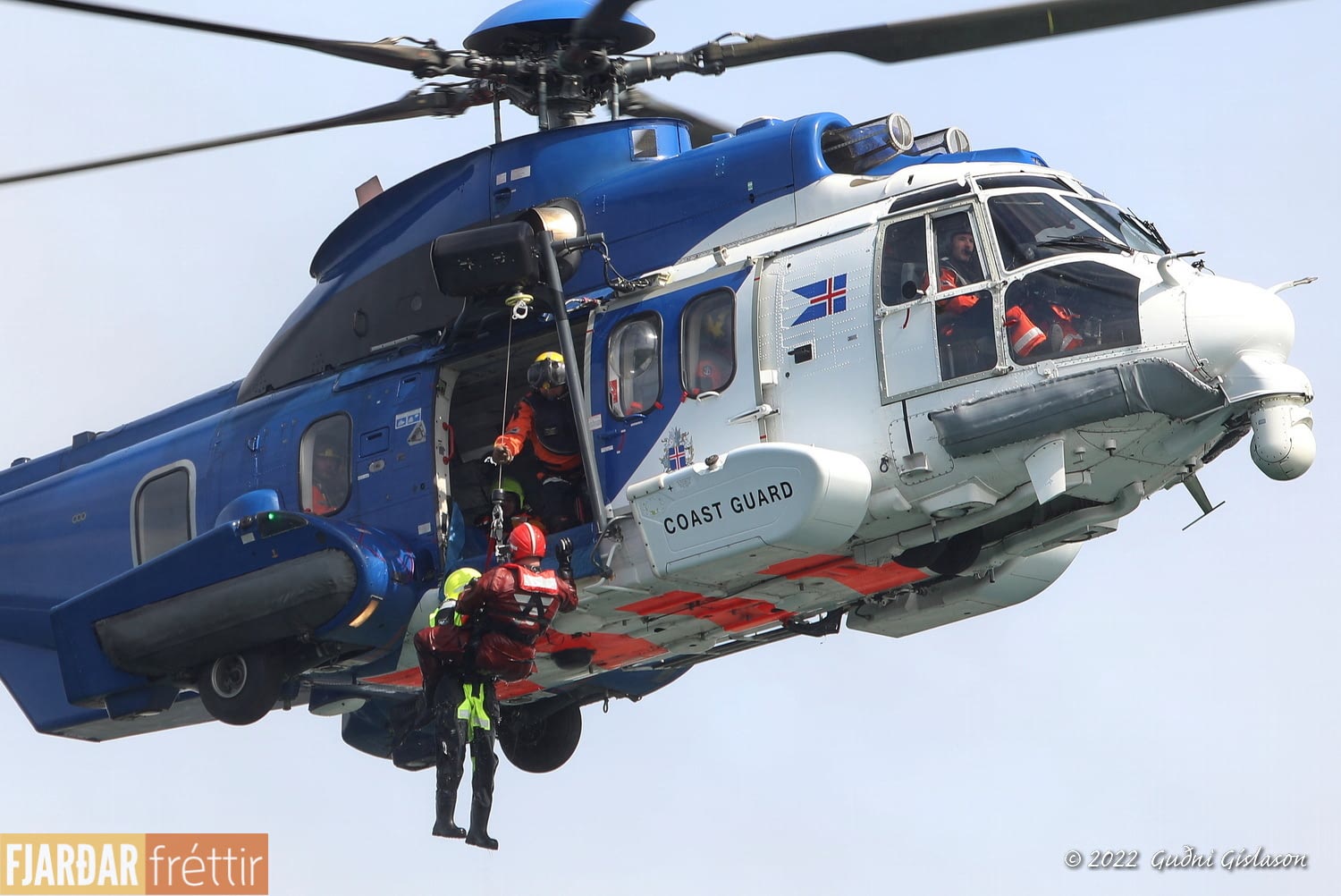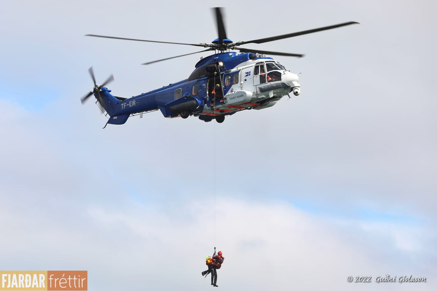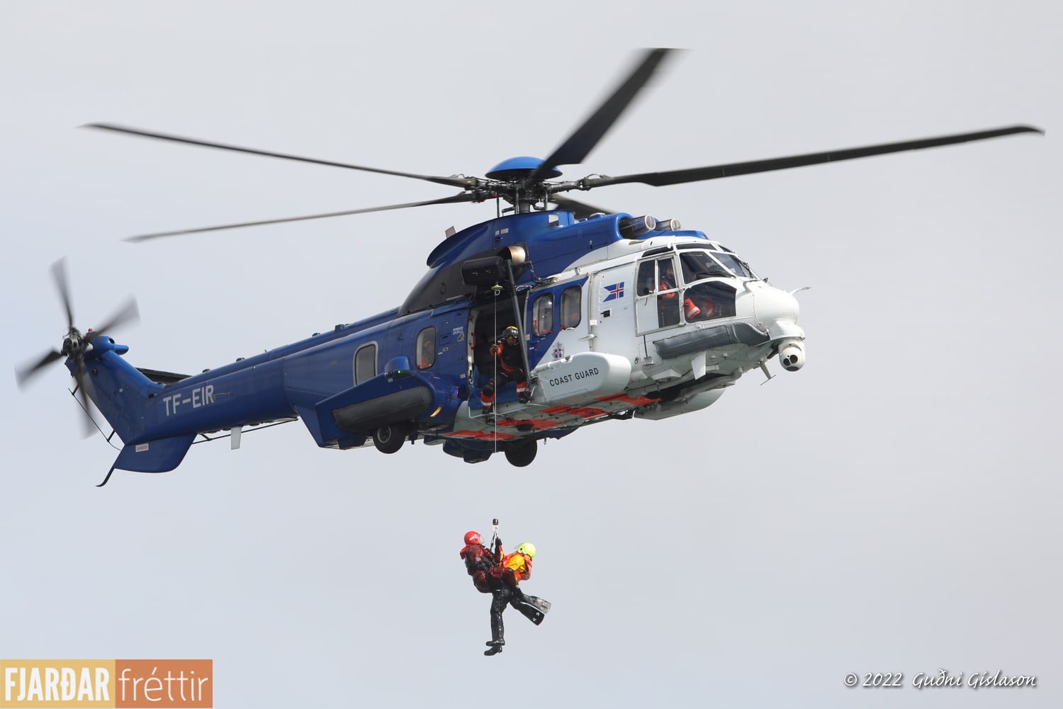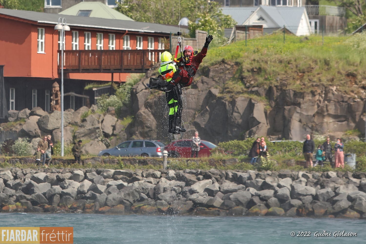 Þyrla Landhelgisgæslunnar, TF-EIR vakti mikla athygli er áhöfn hennar „bjargaði“ tveimur björgunarsveitarmönnum úr sjónum. Greinilega þaulvanir menn að verki þar.