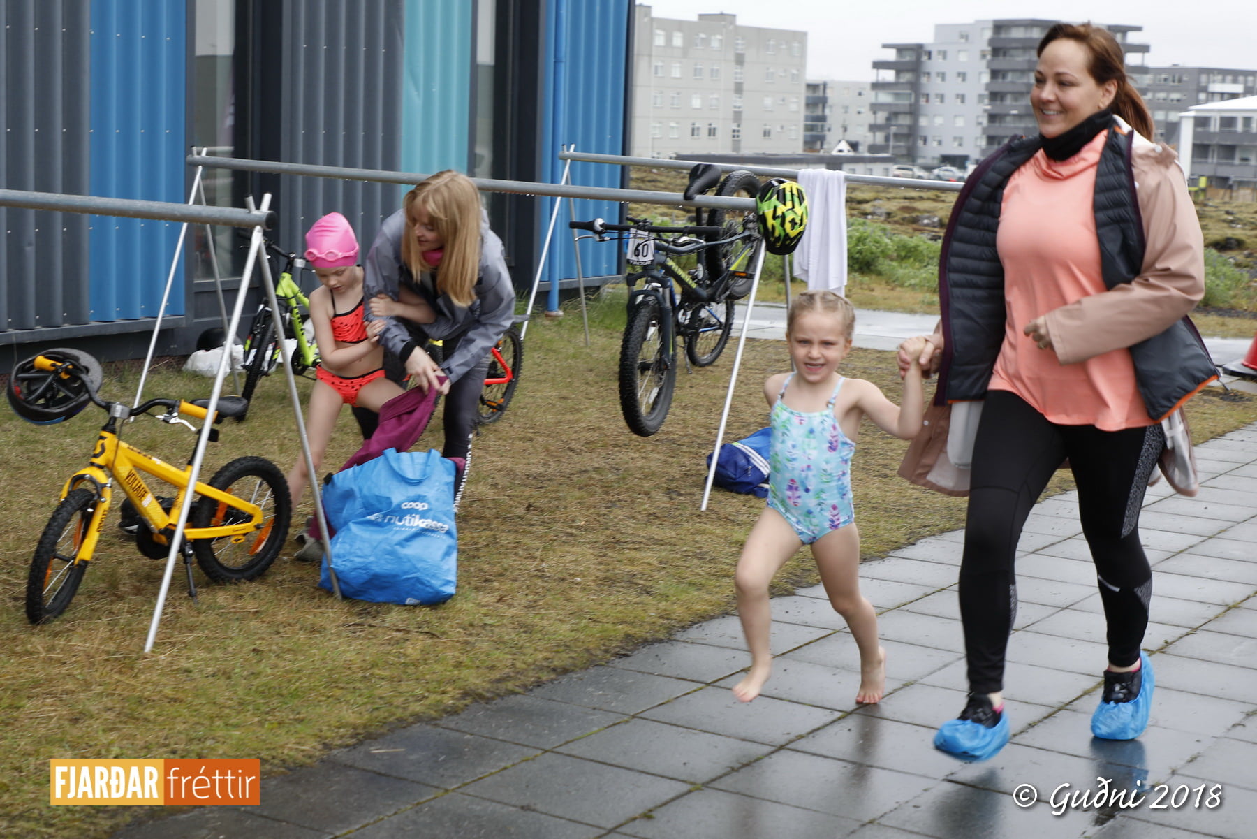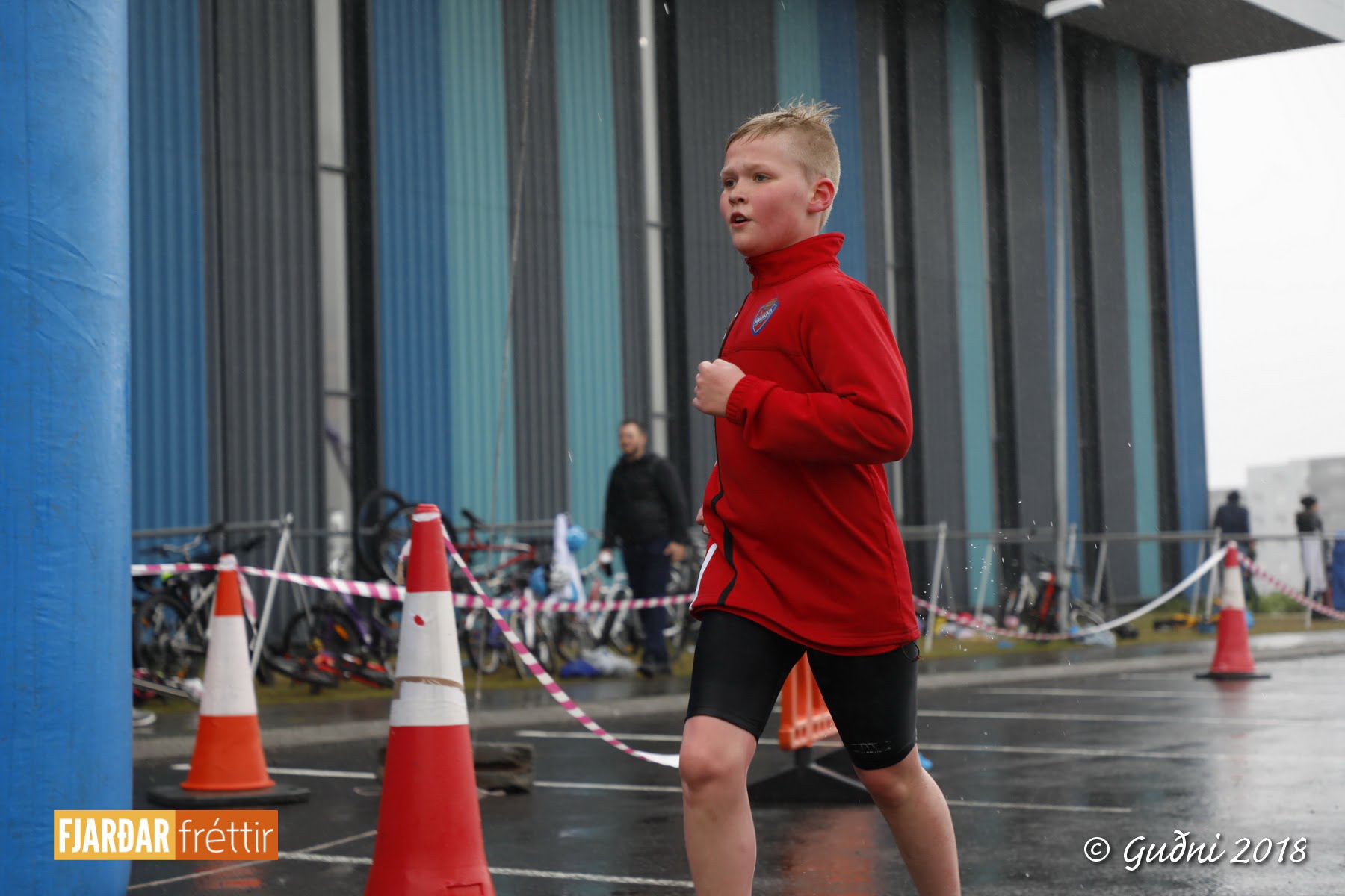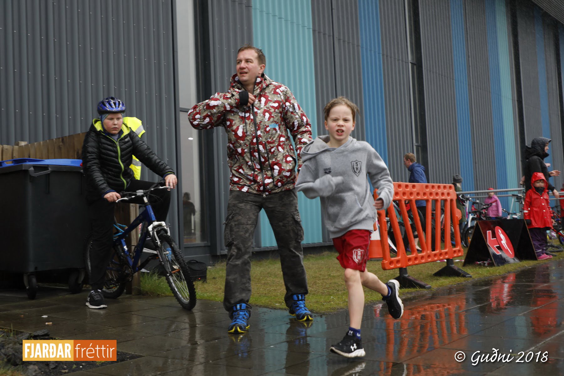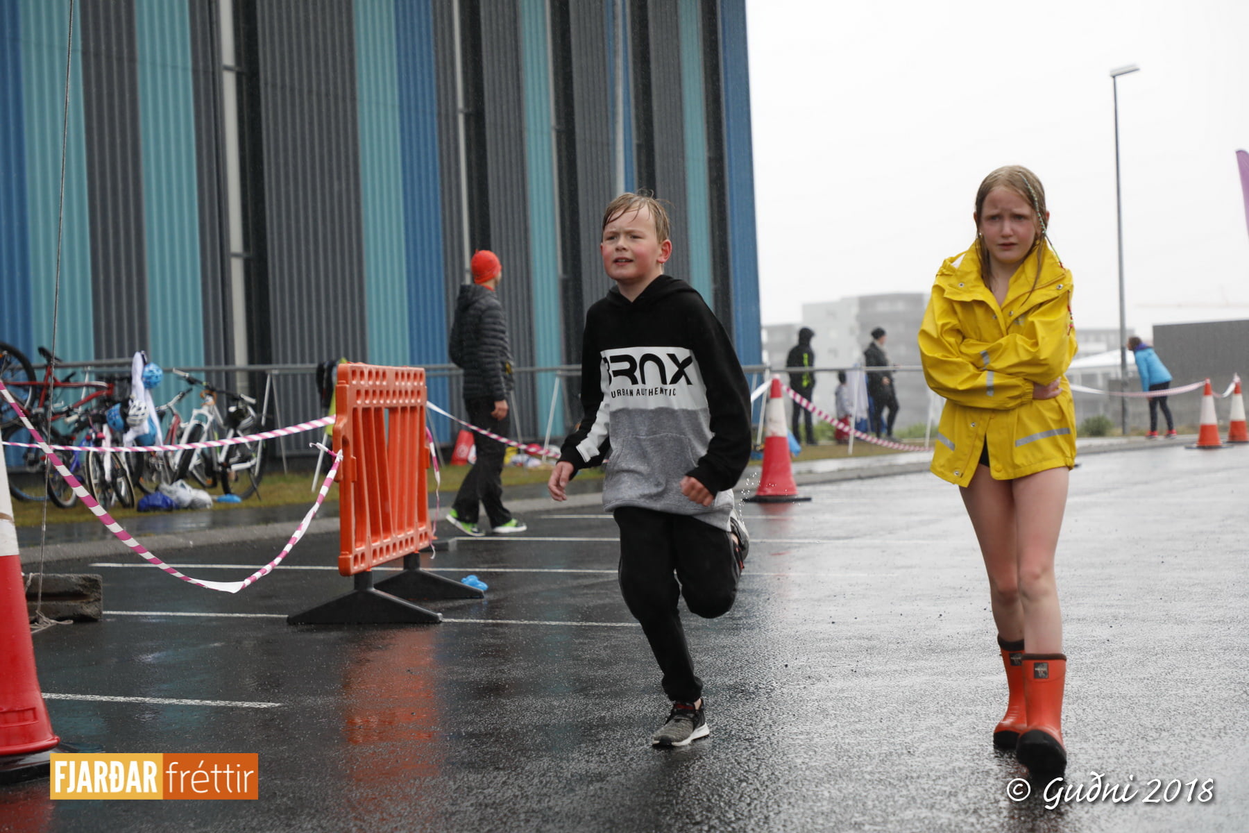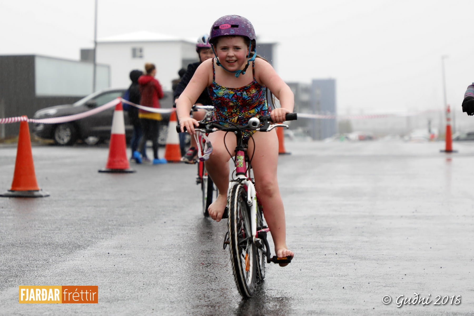 Keppni hófst með sundi en þaðan hröðuðu krakkarnir sér út, settu á sig hjálm og hjóluðu í kringum sundlaugarbygginguna. Lokagreinin var svo hlaup og keppendur voru ekki alltaf að gefa sér tíma til að skipta um föt og sundfötin stundum látin duga. Það hellirigndi á meðan á keppninni stóð en krakkarnir létu það ekkert á sig fá.