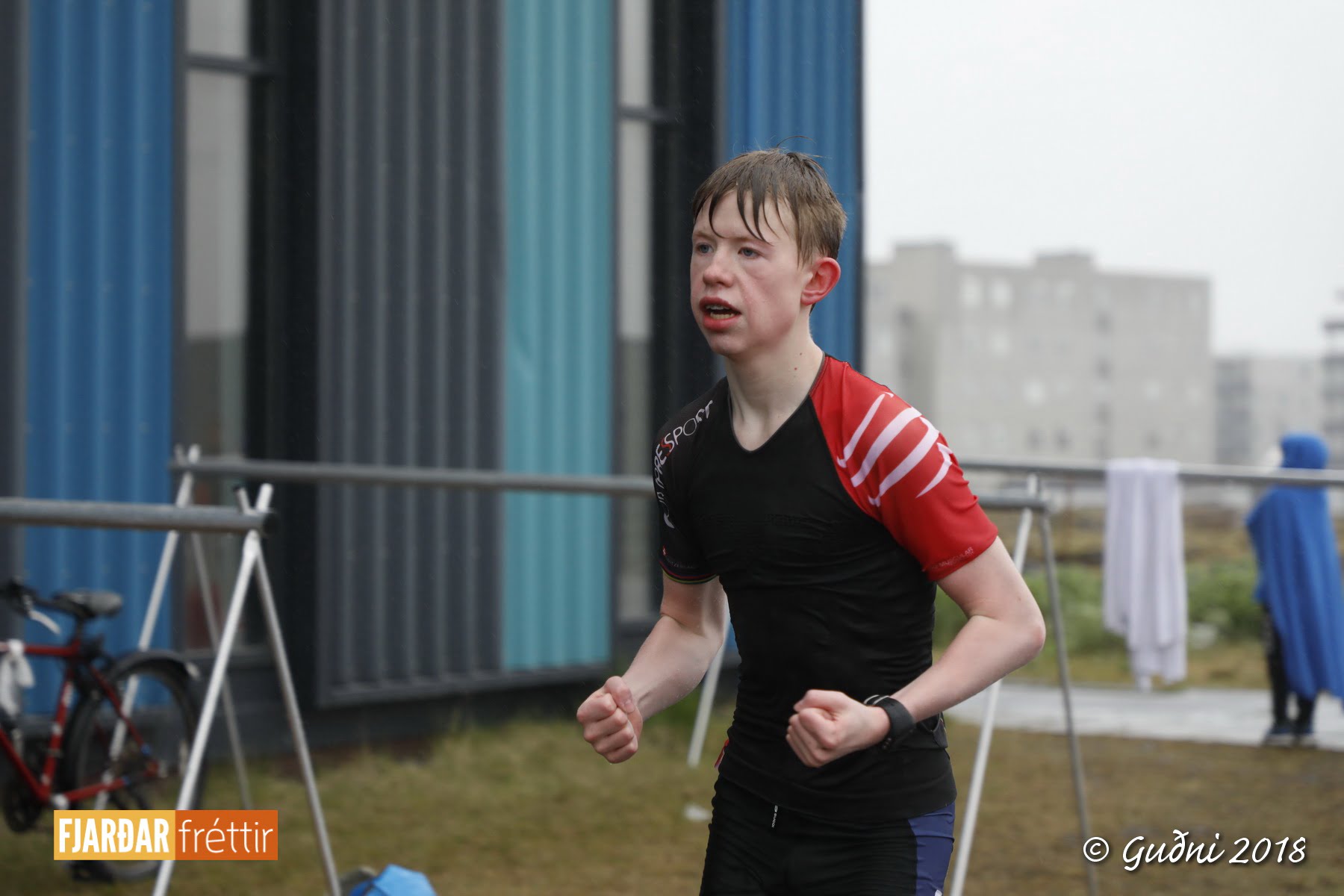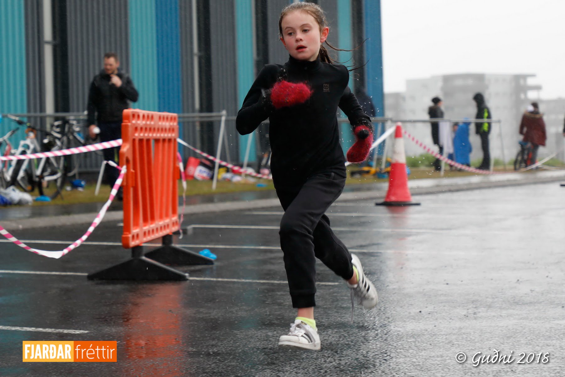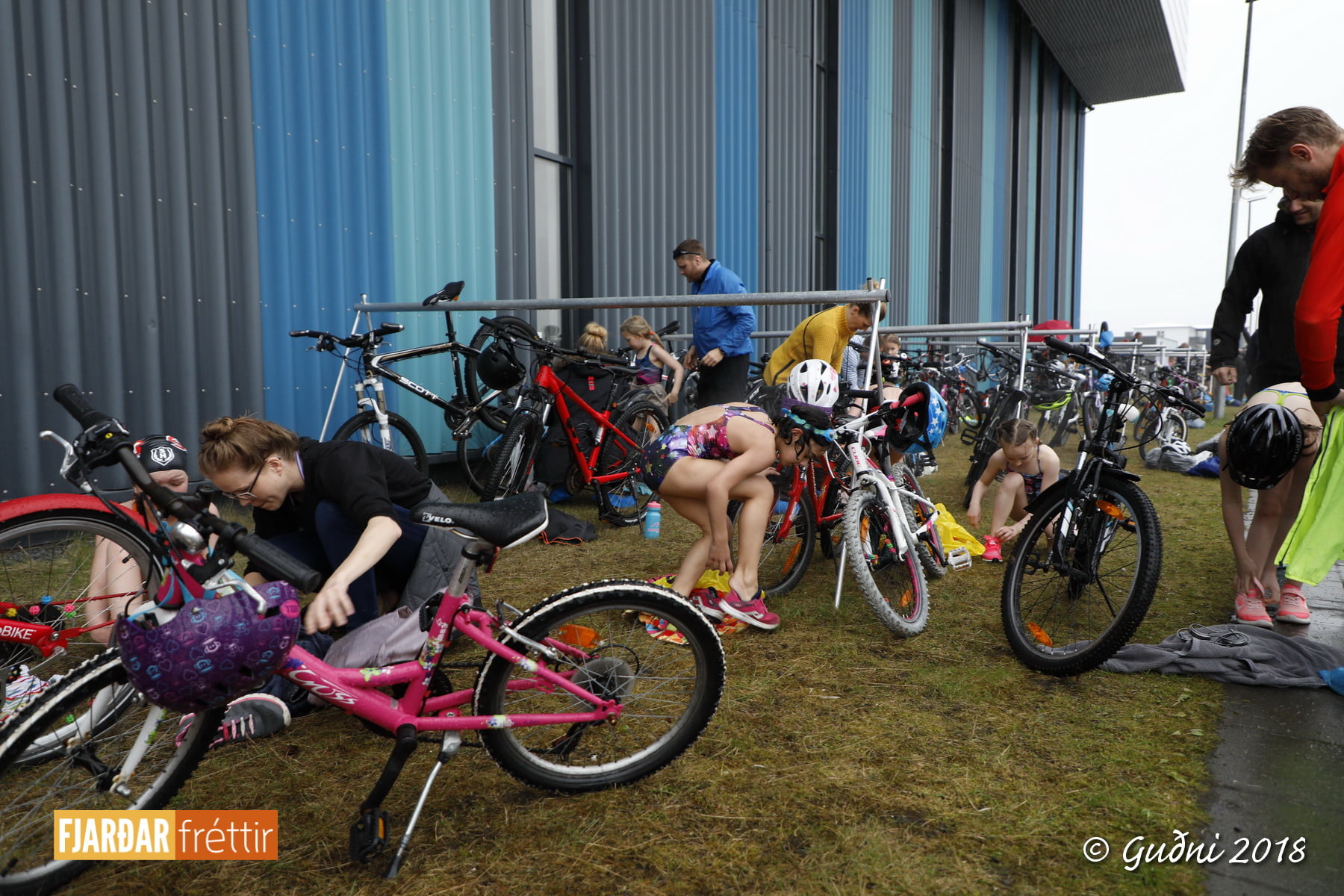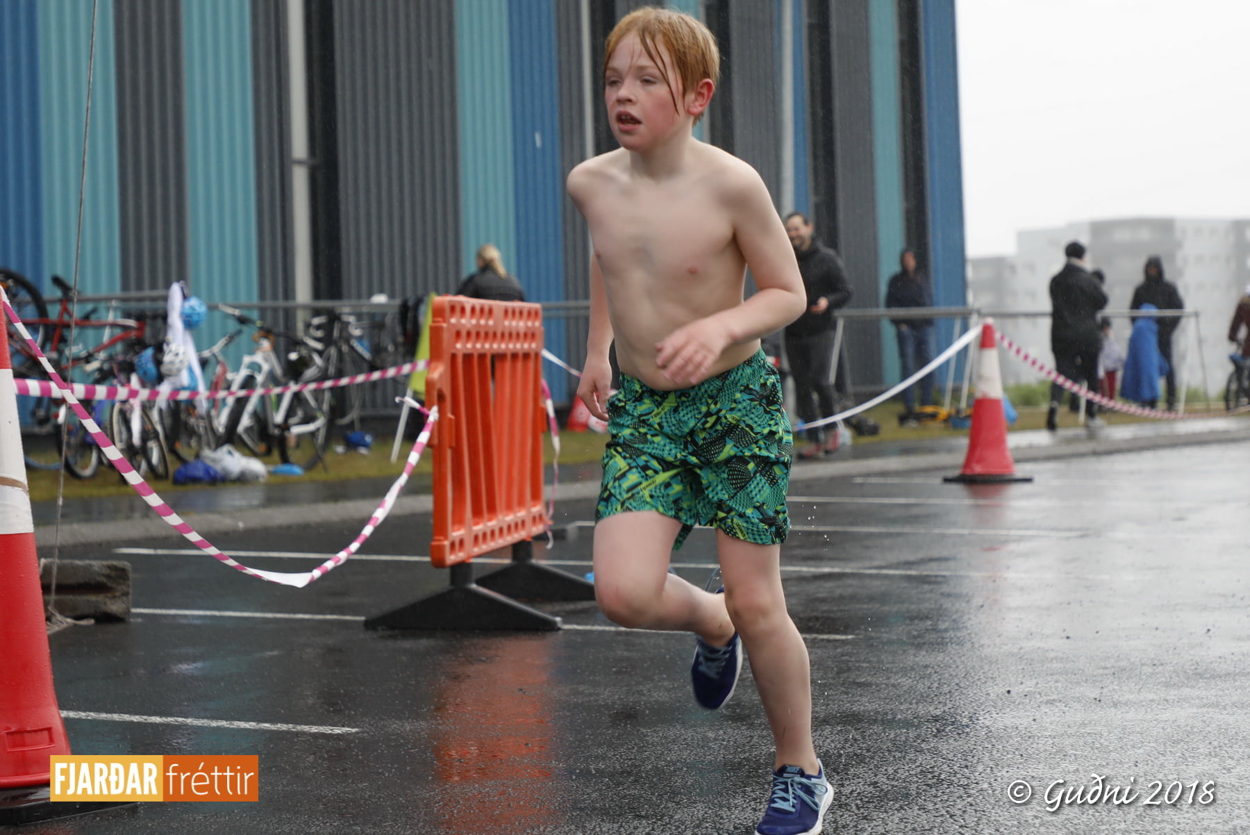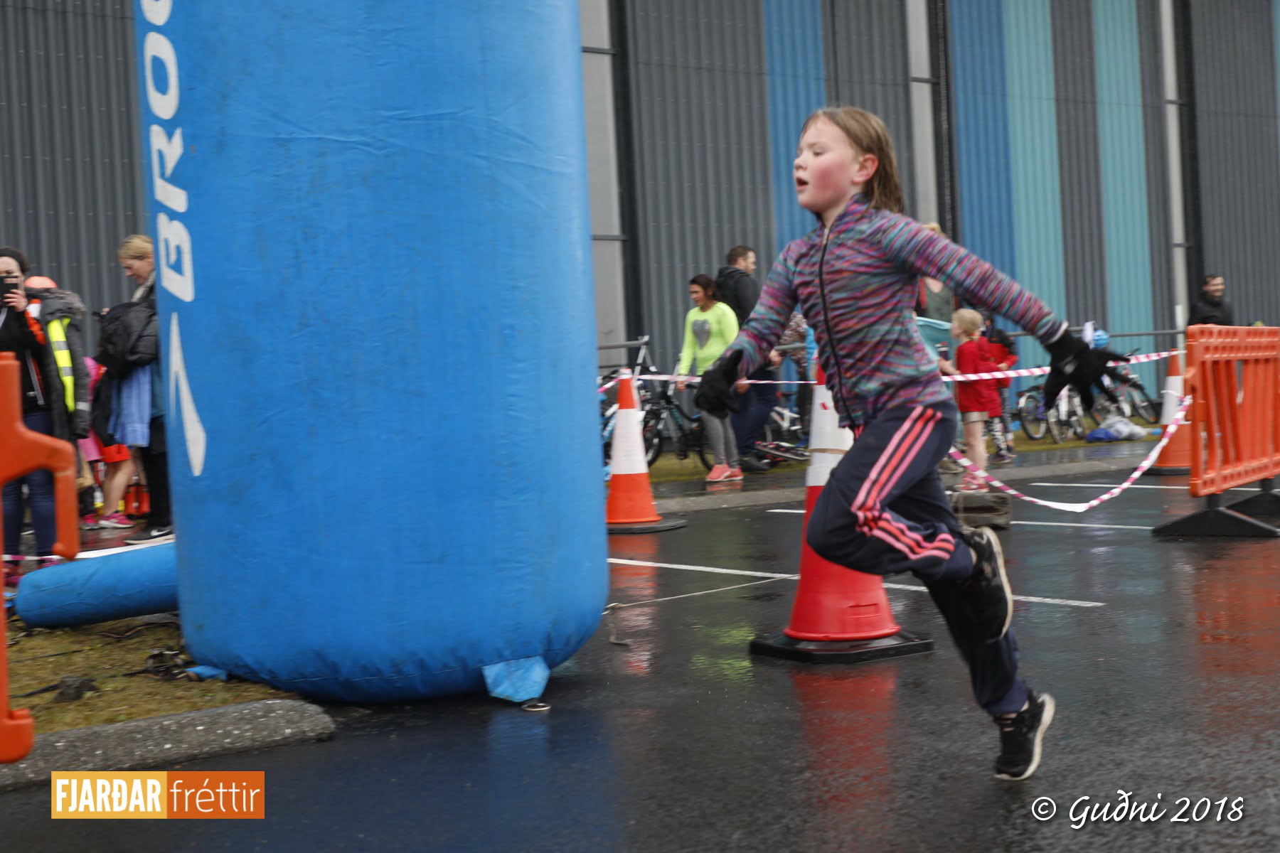 Keppni hófst með sundi en þaðan hröðuðu krakkarnir sér út, settu á sig hjálm og hjóluðu í kringum sundlaugarbygginguna. Lokagreinin var svo hlaup og keppendur voru ekki alltaf að gefa sér tíma til að skipta um föt og sundfötin stundum látin duga. Það hellirigndi á meðan á keppninni stóð en krakkarnir létu það ekkert á sig fá.