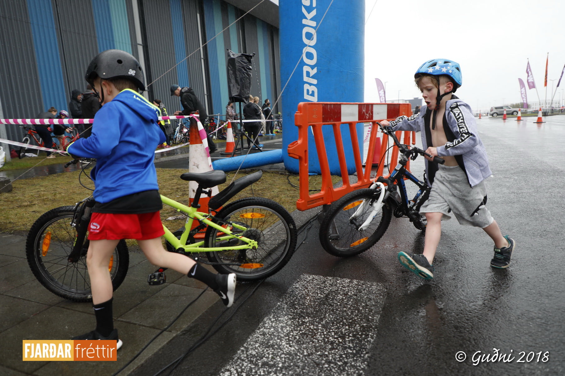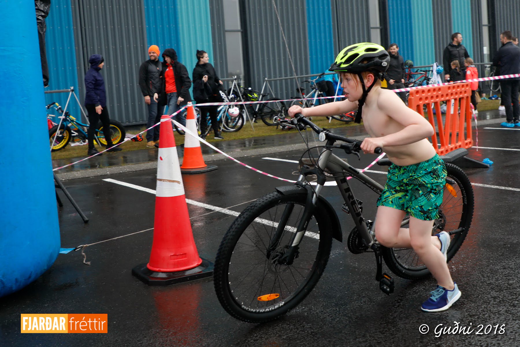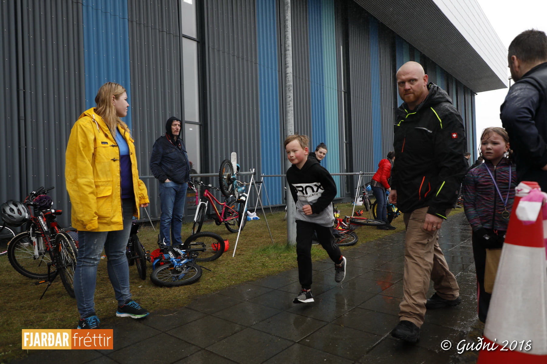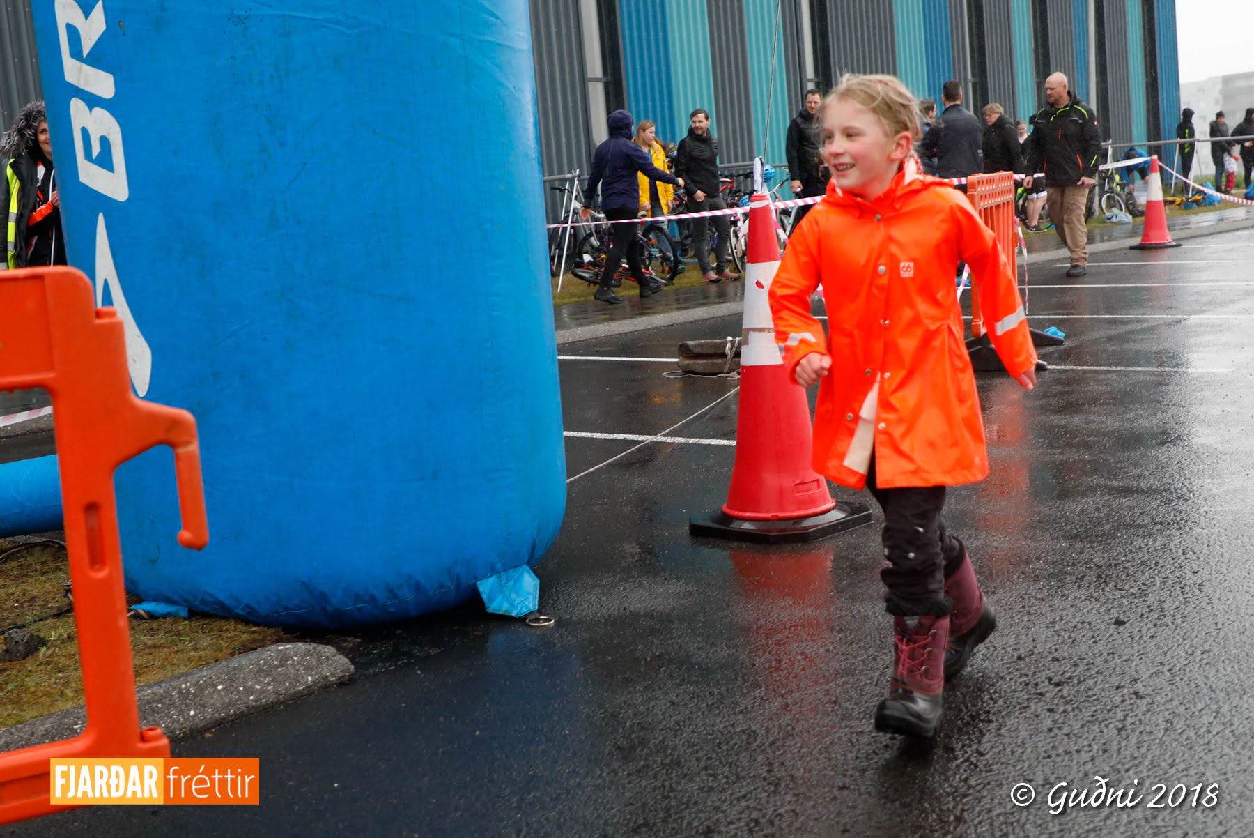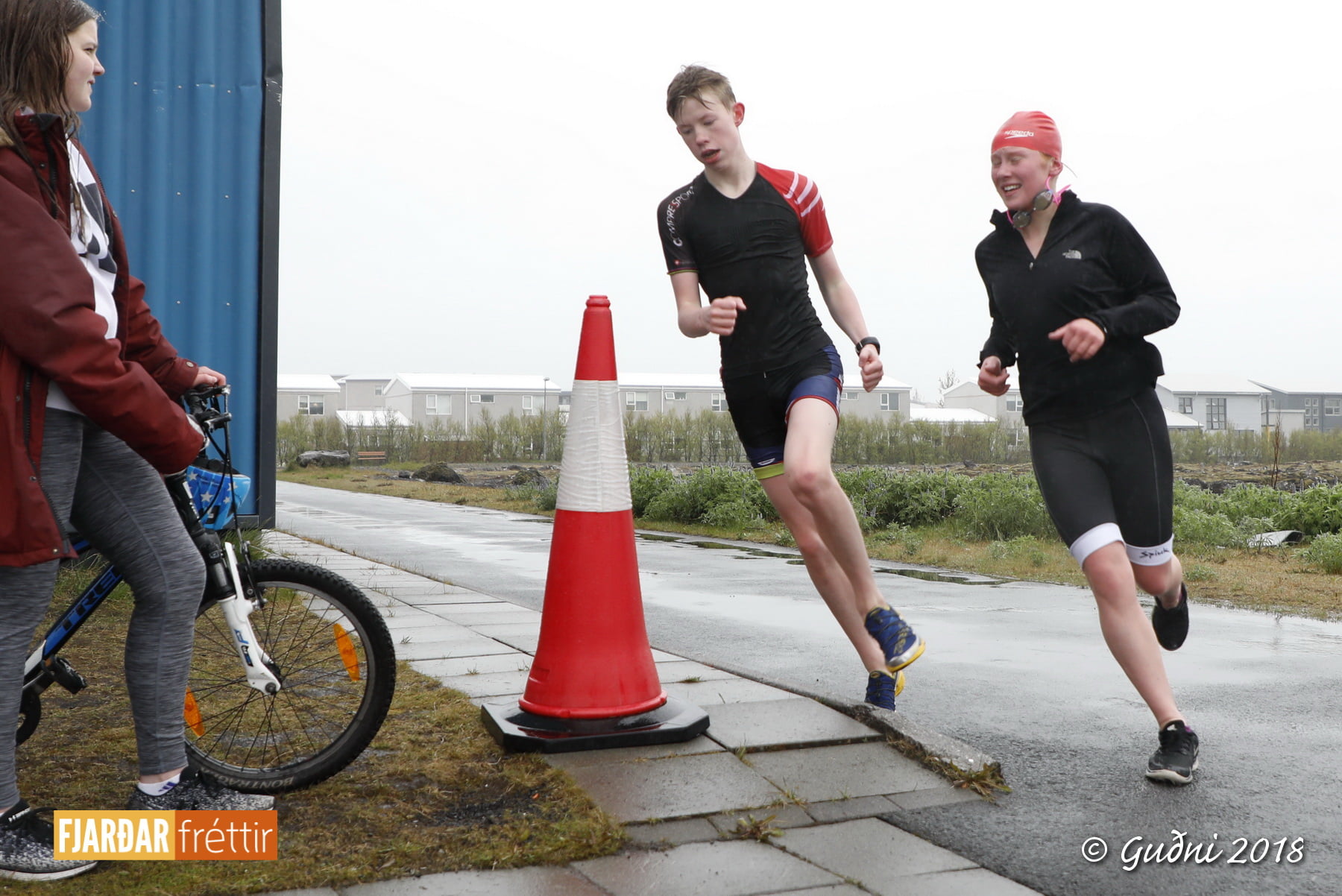 Keppni hófst með sundi en þaðan hröðuðu krakkarnir sér út, settu á sig hjálm og hjóluðu í kringum sundlaugarbygginguna. Lokagreinin var svo hlaup og keppendur voru ekki alltaf að gefa sér tíma til að skipta um föt og sundfötin stundum látin duga. Það hellirigndi á meðan á keppninni stóð en krakkarnir létu það ekkert á sig fá.