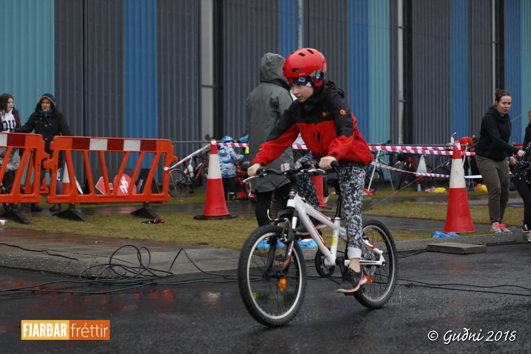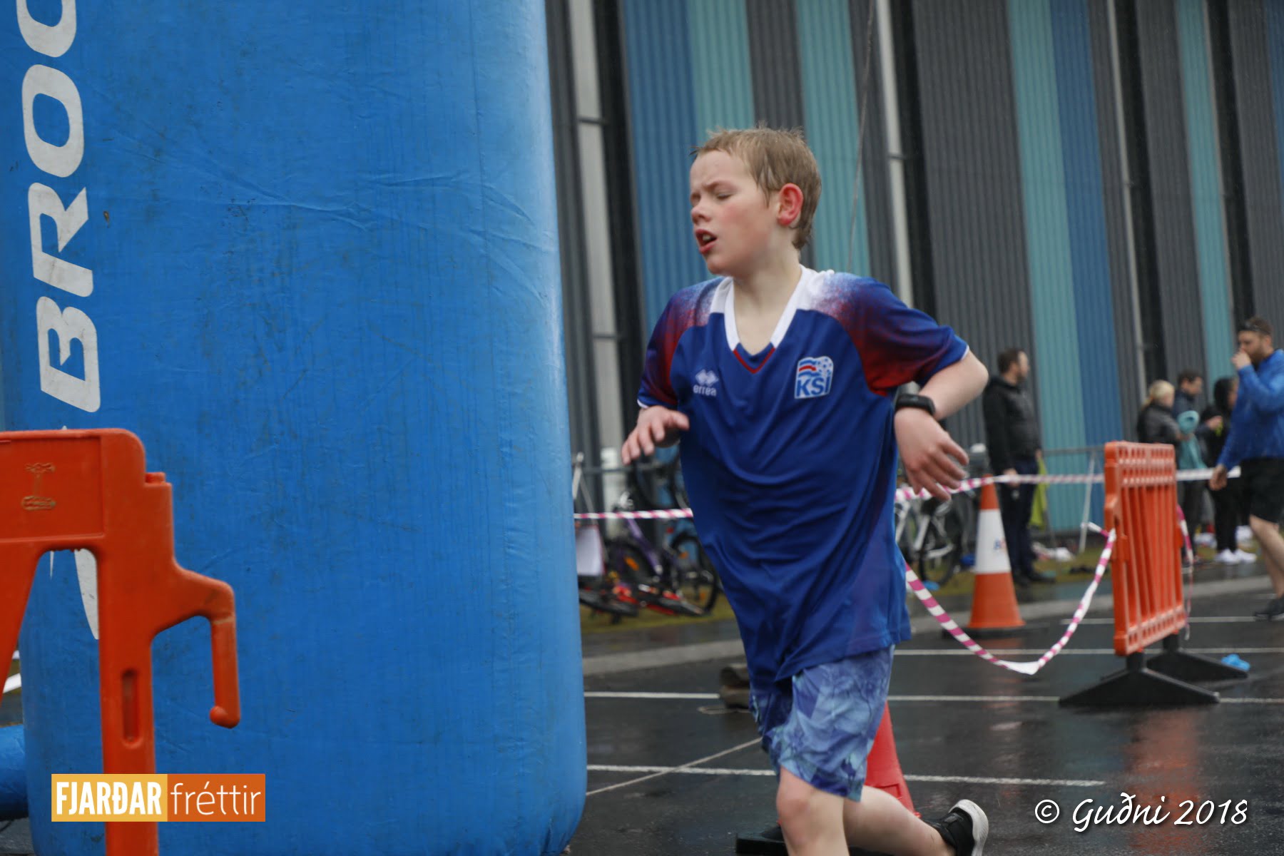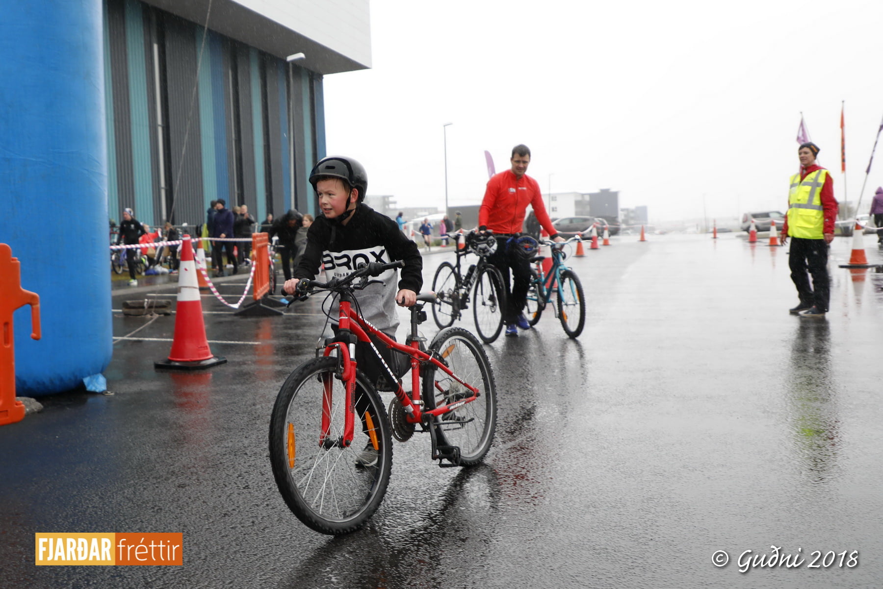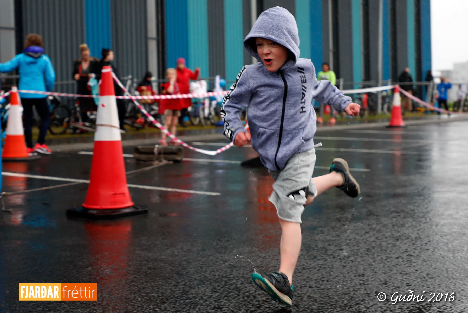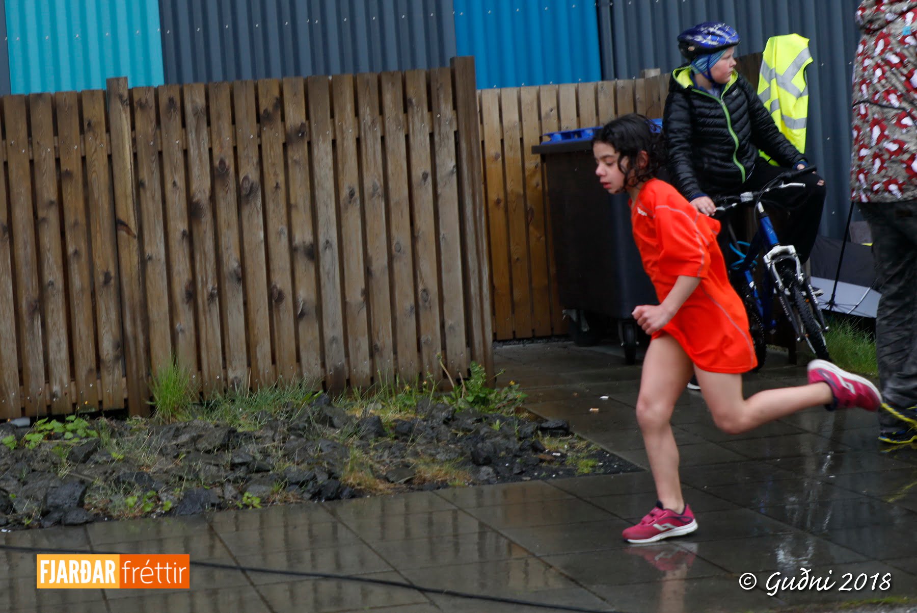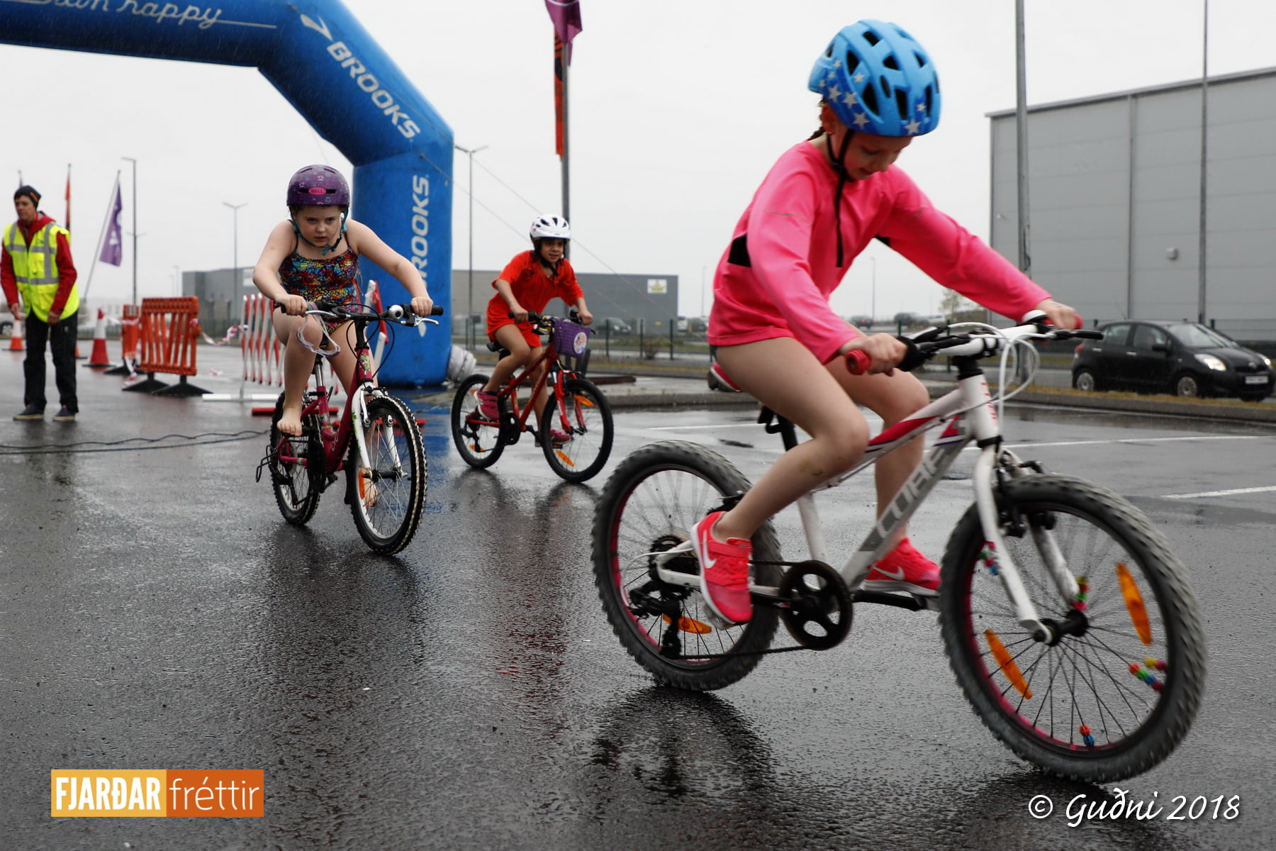 Keppni hófst með sundi en þaðan hröðuðu krakkarnir sér út, settu á sig hjálm og hjóluðu í kringum sundlaugarbygginguna. Lokagreinin var svo hlaup og keppendur voru ekki alltaf að gefa sér tíma til að skipta um föt og sundfötin stundum látin duga. Það hellirigndi á meðan á keppninni stóð en krakkarnir létu það ekkert á sig fá.