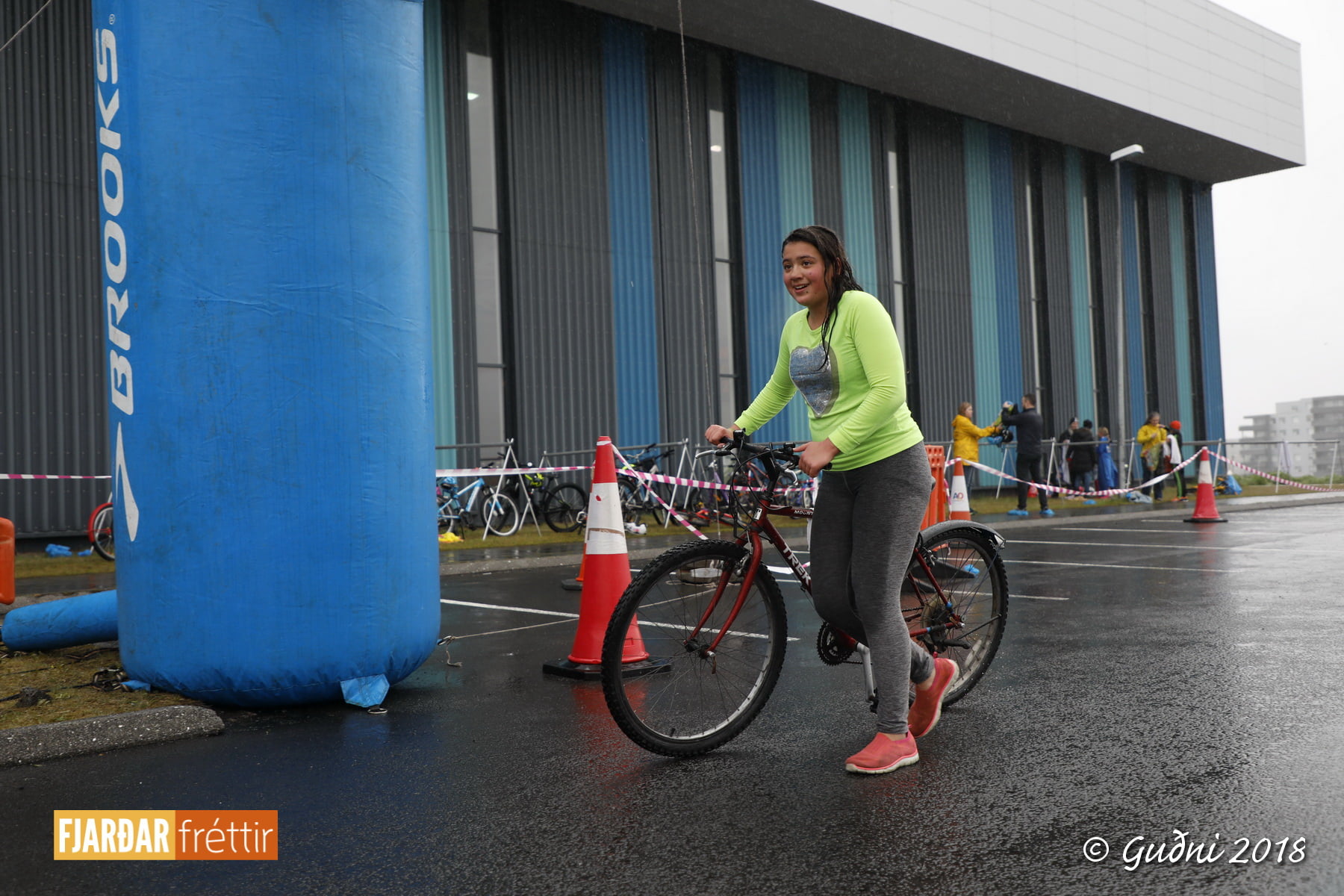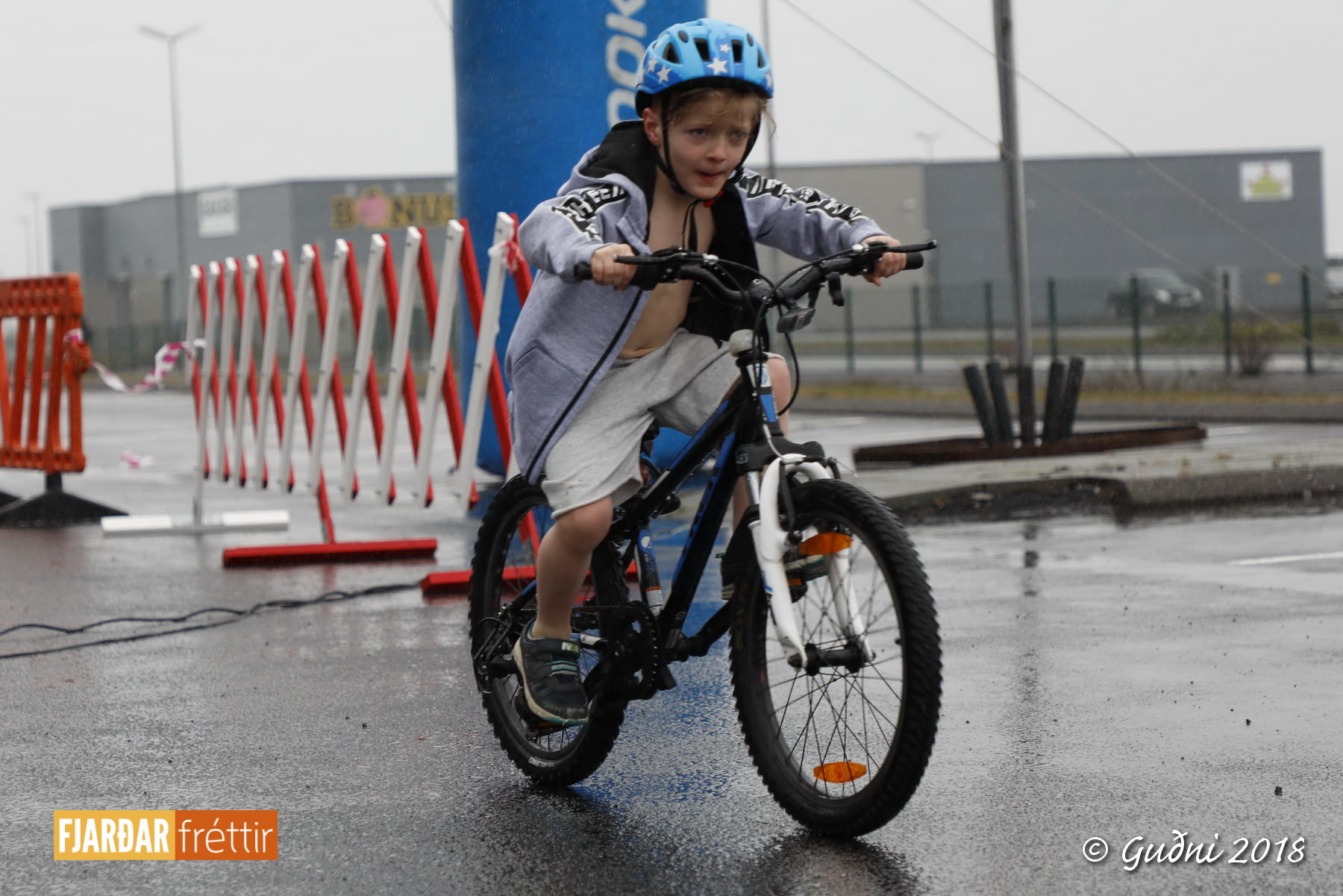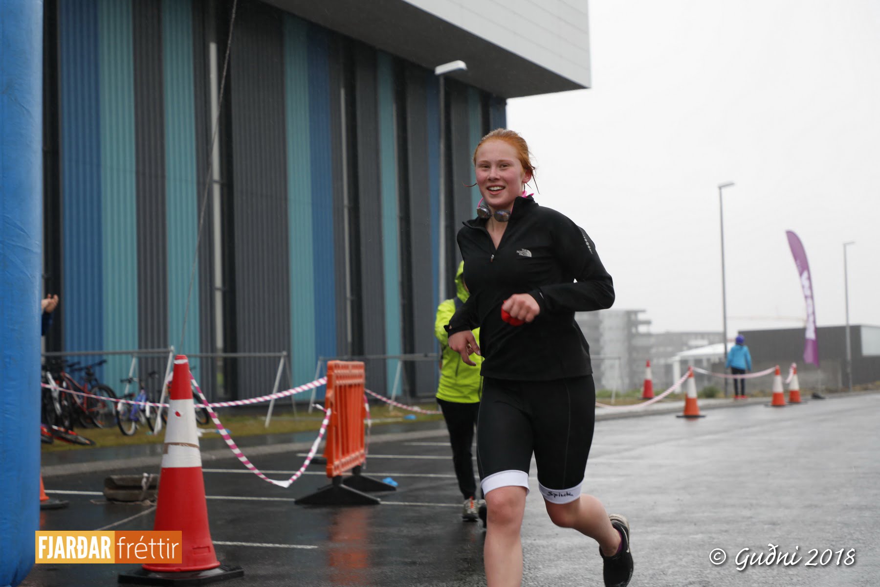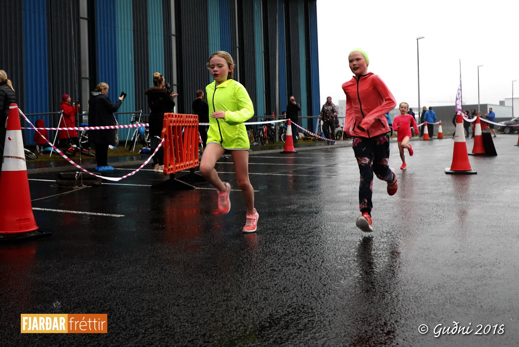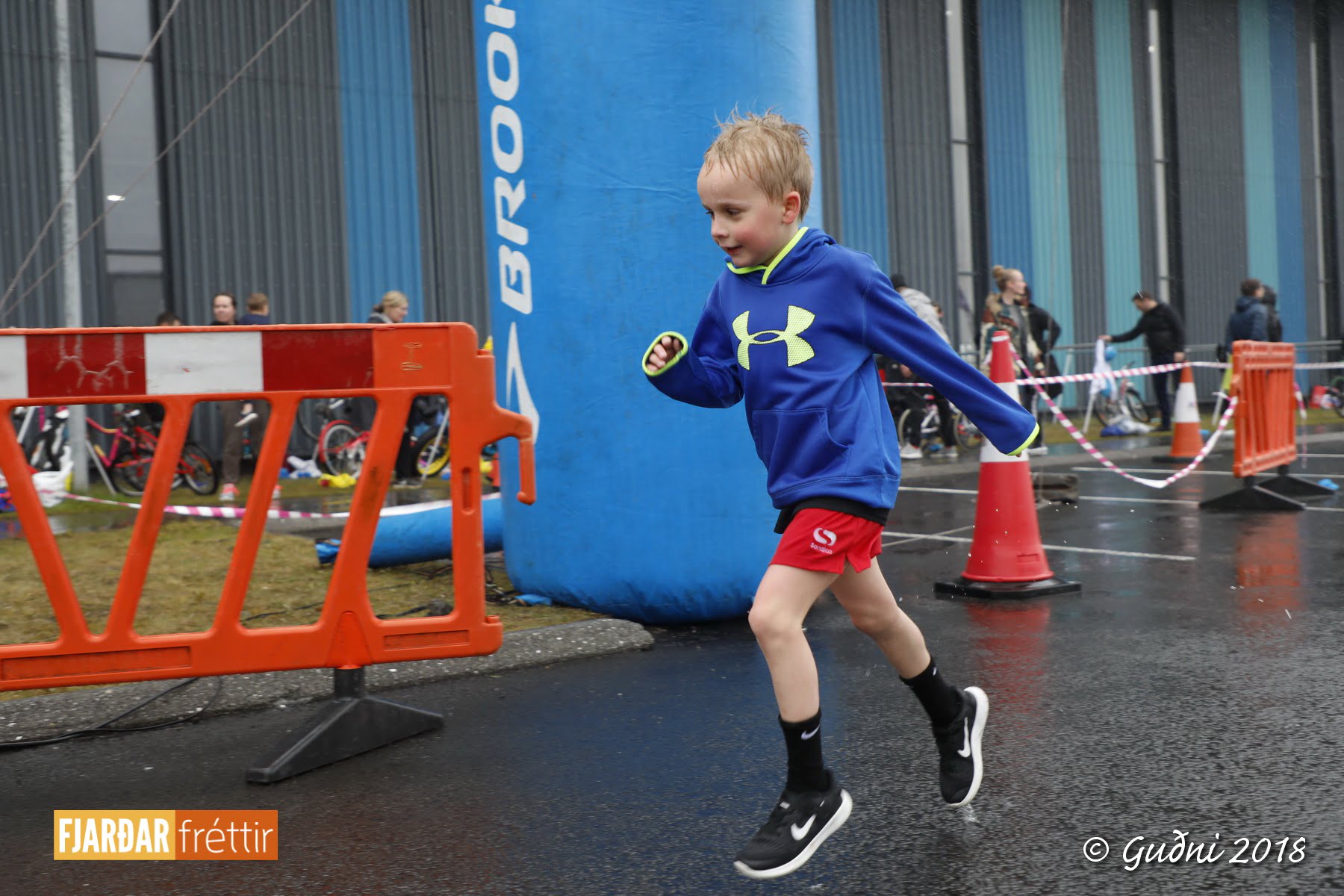 Keppni hófst með sundi en þaðan hröðuðu krakkarnir sér út, settu á sig hjálm og hjóluðu í kringum sundlaugarbygginguna. Lokagreinin var svo hlaup og keppendur voru ekki alltaf að gefa sér tíma til að skipta um föt og sundfötin stundum látin duga. Það hellirigndi á meðan á keppninni stóð en krakkarnir létu það ekkert á sig fá.
