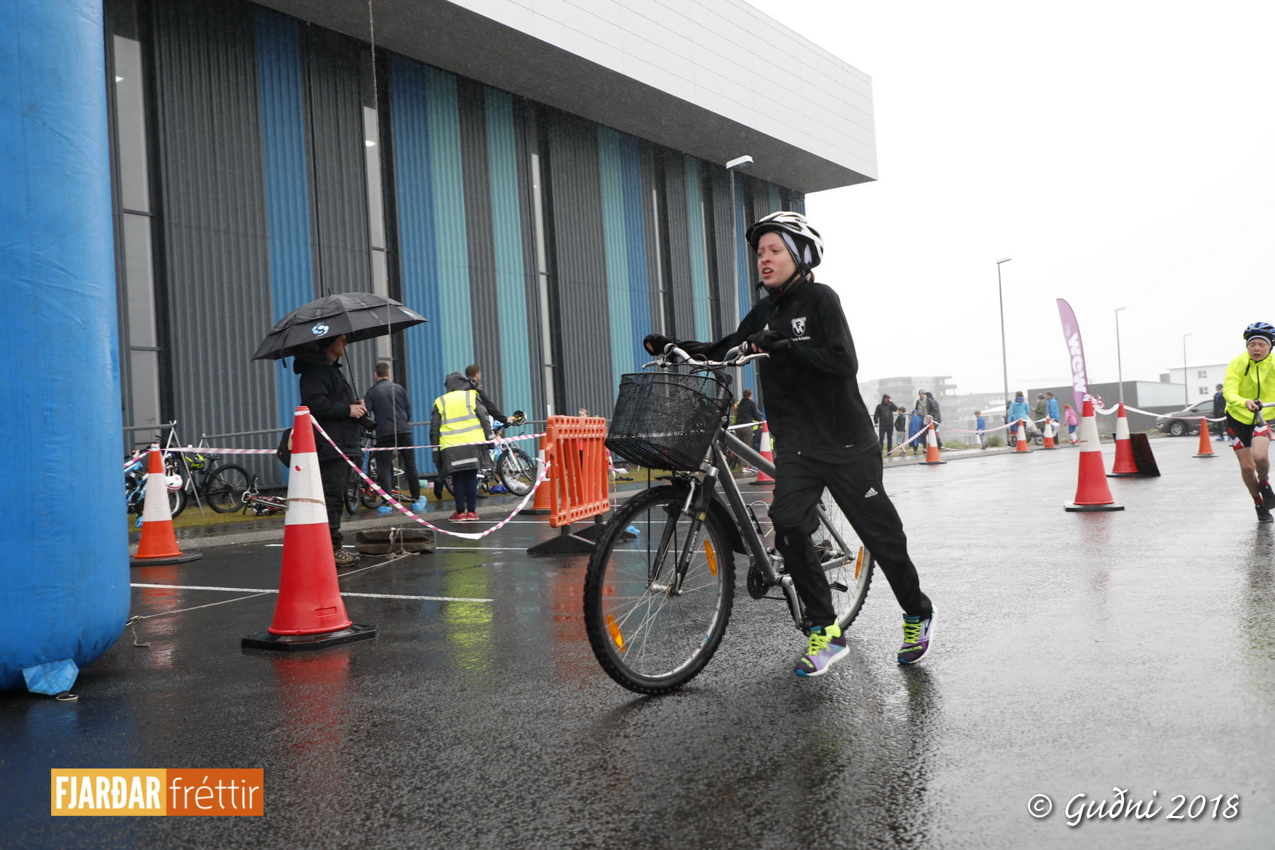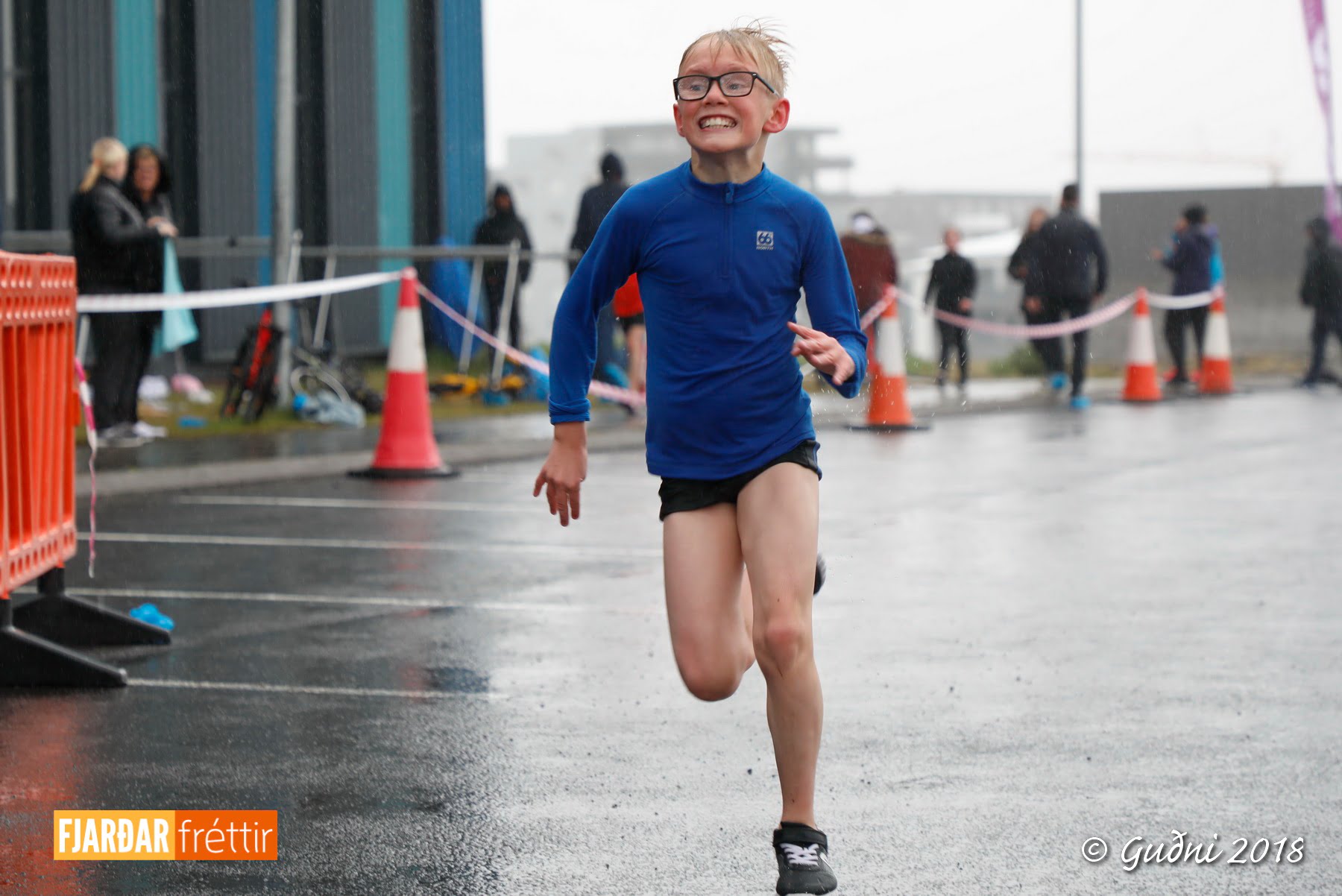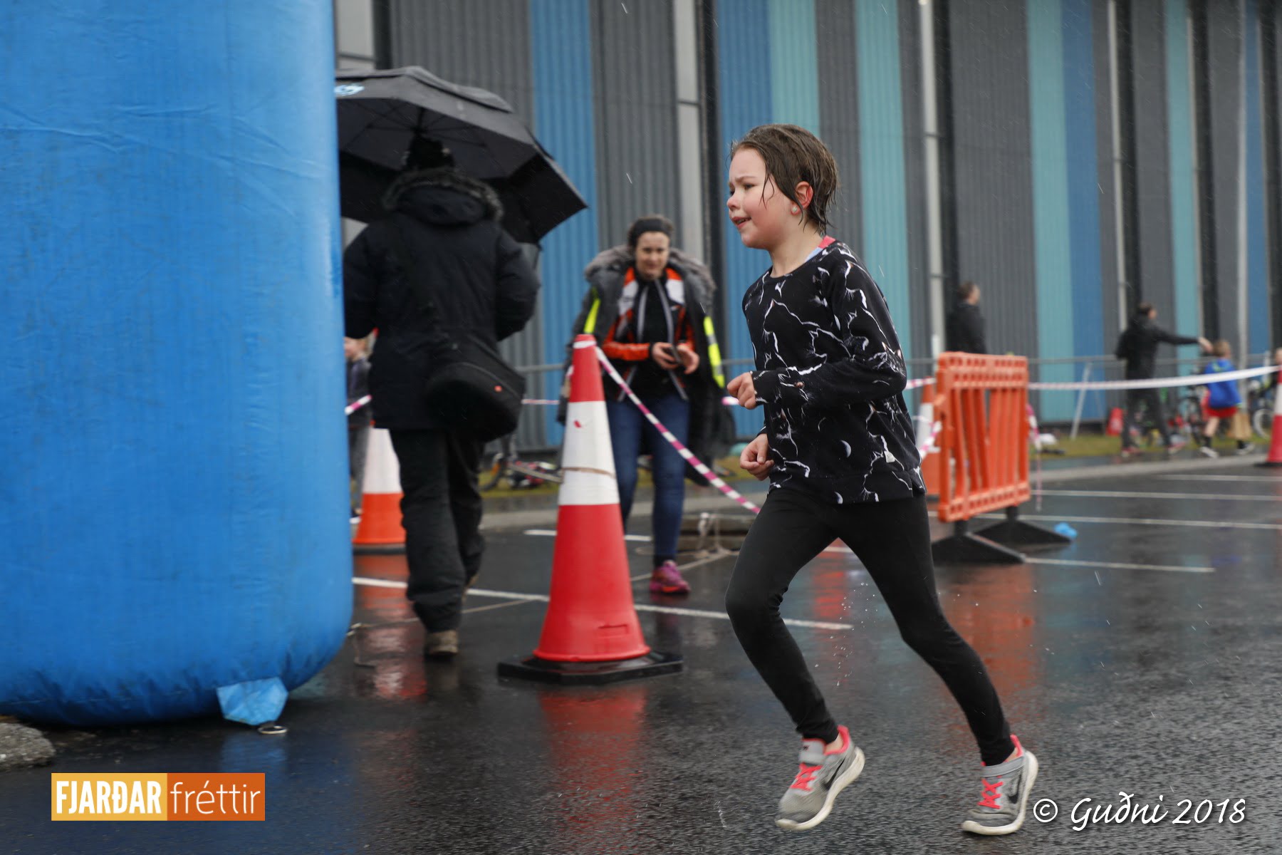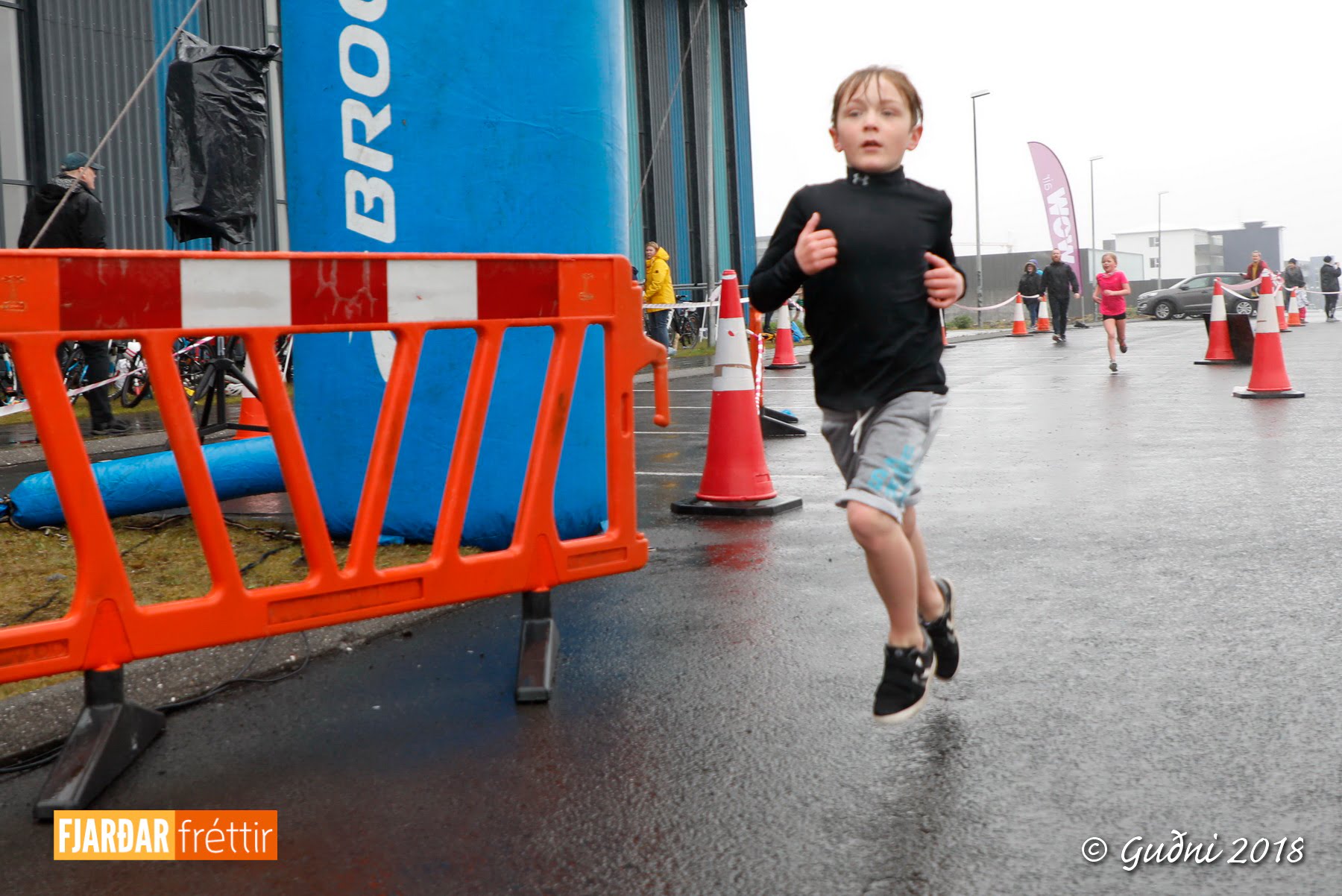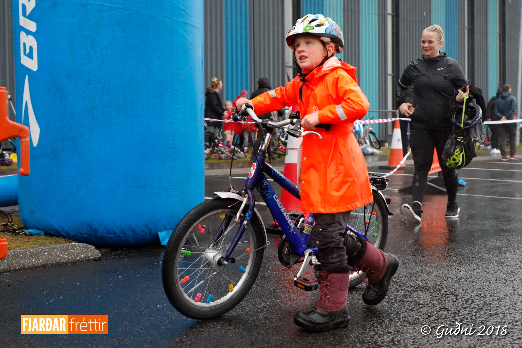Keppni hófst með sundi en þaðan hröðuðu krakkarnir sér út, settu á sig hjálm og hjóluðu í kringum sundlaugarbygginguna. Lokagreinin var svo hlaup og keppendur voru ekki alltaf að gefa sér tíma til að skipta um föt og sundfötin stundum látin duga. Það hellirigndi á meðan á keppninni stóð en krakkarnir létu það ekkert á sig fá.
