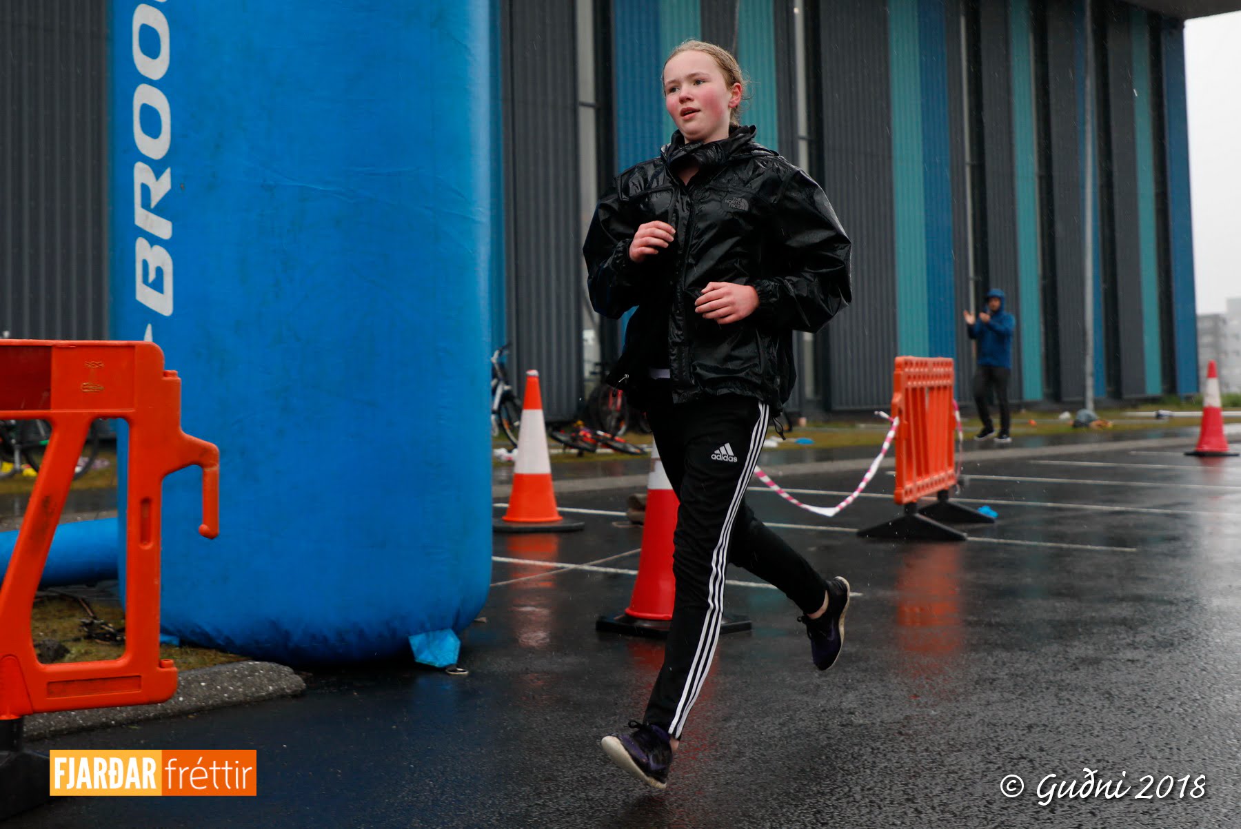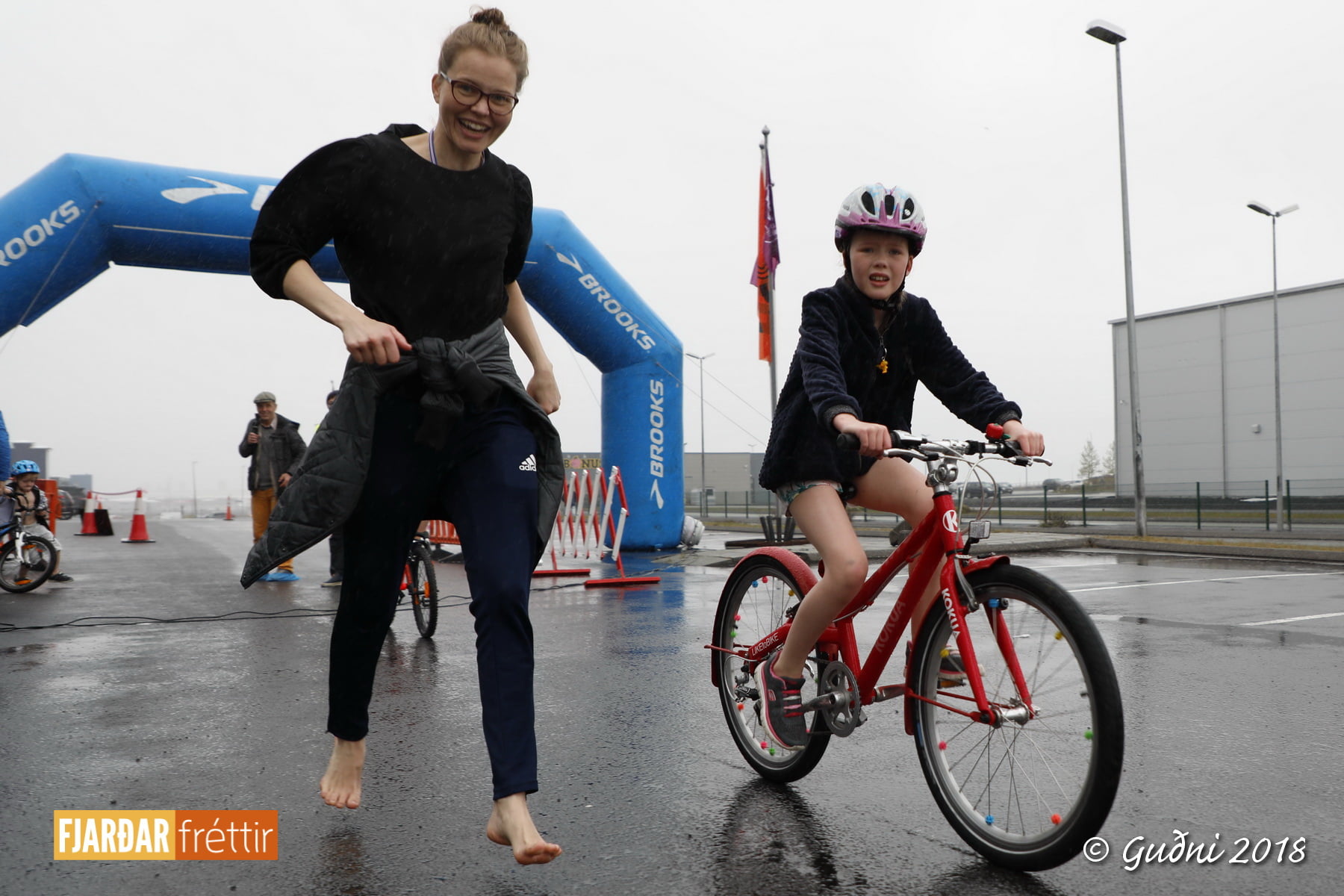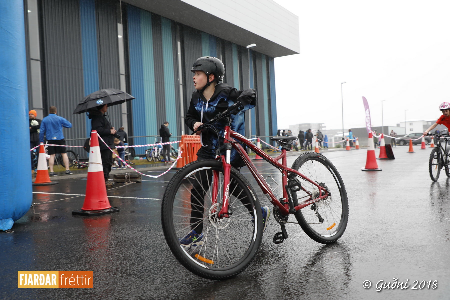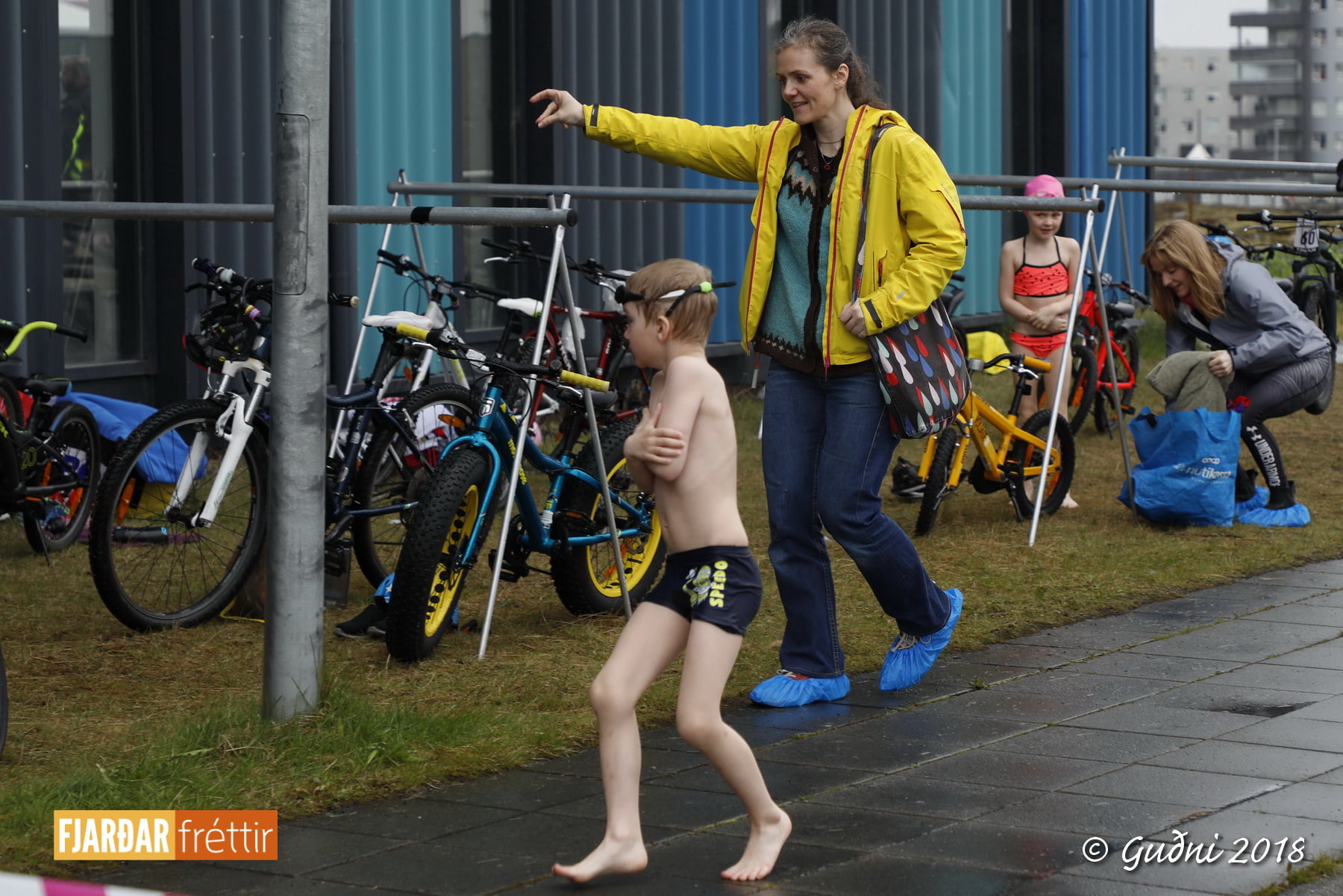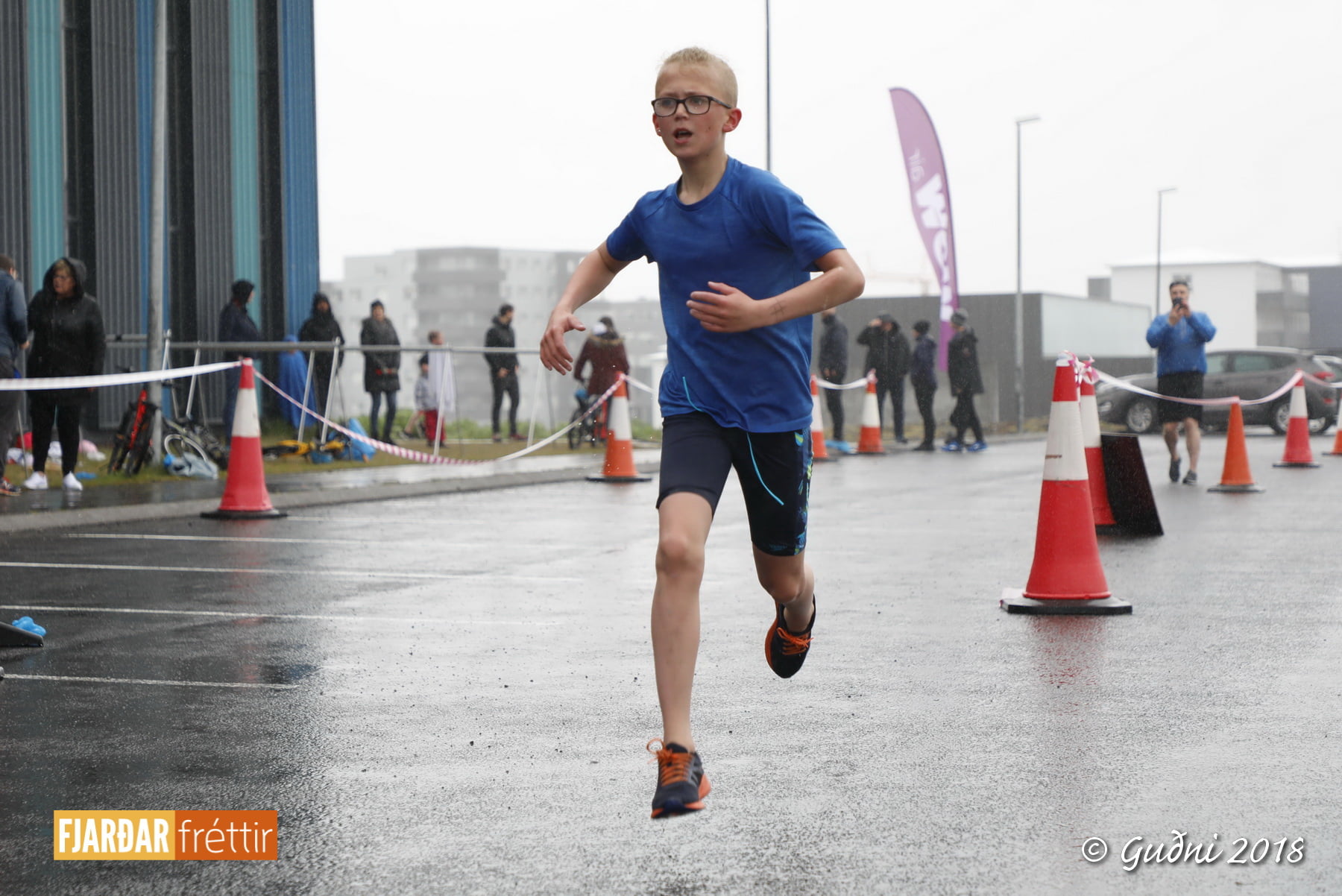 Keppni hófst með sundi en þaðan hröðuðu krakkarnir sér út, settu á sig hjálm og hjóluðu í kringum sundlaugarbygginguna. Lokagreinin var svo hlaup og keppendur voru ekki alltaf að gefa sér tíma til að skipta um föt og sundfötin stundum látin duga. Það hellirigndi á meðan á keppninni stóð en krakkarnir létu það ekkert á sig fá.