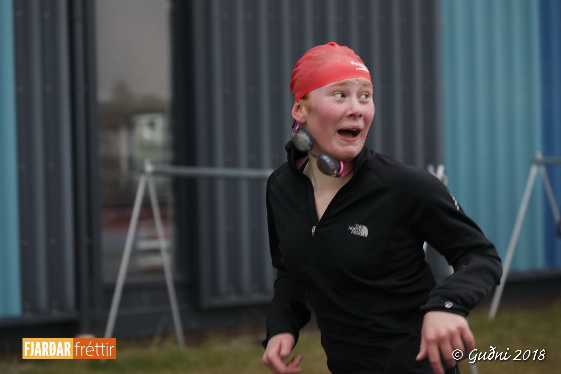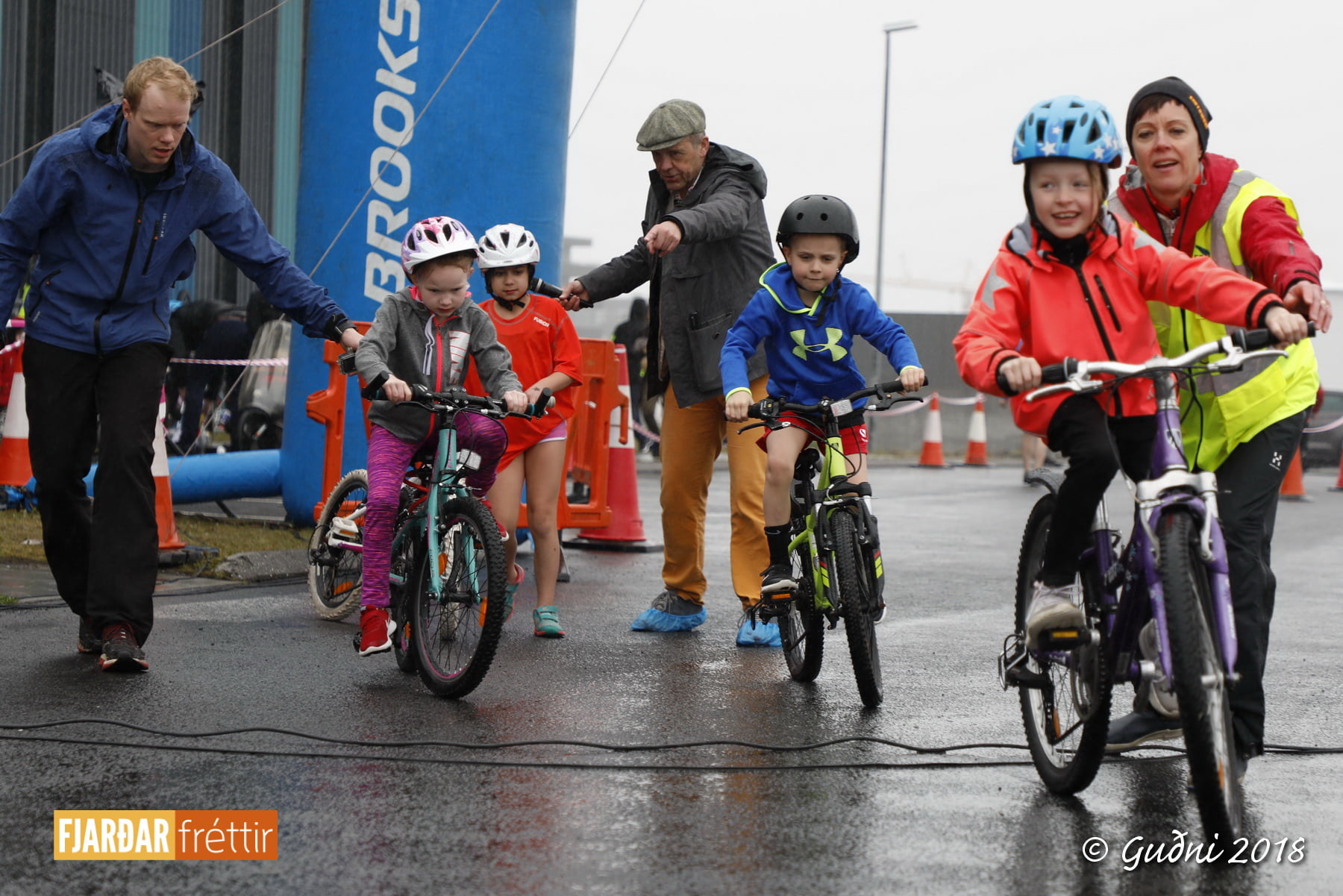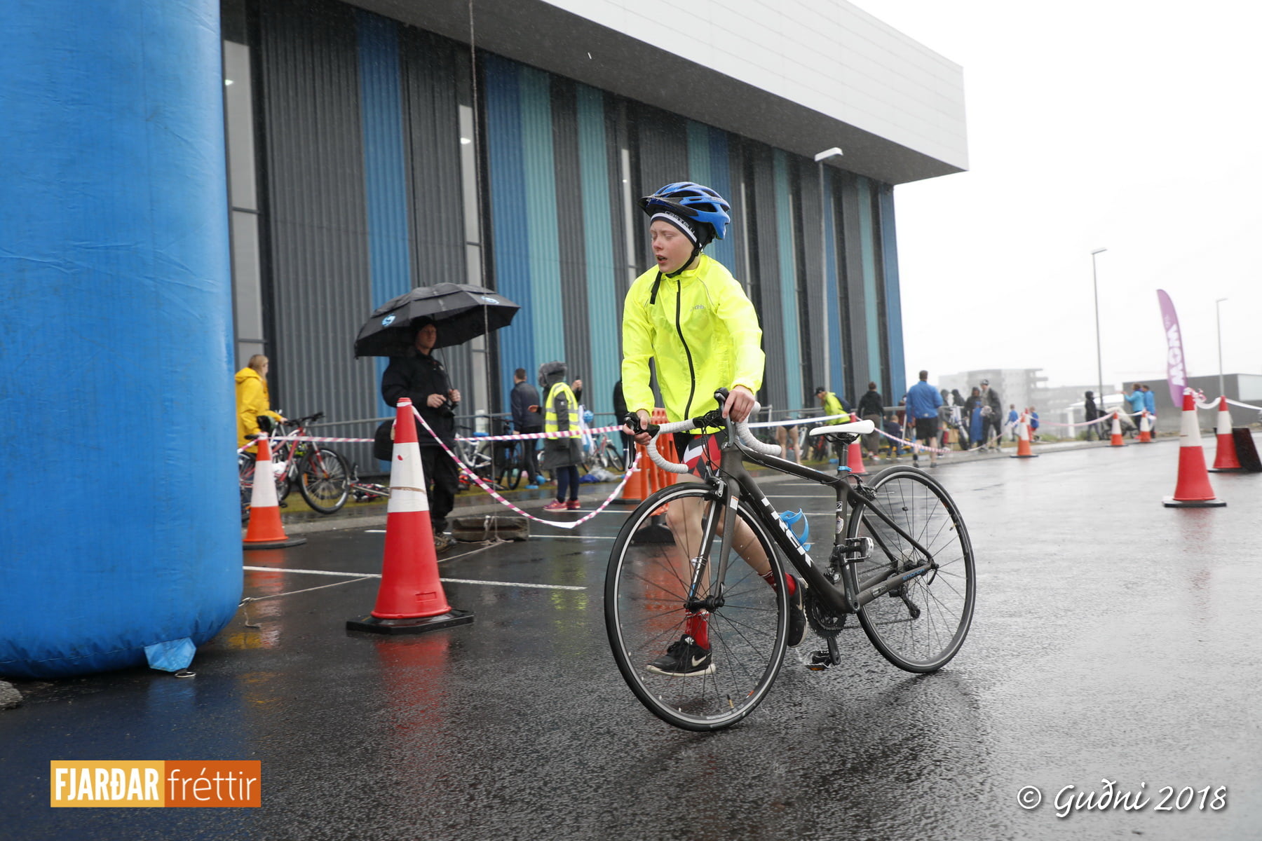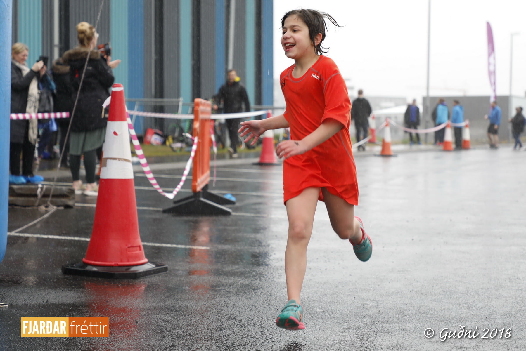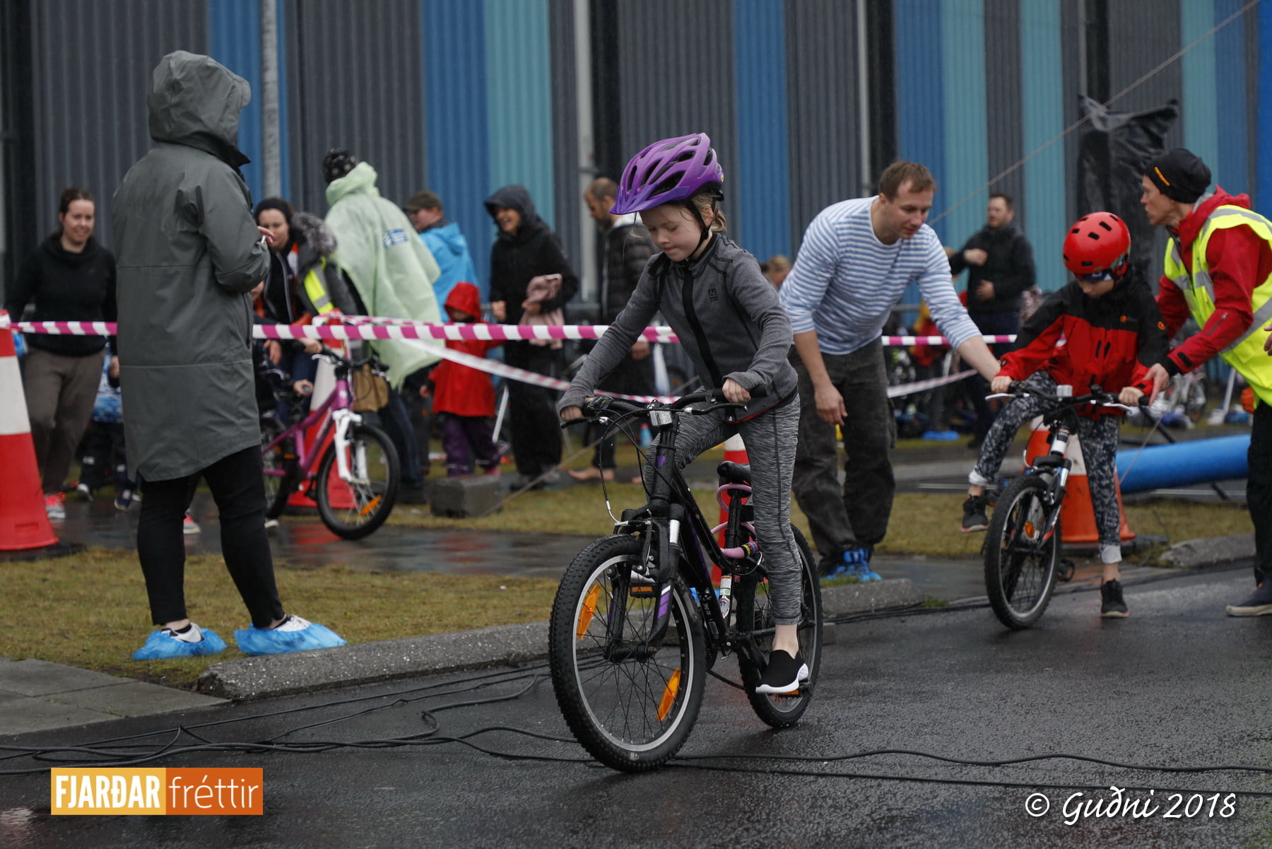 Keppni hófst með sundi en þaðan hröðuðu krakkarnir sér út, settu á sig hjálm og hjóluðu í kringum sundlaugarbygginguna. Lokagreinin var svo hlaup og keppendur voru ekki alltaf að gefa sér tíma til að skipta um föt og sundfötin stundum látin duga. Það hellirigndi á meðan á keppninni stóð en krakkarnir létu það ekkert á sig fá.