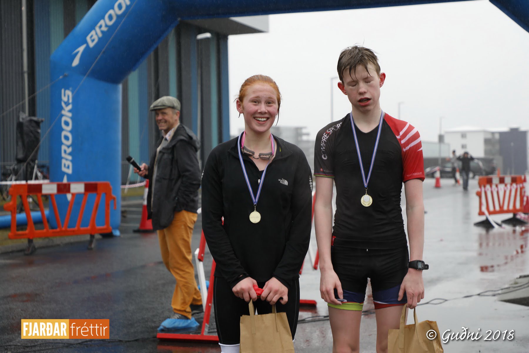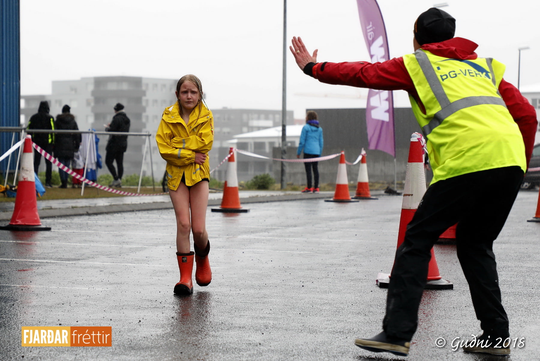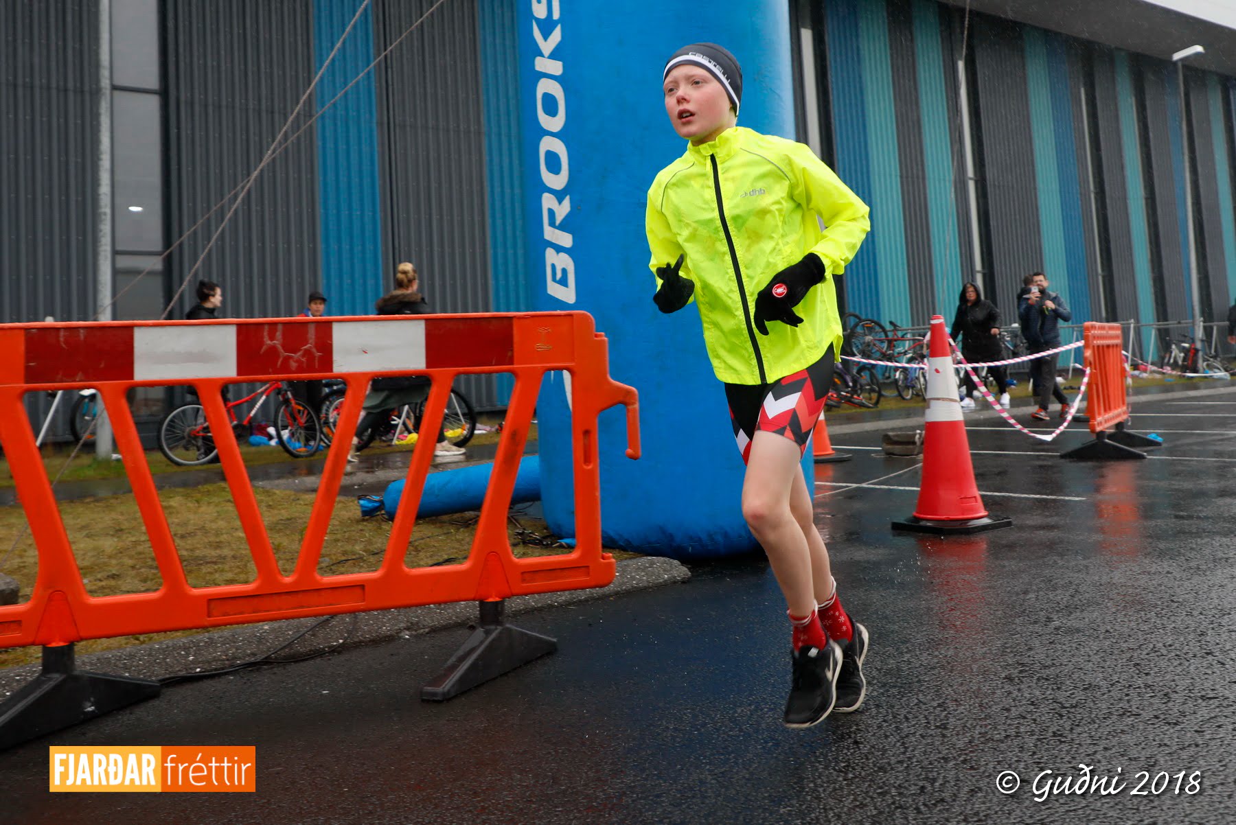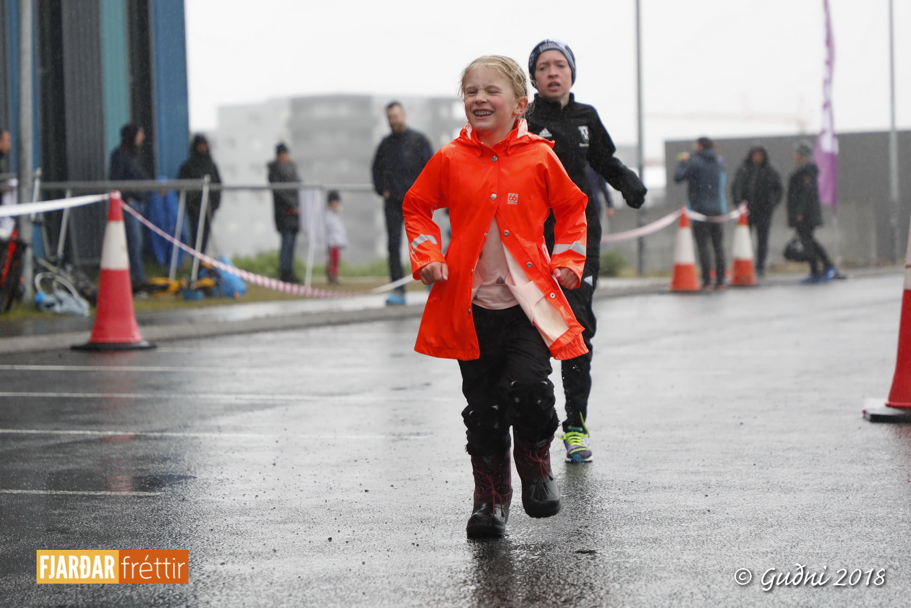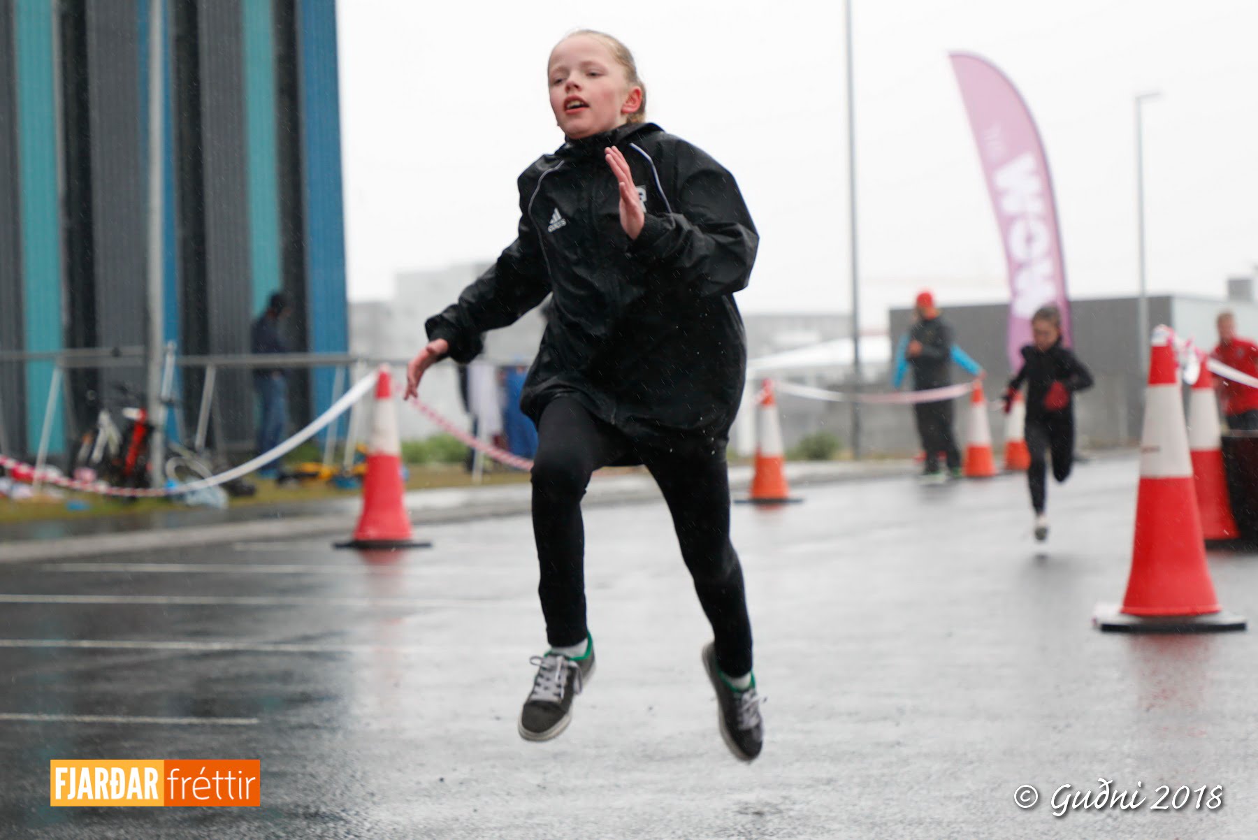 Keppni hófst með sundi en þaðan hröðuðu krakkarnir sér út, settu á sig hjálm og hjóluðu í kringum sundlaugarbygginguna. Lokagreinin var svo hlaup og keppendur voru ekki alltaf að gefa sér tíma til að skipta um föt og sundfötin stundum látin duga. Það hellirigndi á meðan á keppninni stóð en krakkarnir létu það ekkert á sig fá.
