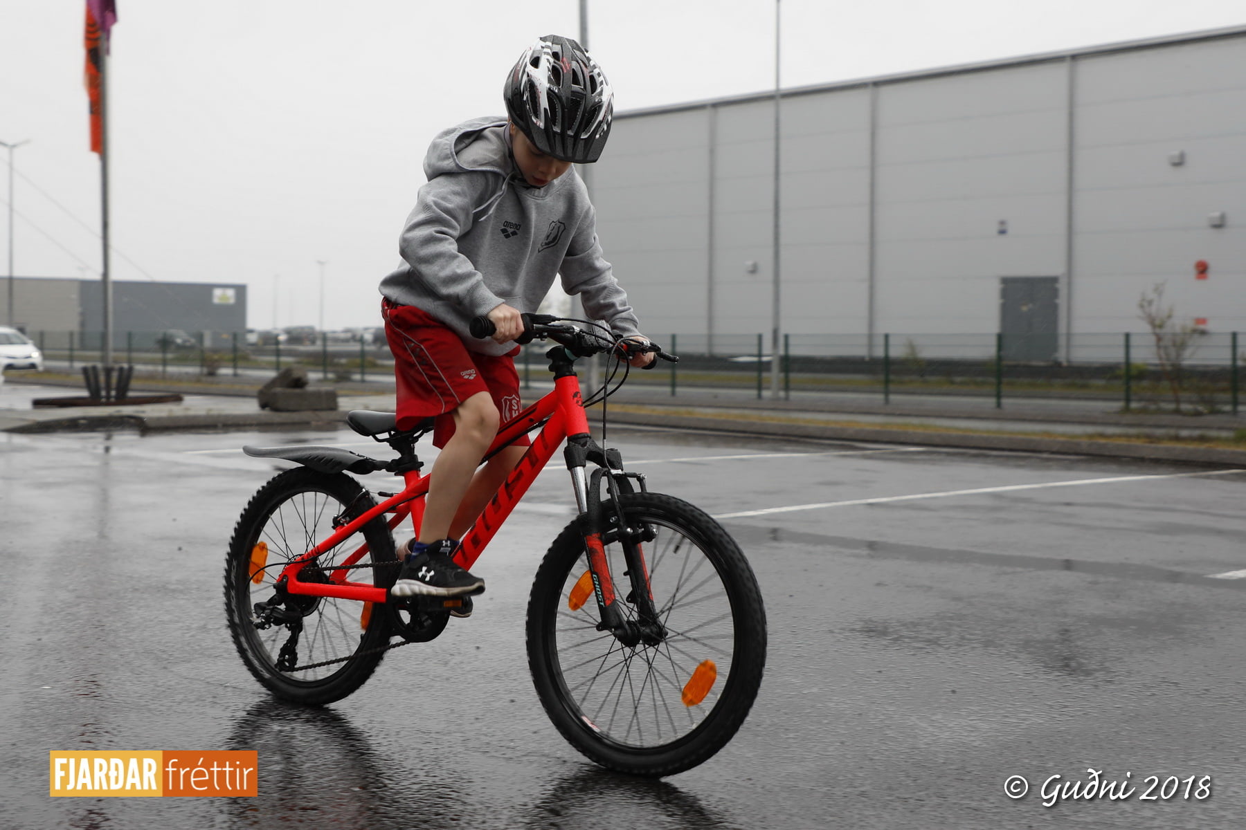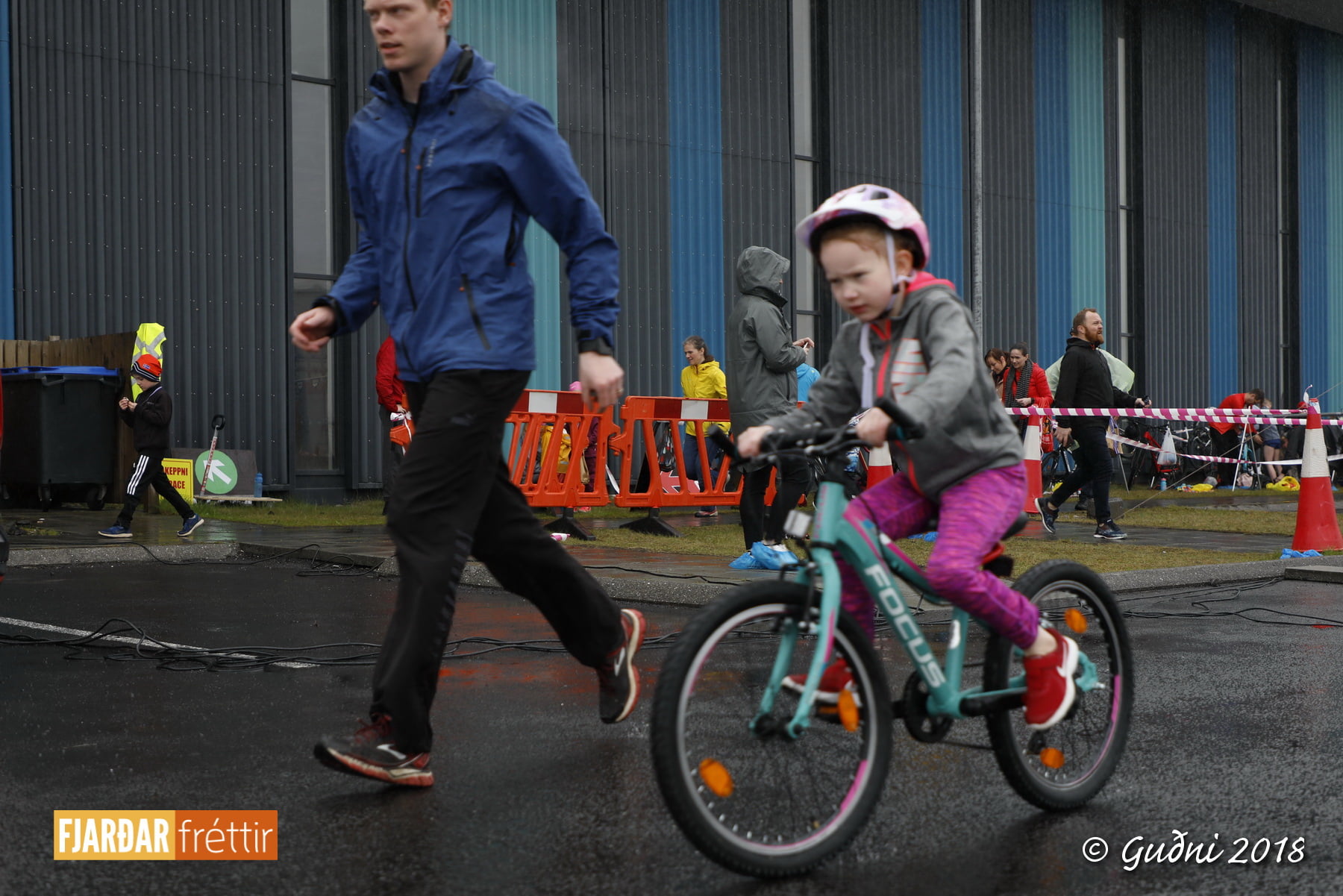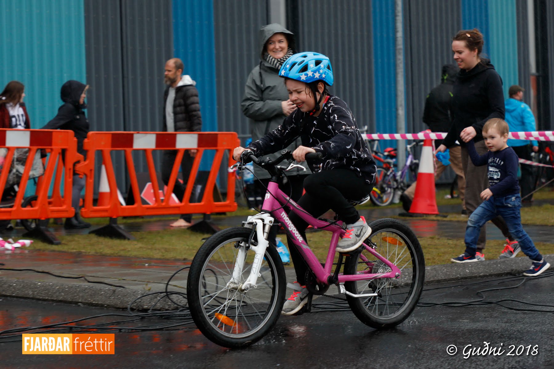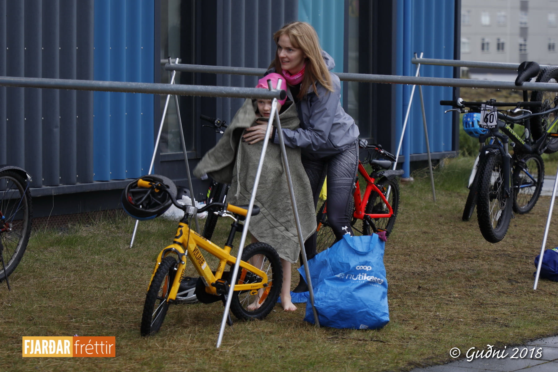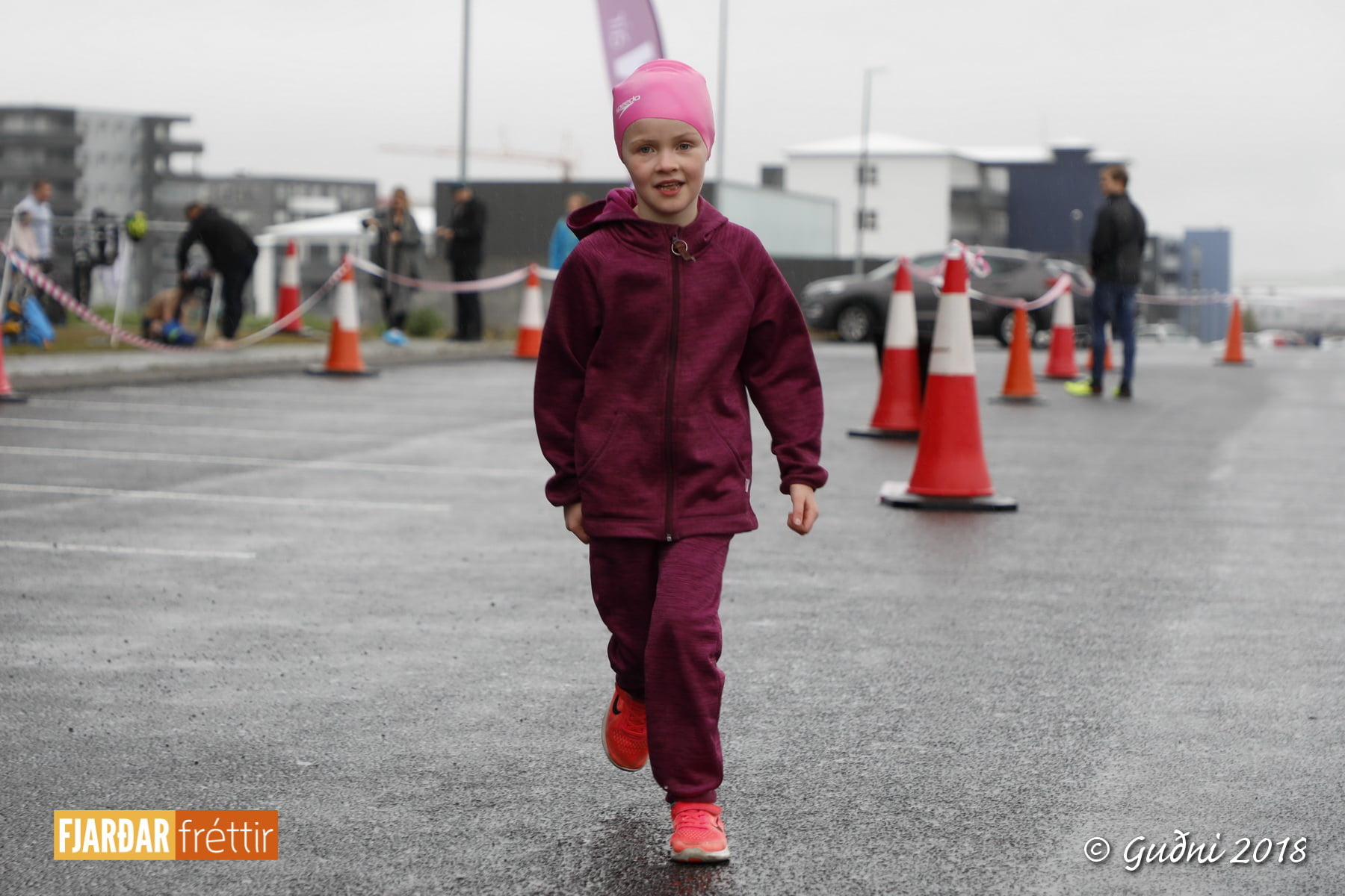 Keppni hófst með sundi en þaðan hröðuðu krakkarnir sér út, settu á sig hjálm og hjóluðu í kringum sundlaugarbygginguna. Lokagreinin var svo hlaup og keppendur voru ekki alltaf að gefa sér tíma til að skipta um föt og sundfötin stundum látin duga. Það hellirigndi á meðan á keppninni stóð en krakkarnir létu það ekkert á sig fá.