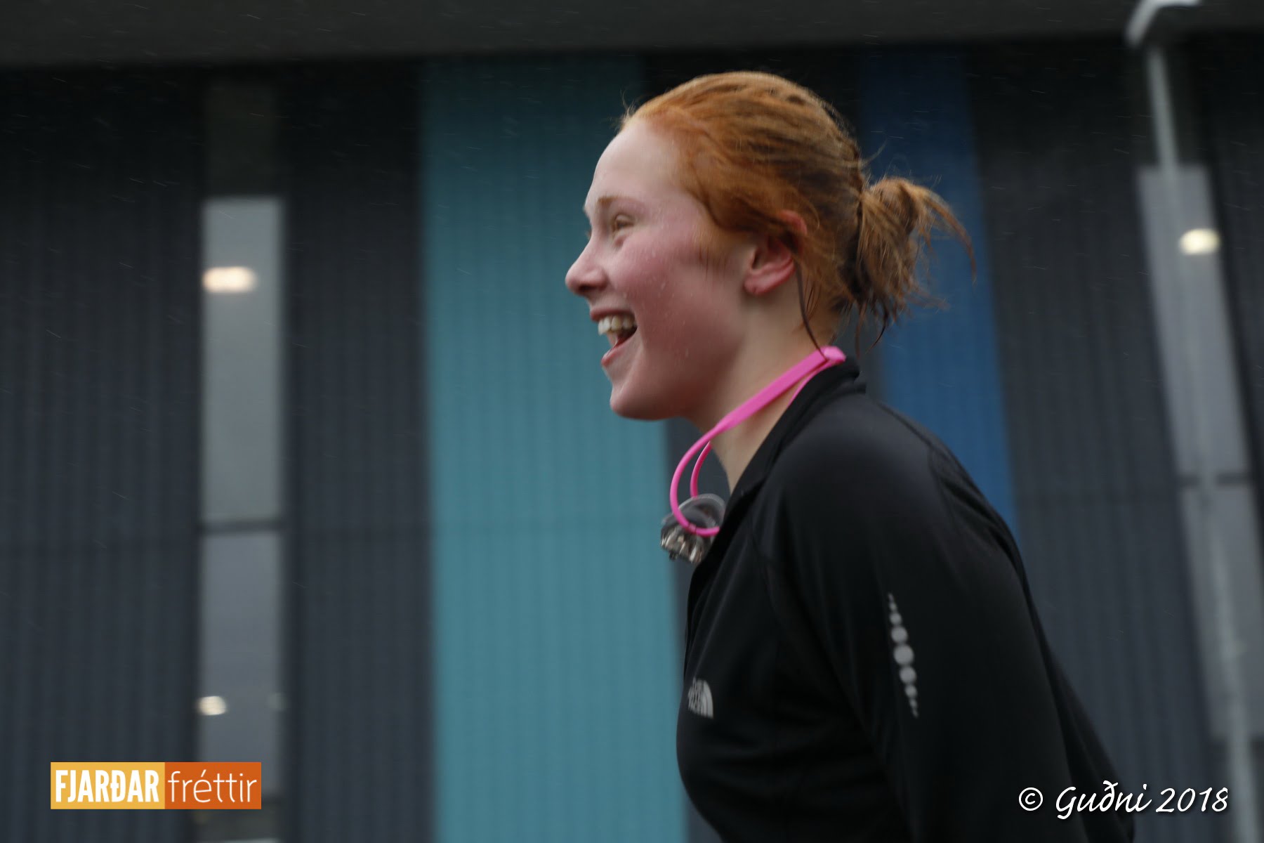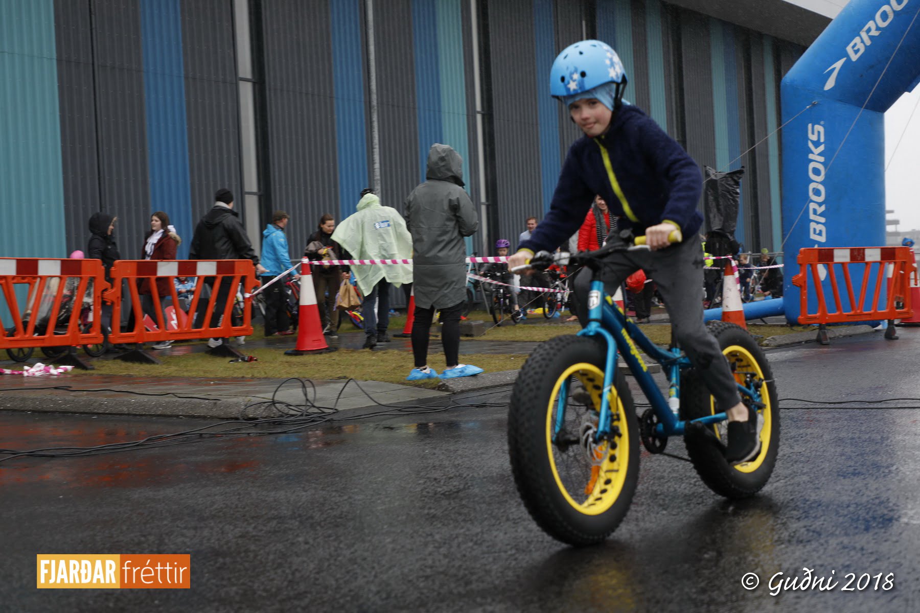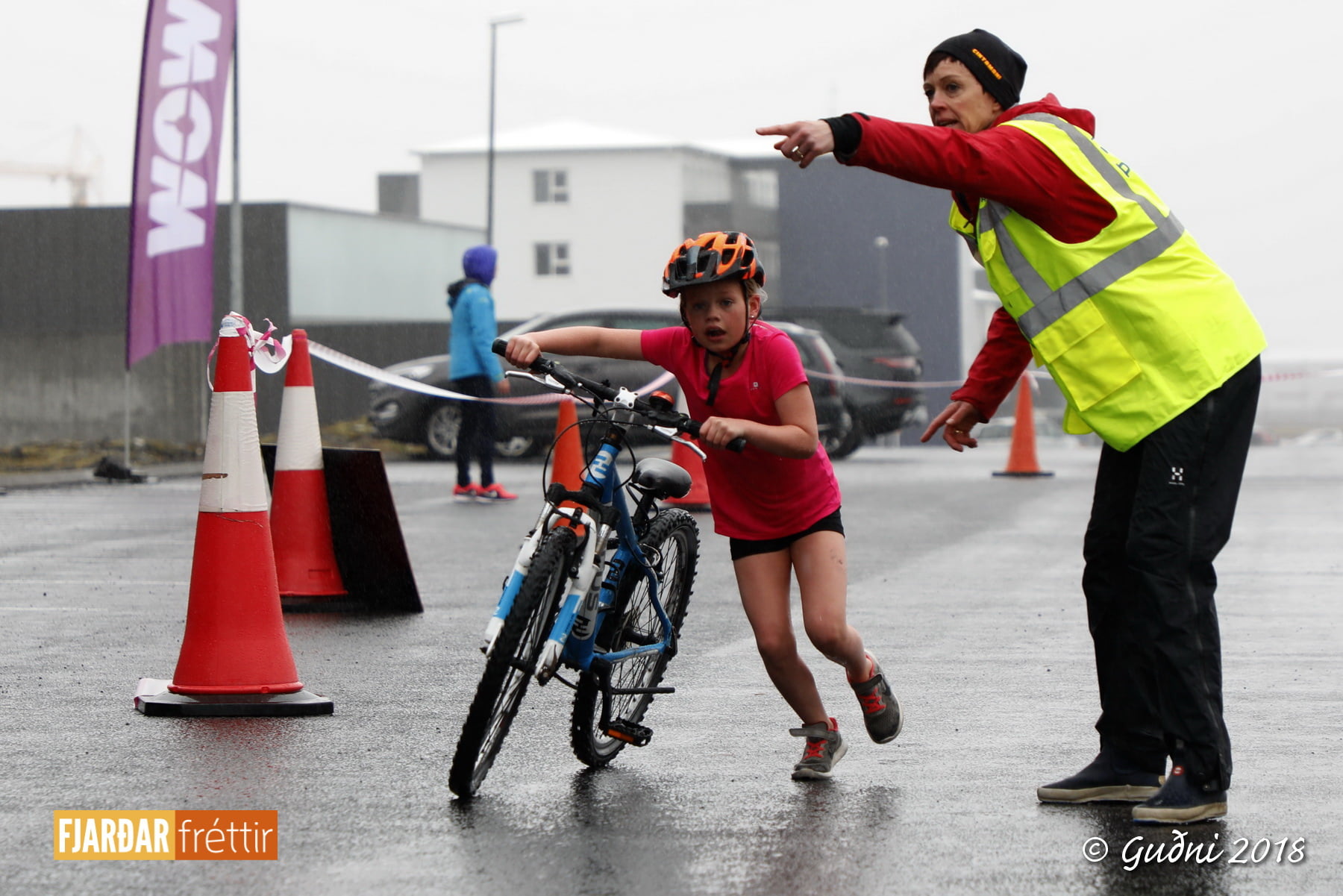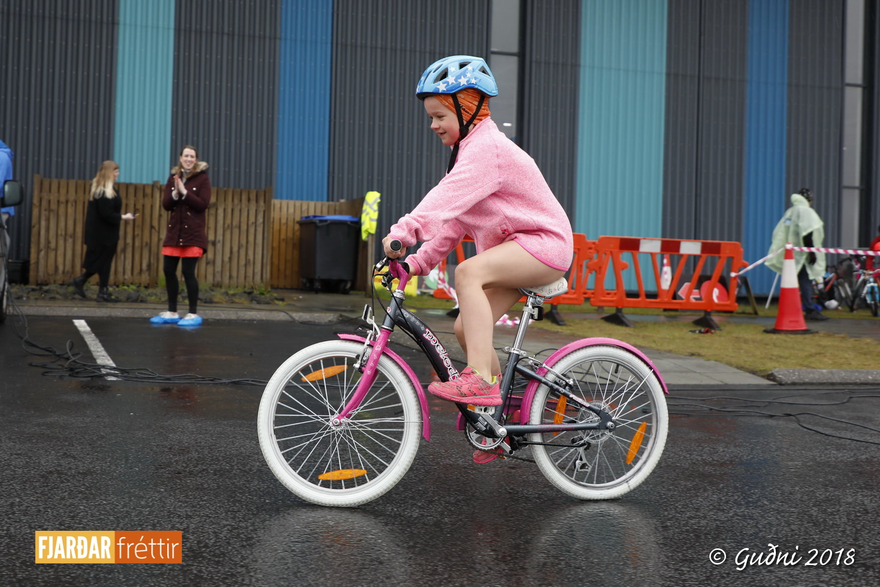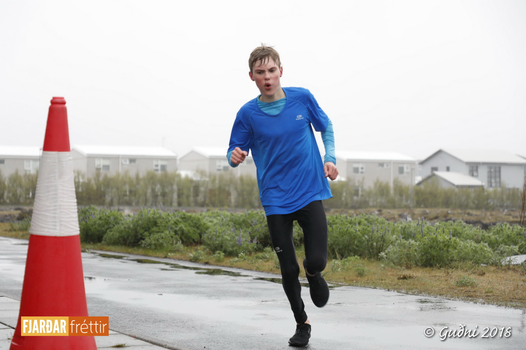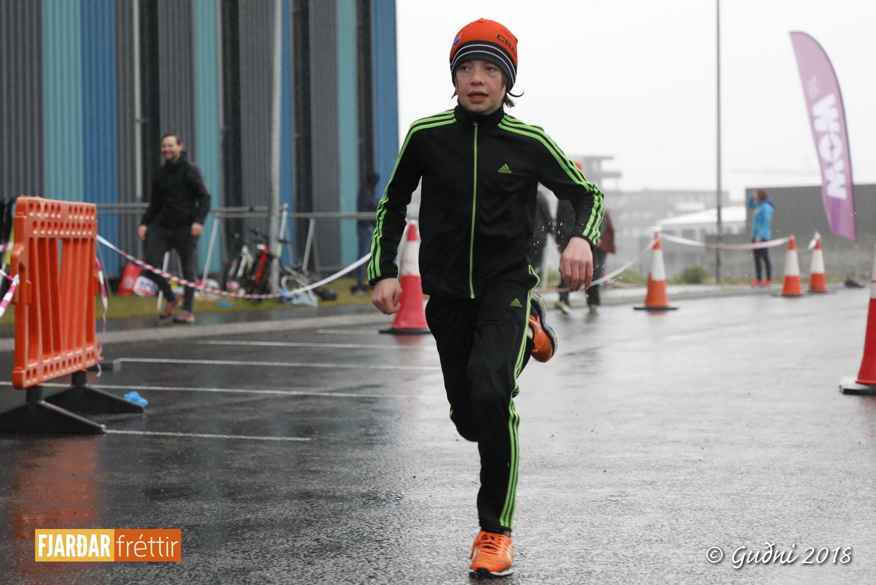 Keppni hófst með sundi en þaðan hröðuðu krakkarnir sér út, settu á sig hjálm og hjóluðu í kringum sundlaugarbygginguna. Lokagreinin var svo hlaup og keppendur voru ekki alltaf að gefa sér tíma til að skipta um föt og sundfötin stundum látin duga. Það hellirigndi á meðan á keppninni stóð en krakkarnir létu það ekkert á sig fá.