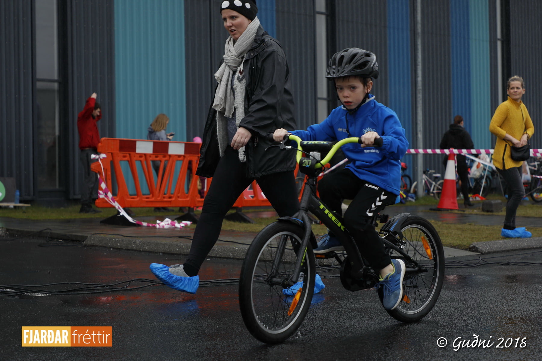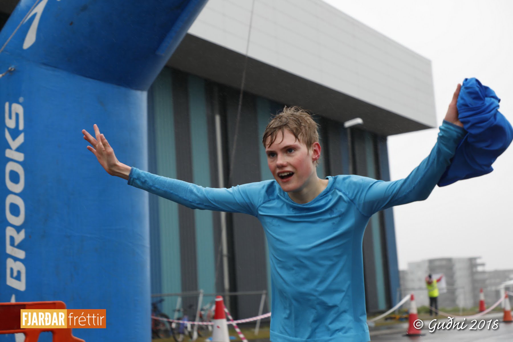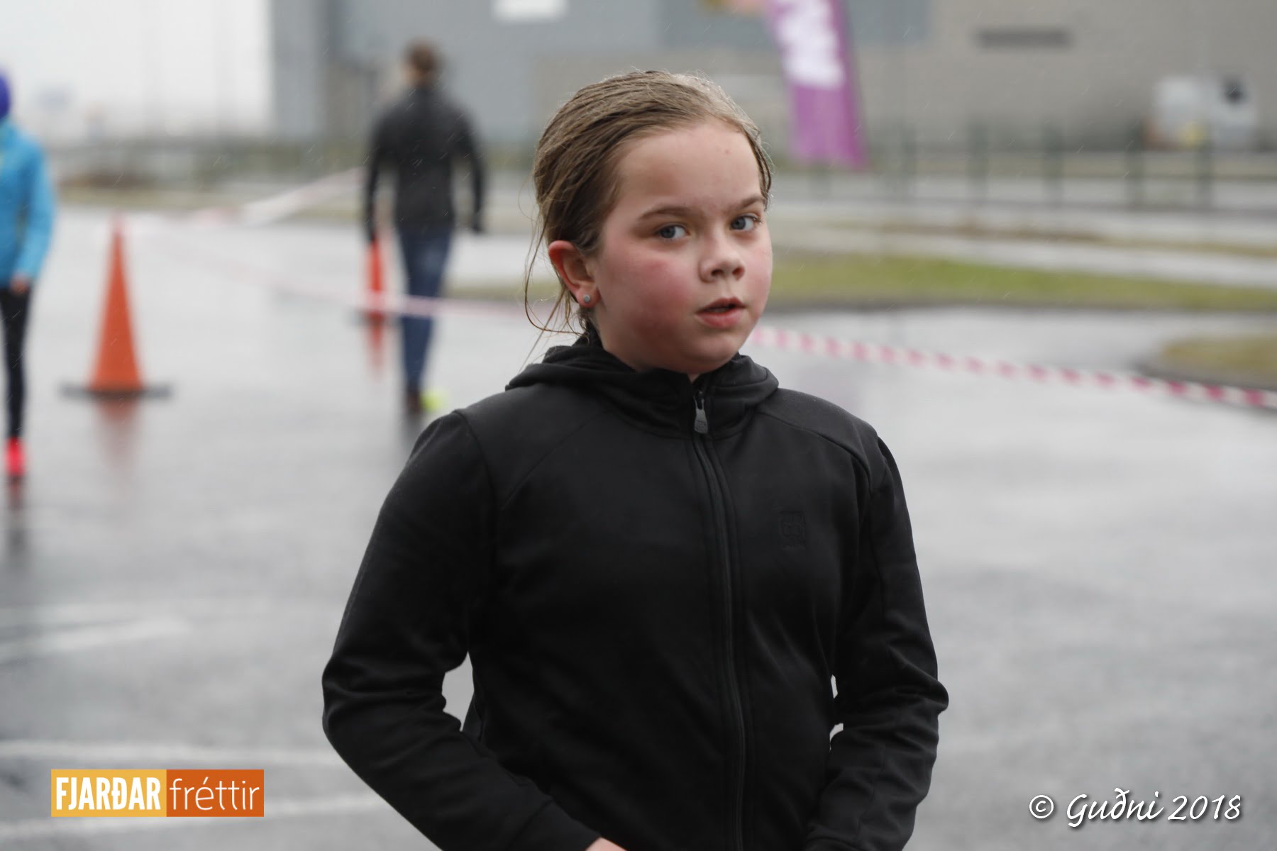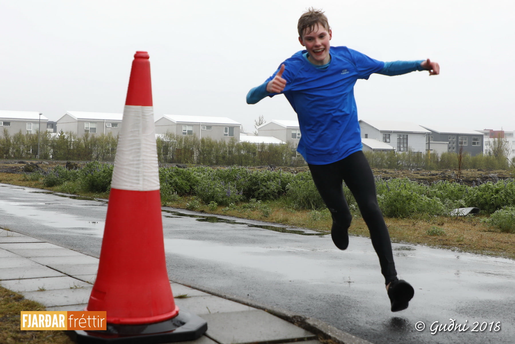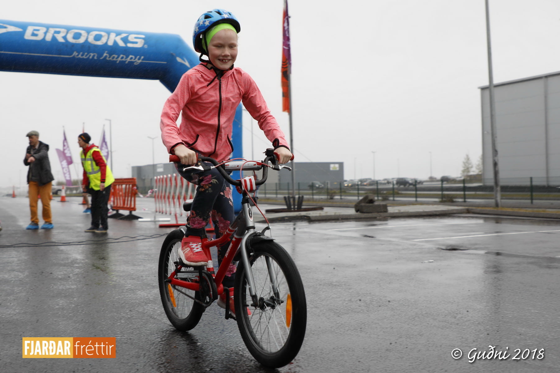 Keppni hófst með sundi en þaðan hröðuðu krakkarnir sér út, settu á sig hjálm og hjóluðu í kringum sundlaugarbygginguna. Lokagreinin var svo hlaup og keppendur voru ekki alltaf að gefa sér tíma til að skipta um föt og sundfötin stundum látin duga. Það hellirigndi á meðan á keppninni stóð en krakkarnir létu það ekkert á sig fá.