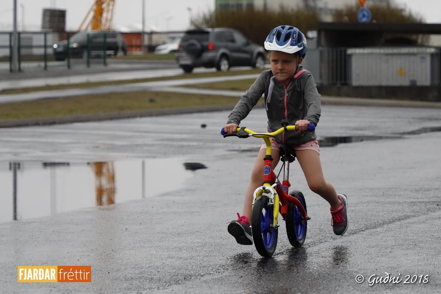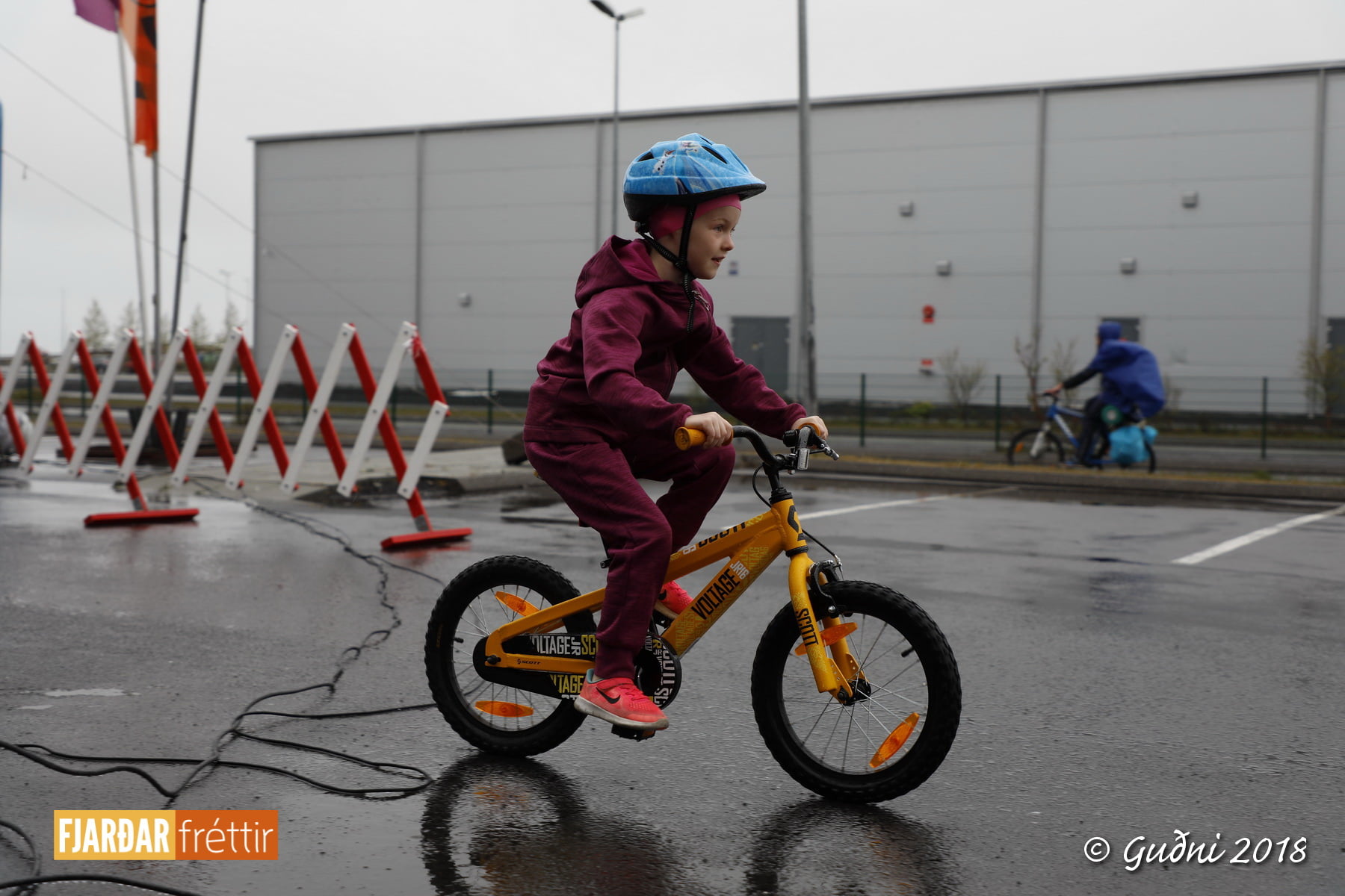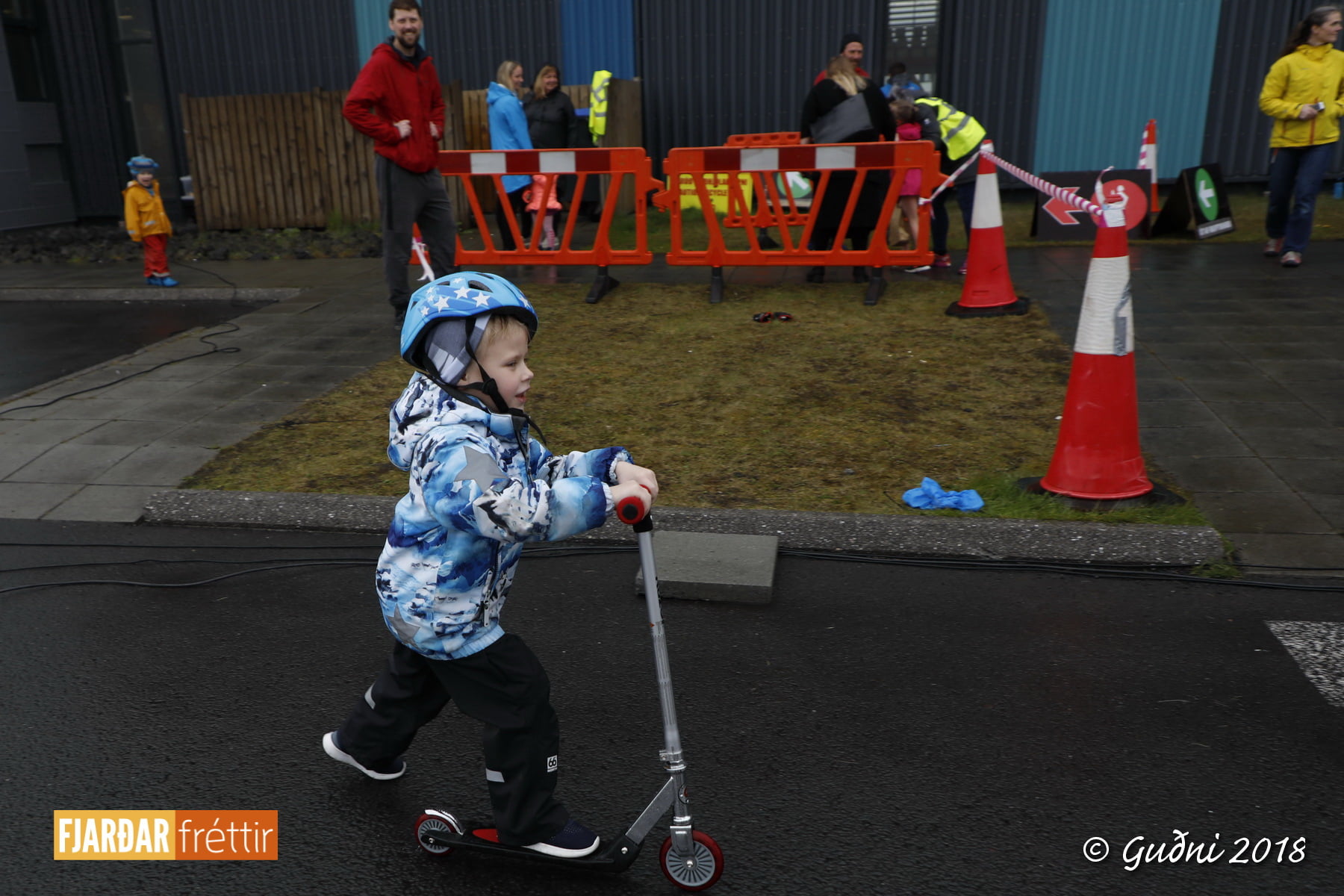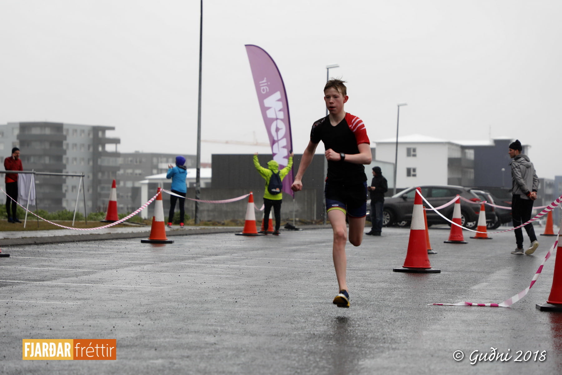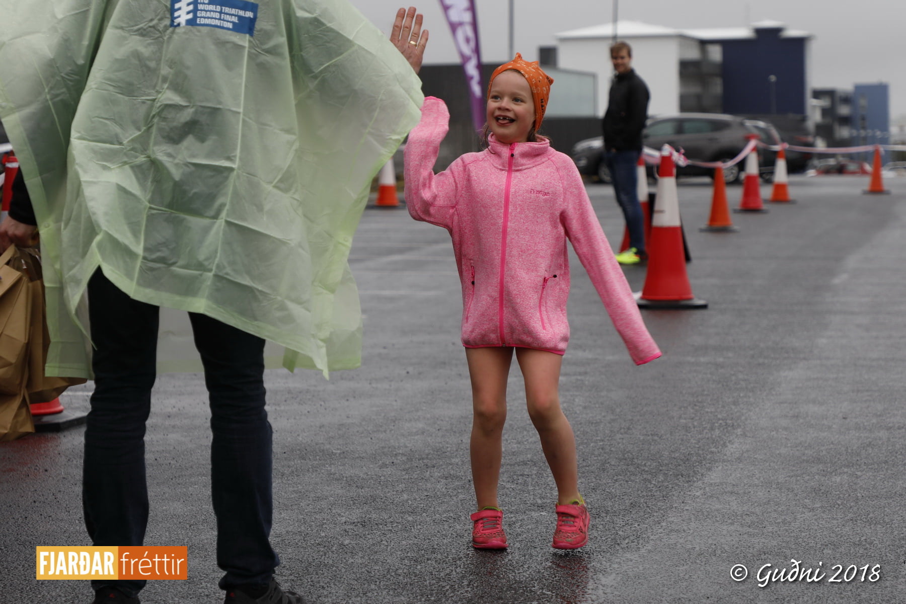 Keppni hófst með sundi en þaðan hröðuðu krakkarnir sér út, settu á sig hjálm og hjóluðu í kringum sundlaugarbygginguna. Lokagreinin var svo hlaup og keppendur voru ekki alltaf að gefa sér tíma til að skipta um föt og sundfötin stundum látin duga. Það hellirigndi á meðan á keppninni stóð en krakkarnir létu það ekkert á sig fá.