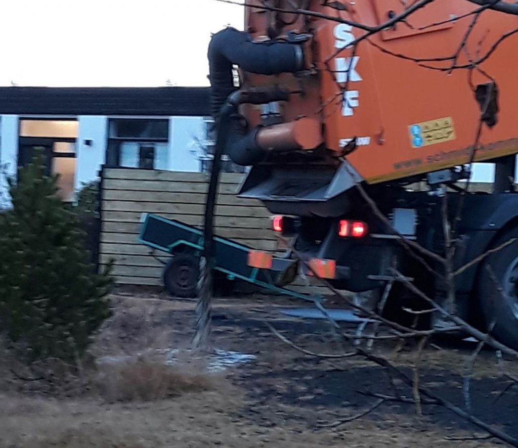 Íbúi sendi Fjarðarfréttum meðfylgjandi myndir sem sýnir bíl frá Íslenska Gámafélaginu losa úr tanki bílsins við enda botnlangagötu á Álfaskeði, rétt við göngustíg.