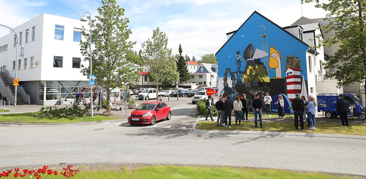 Verk Joans á gafli Strandgötu 4 vekur athygli á fjölmörgum listaverkum víða um Hafnarfjörð og fagnaði bæjarstjóri þessu framtaki í dag.