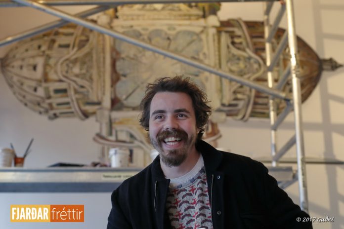 Á veitingastaðnum Bike cave í Hafnarborg er Stefán Óli Baldursson (27) götulistamaður að mála stóra mynd á gafl inni í kaffihúsinu og blasir myndin við öllum sem koma inn í Hafnarborg bakdyramegin – frá Fjarðargötu.