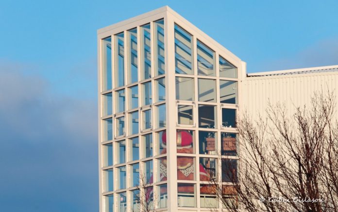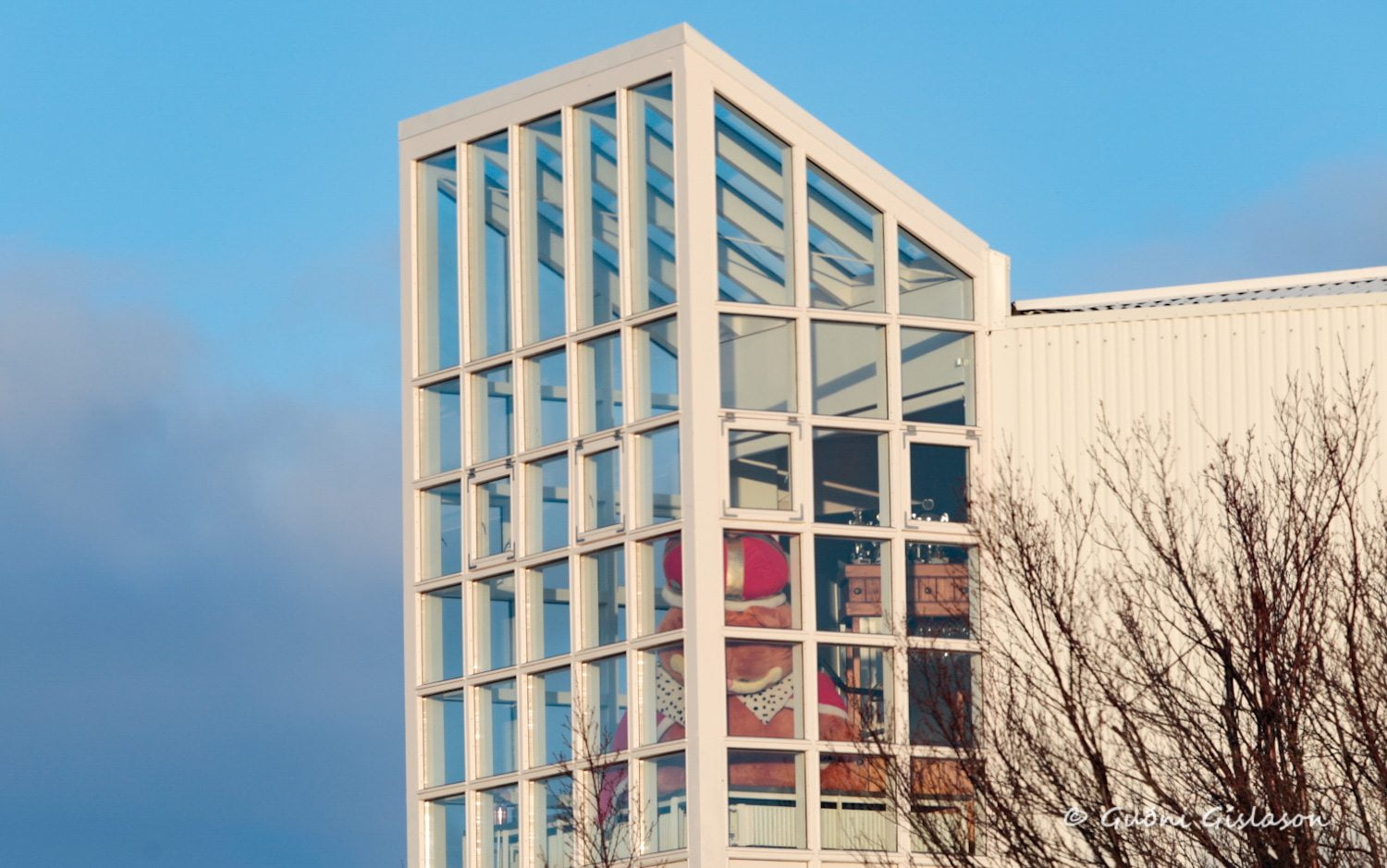 En í Klukkuberginu er enginn venjulegur bangsi, heldur risastór bangsi sem situr makindalega út við gólfsíðan glugga í húsi einu og vekur athygli þeirra sem þarna fara hjá.