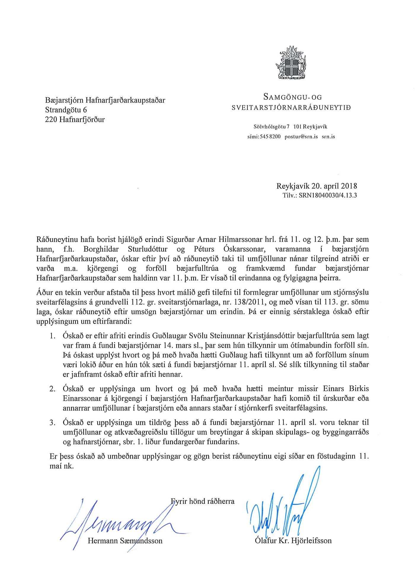 - Ráðuneytið óskar eftir upplýsingum um hvort og þá með hvaða hætti meintur missir Einars Birkis Einarssonar á kjörgengi í bæjarstjórn Hafnarfjarðarkaupstaðar hafi komið til úrskurðar eða annarrar umfjöllunar í bæjarstjórn eða annars staðar í stjórnkerfi sveitarfélagsins.