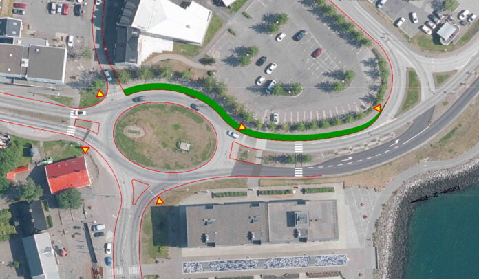 Nú hefur umhverfis- og framkvæmdaráð samþykkt tillögu Vegagerðarinnar að þrengingu götunnar í eina akrein en skv. meðfylgjandi teikningu má sjá að gangbrautin er færð fjær hringtorginu án þess að skýring sé gefin á þeirri tilfærslu. Tillagan var fyrst lögð fram á fundi ráðsins 24. mars sl.