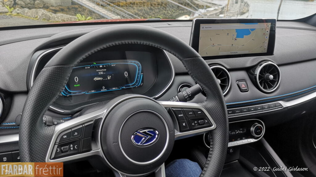 Blaðamaður Fjarðarfrétta fór í stuttan reynsluakstur á bílnum og reyndist hann mjög þægilegur í akstri. Hann er með þrjár ökustillingar, eco, normal og sport. Sennilega myndu flestir aka honum í normal stillingu þar sem hann er mjög hægur af stað í eco stillingunni. Í normal stillingunni er hann hins vegar mjög viðbragðssnöggur. Veghljóð er mjög lítið og aksturinn hinn þægilegasti, í góðum sætum og útsýni gott. Aðgengi að hinum ýmsu stillingum er gott og ekki þarf að leita í skjá eftir stillingu á miðstöðinni svo dæmi sé tekið.