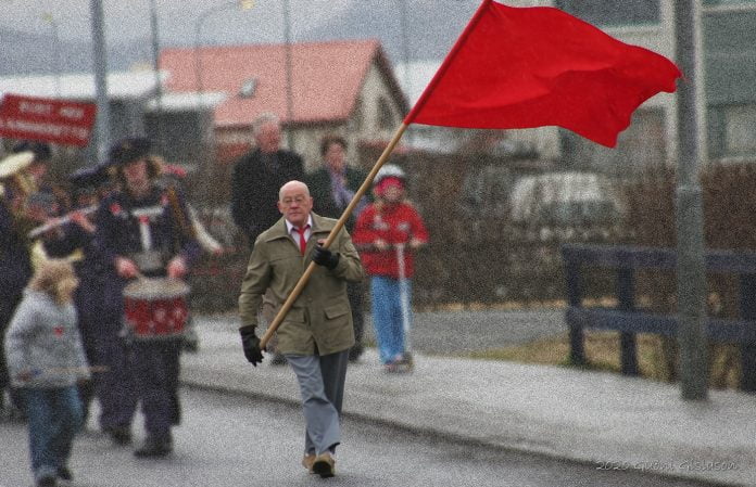 Sigurður Tryggvi Sigurðsson var ötull merkisberi verkalýðshreyfingarnar og gekk fjölda ára með rauða fánann 1. maí í Hafnarfirði. – Ljósm.: Guðni Gíslason