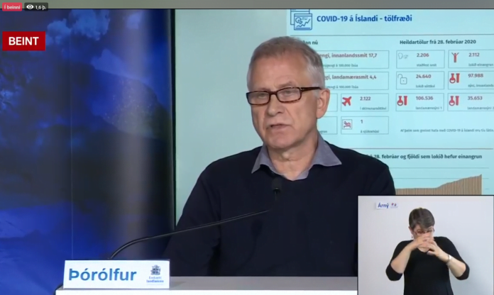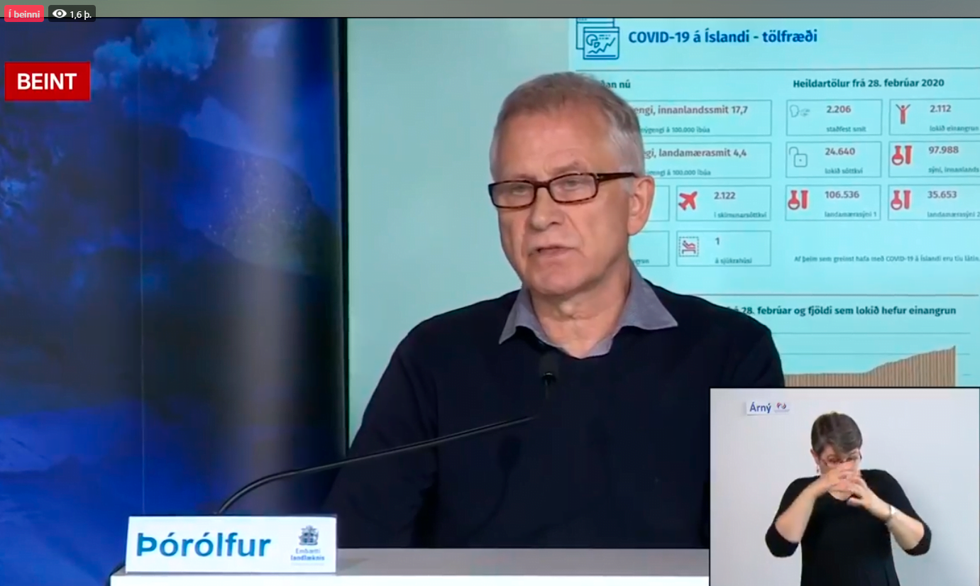 Hvatti hann einnig fólk til að virða reglur og beita almennri skynsemi. Fólk sem er með einhver einkenni eiga alls ekki að mæta til vinnu að sögn Þórólfs sem hvatti fólk eindregið til að nota grímur í margmenni þar sem erfitt væri að framfylgja eins metra fjarlægðarreglunni og þar sem loftræsting væri ekki góð.
