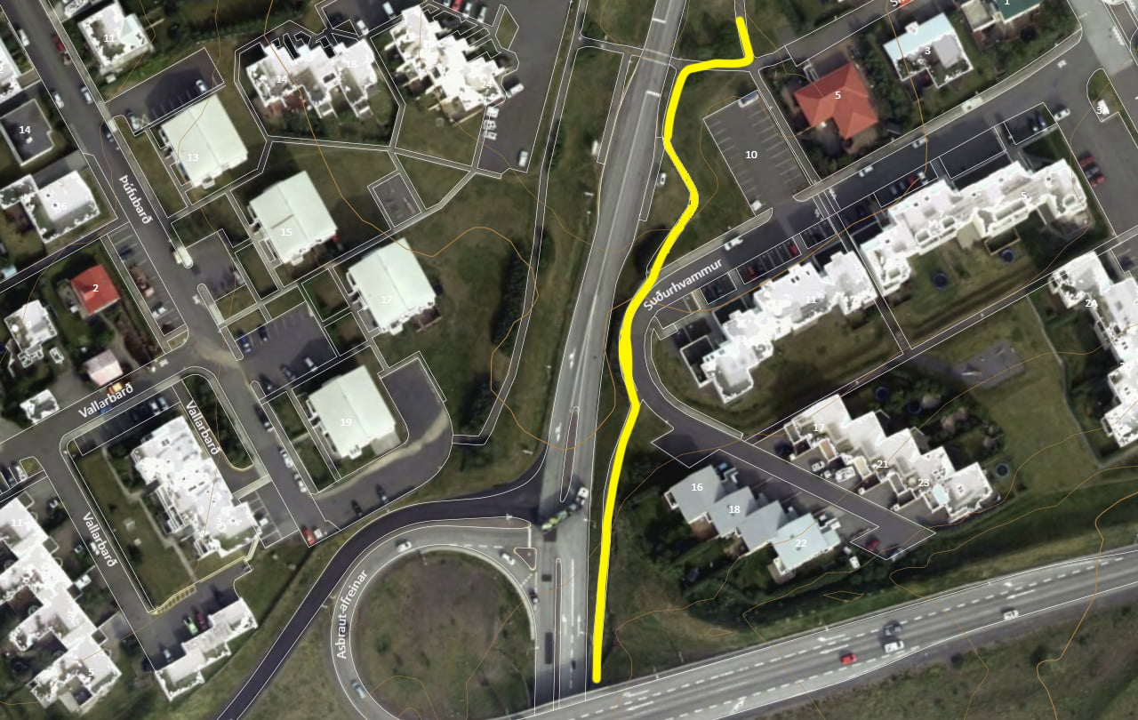 Hér má sjá hvernig núverandi stígur hlykkjast um götur og hæðir.
