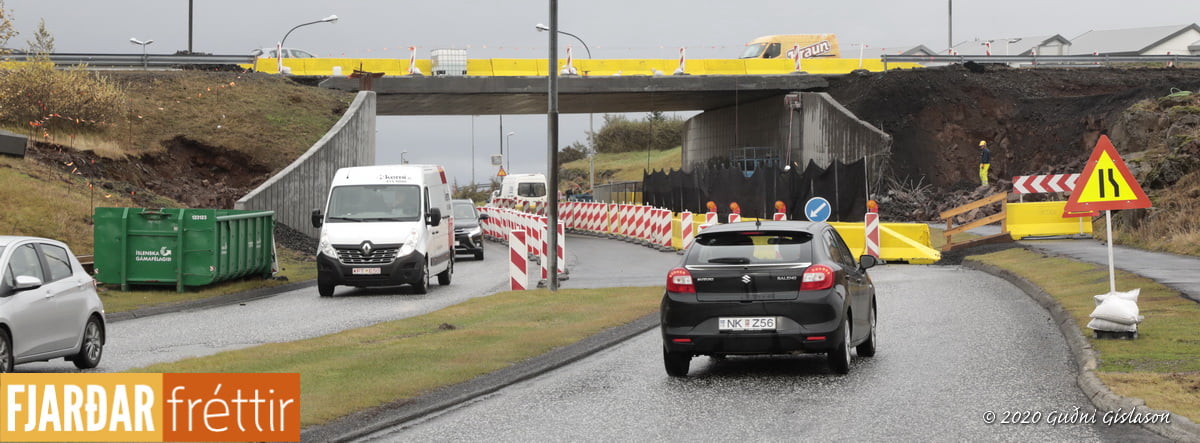 Þarna er vinna við breikkun brúarinnar nýhafin.