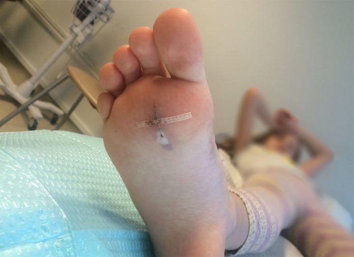 Stúlka fékk djúpan skurð á ilina sem tekur tíma að gróa og veldur því að dagarnir hafa ekki verið alveg eins skemmtilegir eins og þeir hefðu getað orðið.
