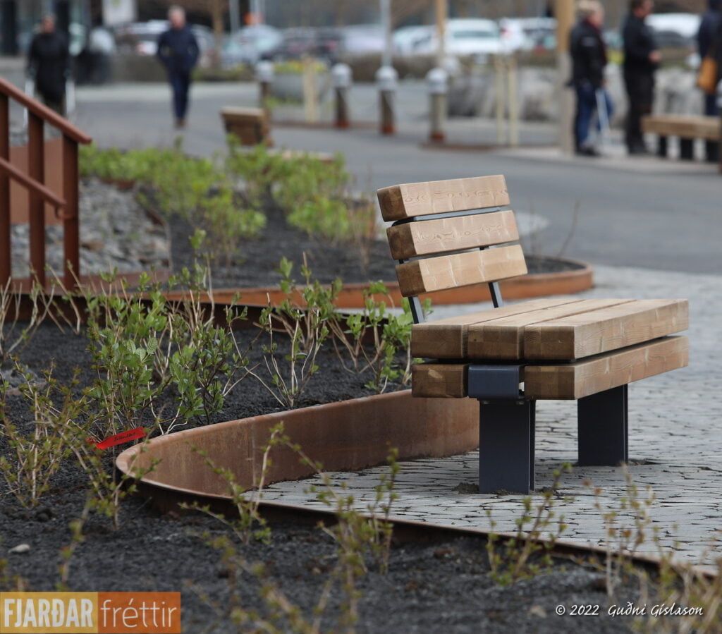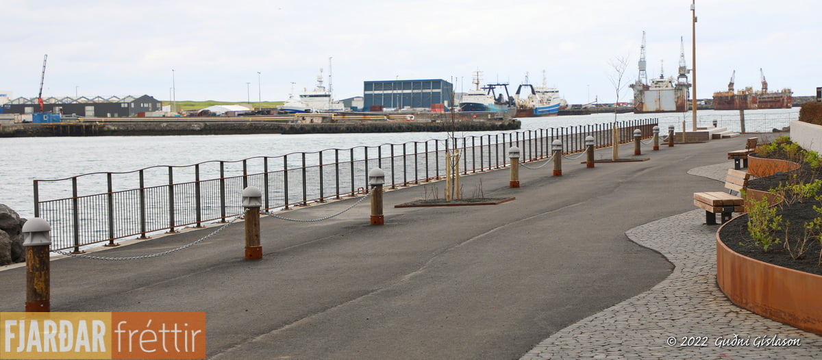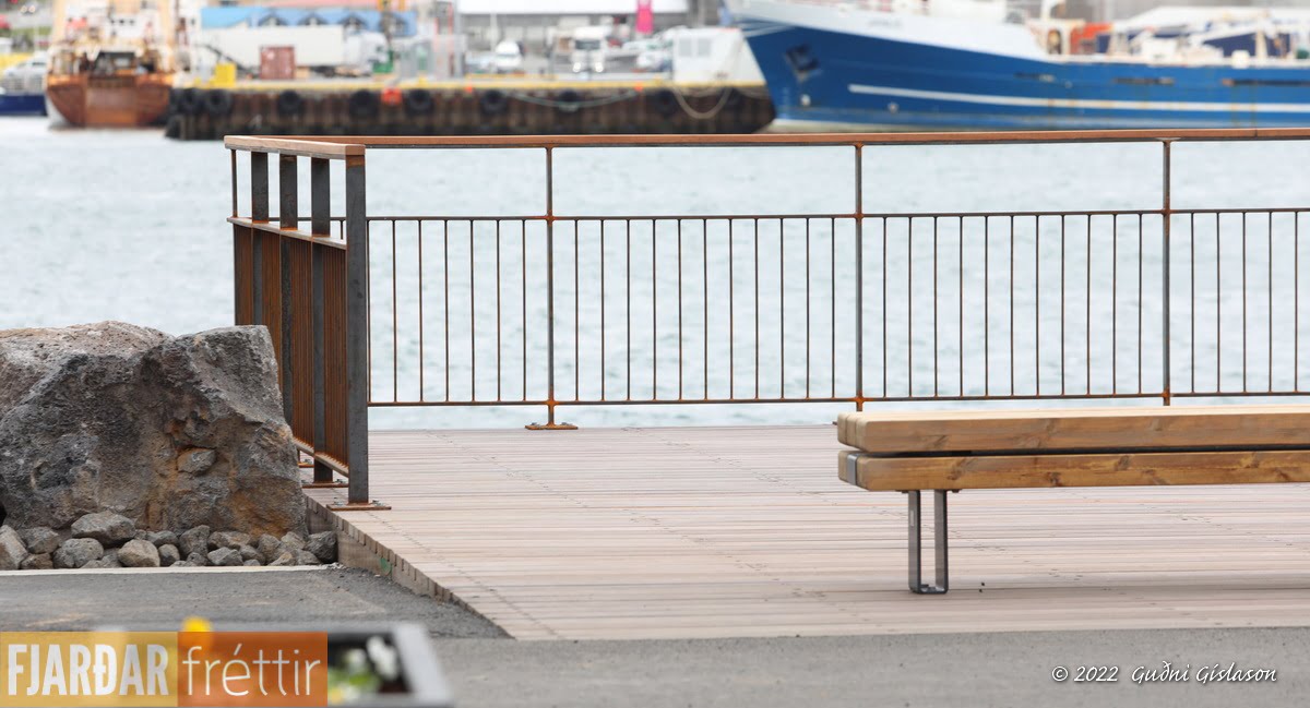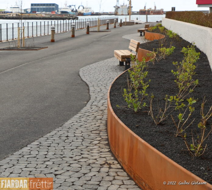 Bekkjum hefur verið komið fyrir og er mikið notað sk. cortenstál sem er stál með ryðáferð sem minnir óneitanlega á rússnesku togarana sem enn eru í höfninni þrátt fyrir allar refsiaðgerðir gegn Rússum vegna innrásarinnar í Úkraínu.