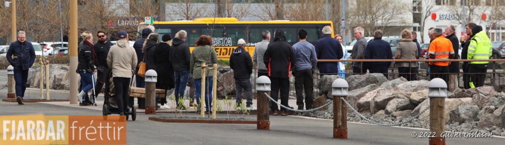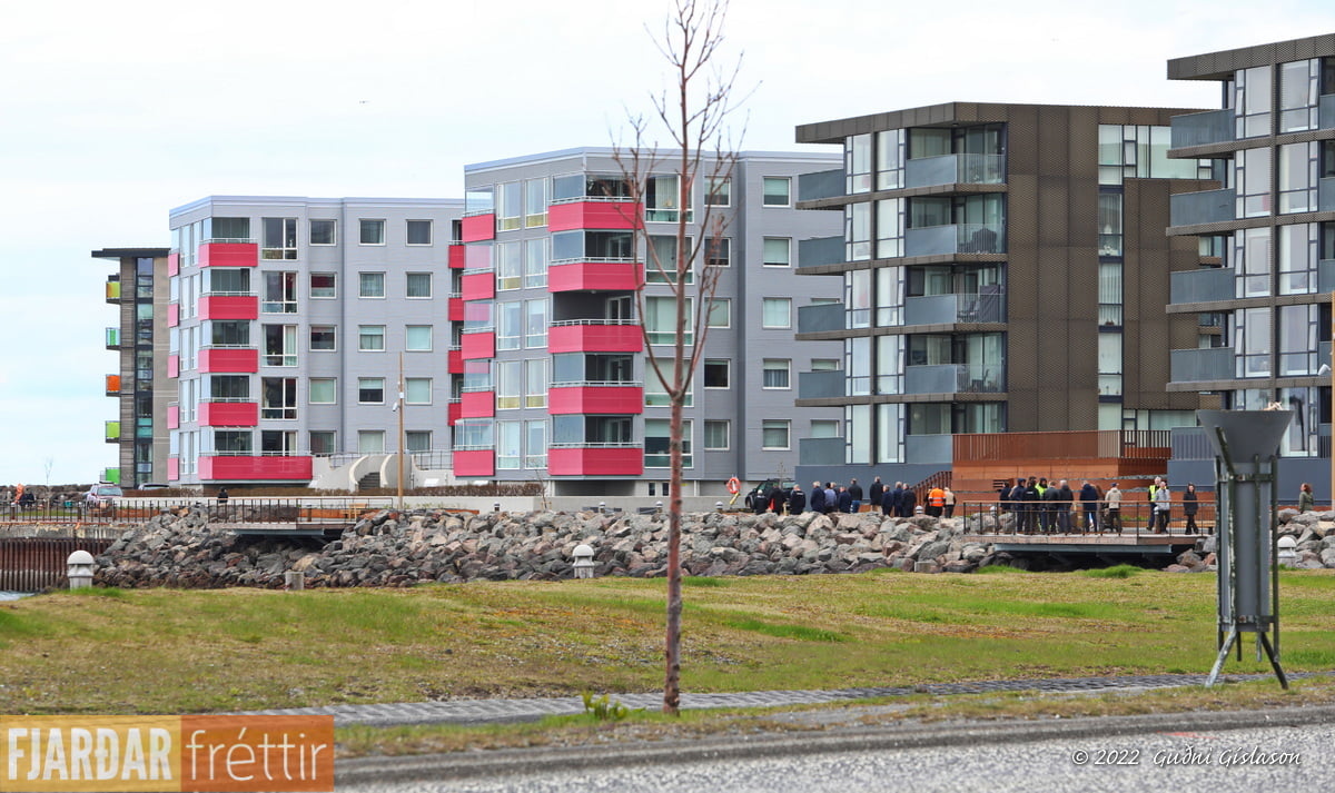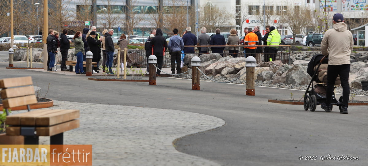 Það sást til bæjarfulltrúa, starfsmanna bæjarins og verktaka á Norðurbakkanum í hádeginu í dag þegar þeir komu saman og fögnuðu því að yfirborðsfrágangi á Norðurbakka væri lokið.